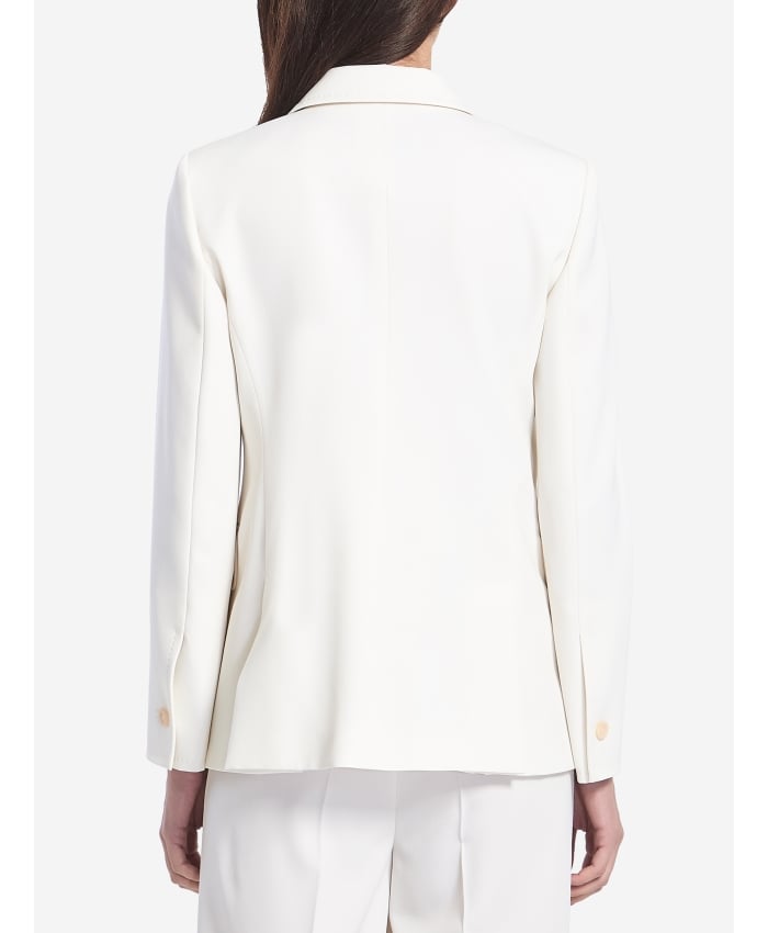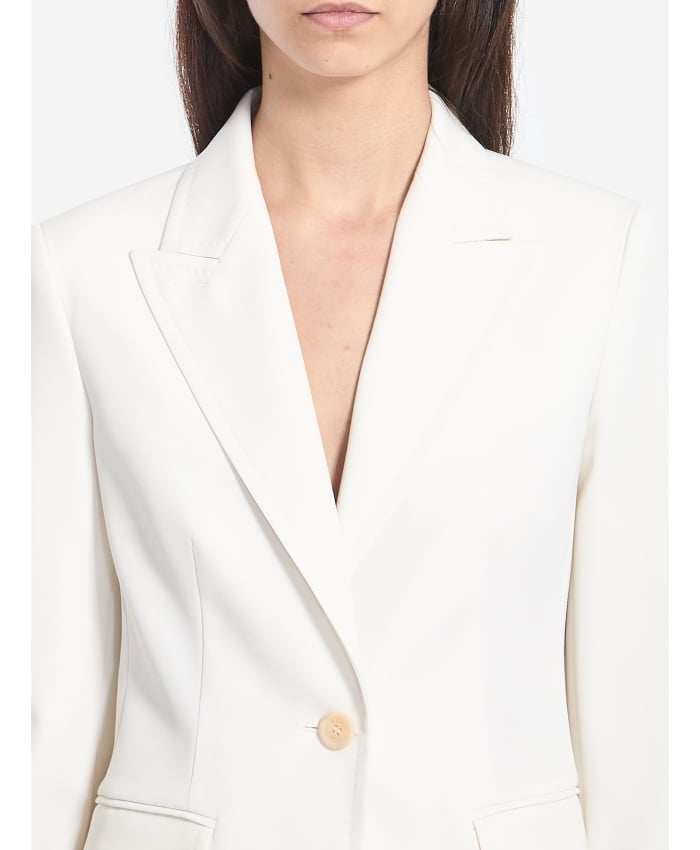 White wool single-breasted jacket. It features pointed lapels, a classic one-button closure, two front pockets with flaps, buttoned cuffs, and two