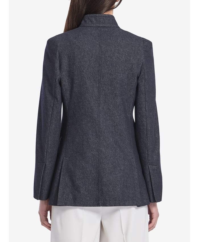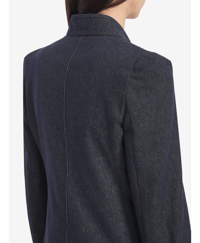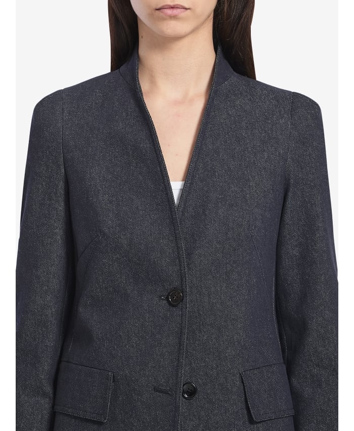 Slim-fit single-breasted blazer in midnight blue denim-effect cotton. It features a notched collar, single-breasted closure with two buttons, two