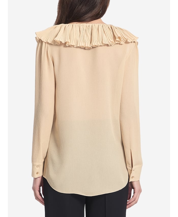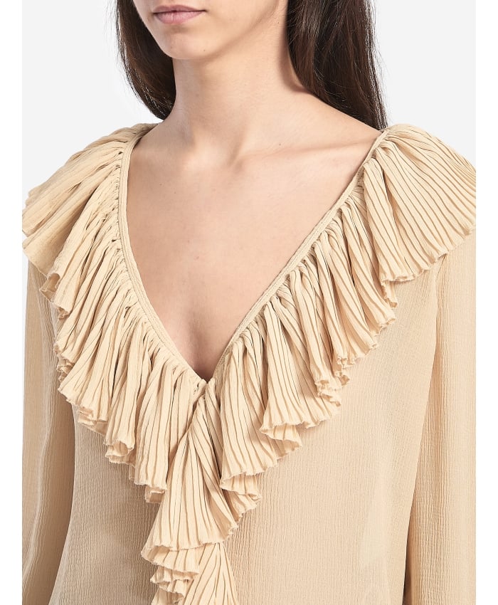 Beige semi-transparent silk crepe muslin ruffled blouse. It features a deep V-neck, pleated ruffled collar and front, button closure at the front,