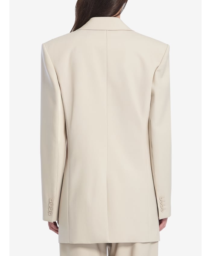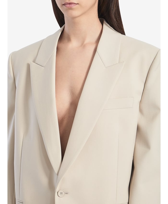 Beige lightweight wool single-breasted jacket. It features lance-shaped lapels, a single-breasted button closure, a piped chest pocket, two front