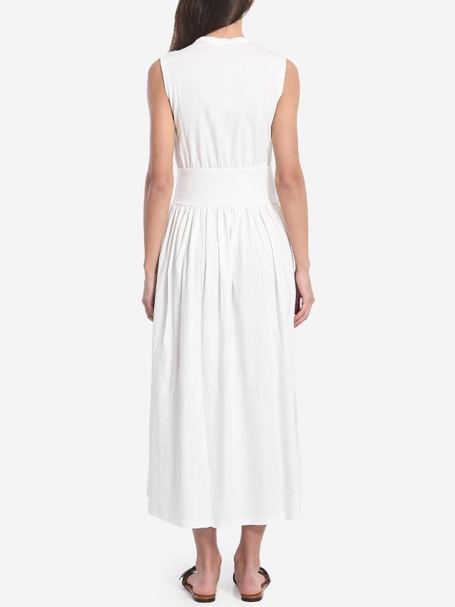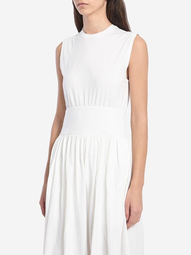 White cotton jersey sleeveless midi dress with a crew neckline. It features a fitted waist panel, two side pockets, and a calf-length skirt.The model