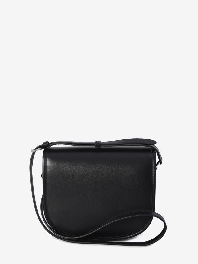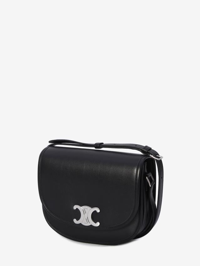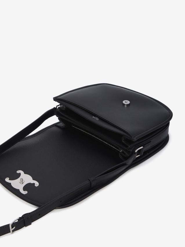 Black calfskin Triomphe shoulder bag. It features a flap with a silver-tone Triomphe metal clasp and a snap button closure, an adjustable leather
