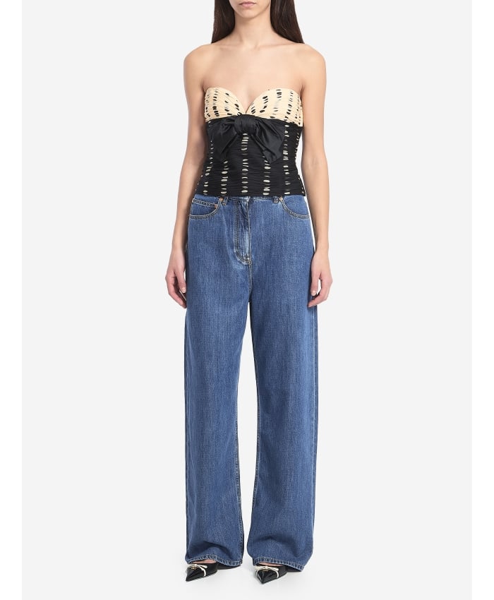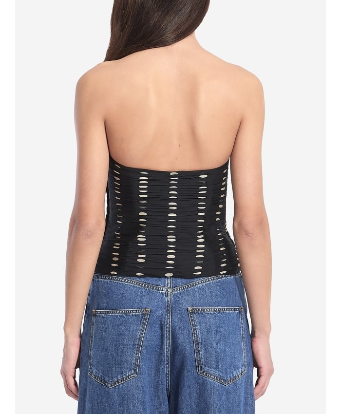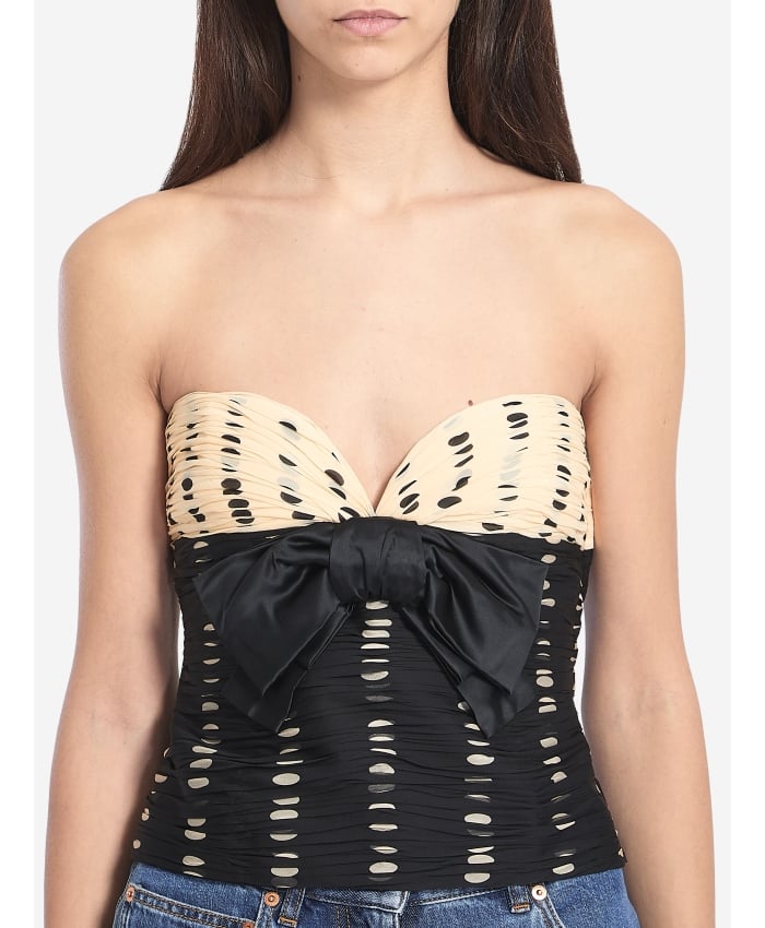 Black and white silk chiffon sleeveless top with Plusdepois print. It features a sweetheart neckline with a contrasting white bodice adorned with