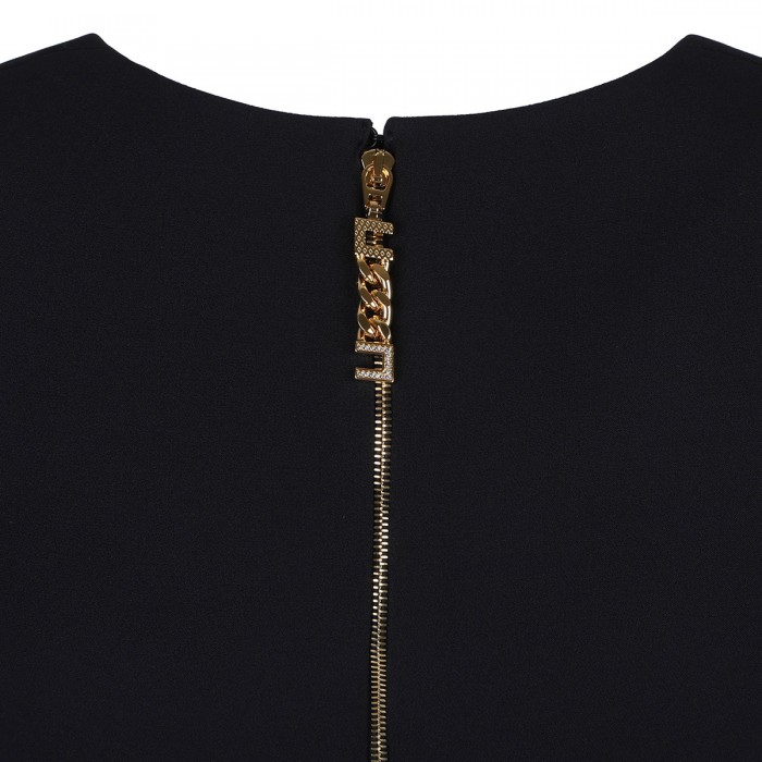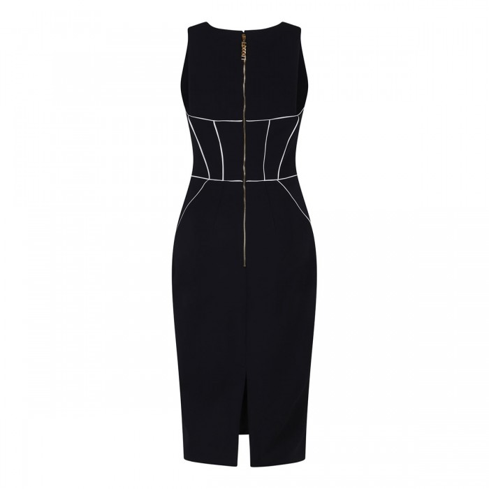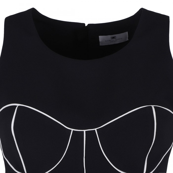 Black stretch crepe midi dress from Elisabetta Franchi featuring contrasting piping details recreate a bustier with a trompe-l'oeil effect, sheath silhouette, crew collar, sleeveless style, concealed back zip fastening, back slit, knee length.