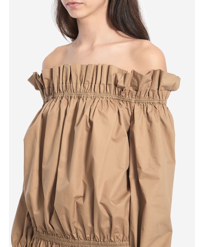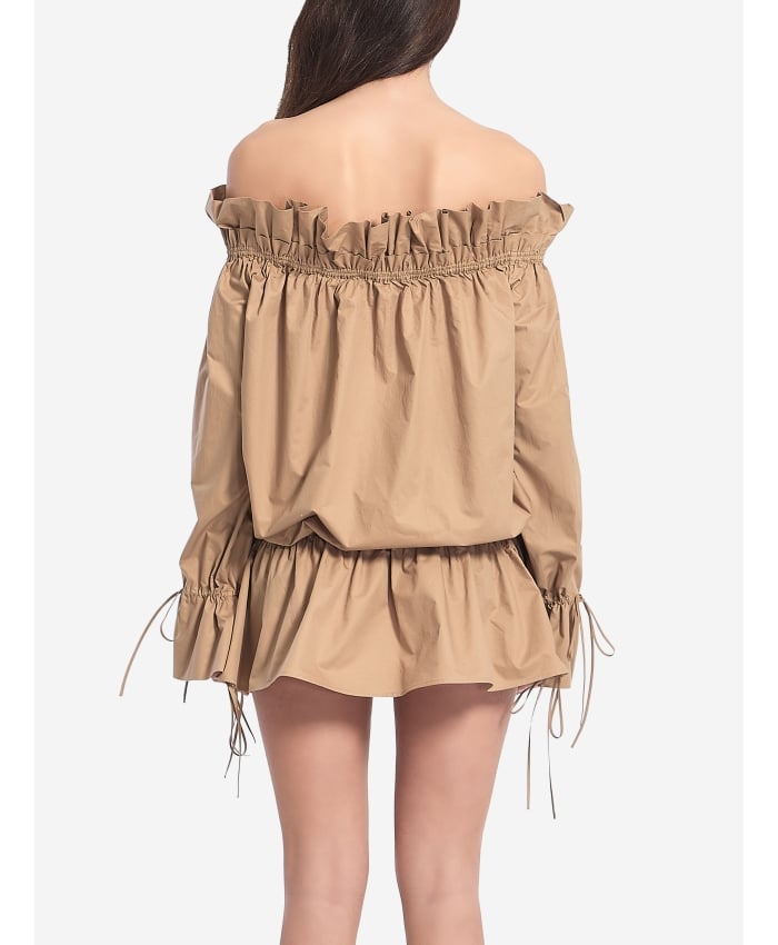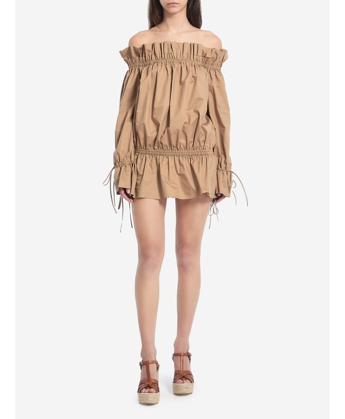 Beige cotton satin off-the-shoulder ruched mini dress. It features a ruched neckline, long poet sleeves with drawstrings, two side pockets, a ruched