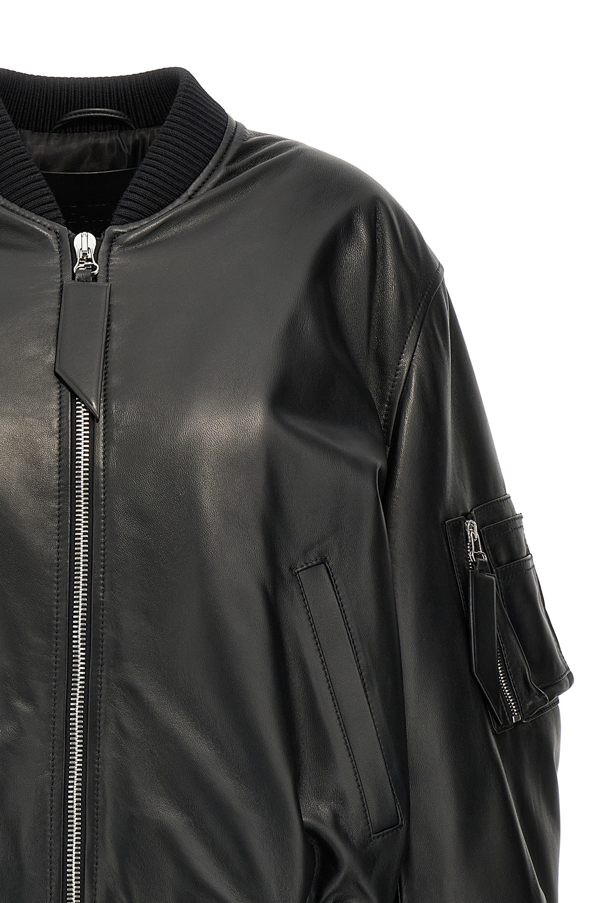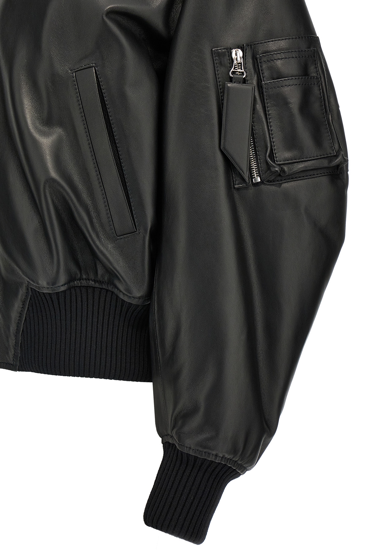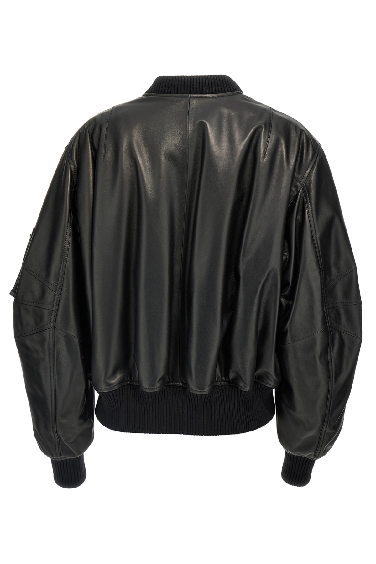 Leather bomber jacket, zip closure, pockets, long sleeves with knitted cuffs.