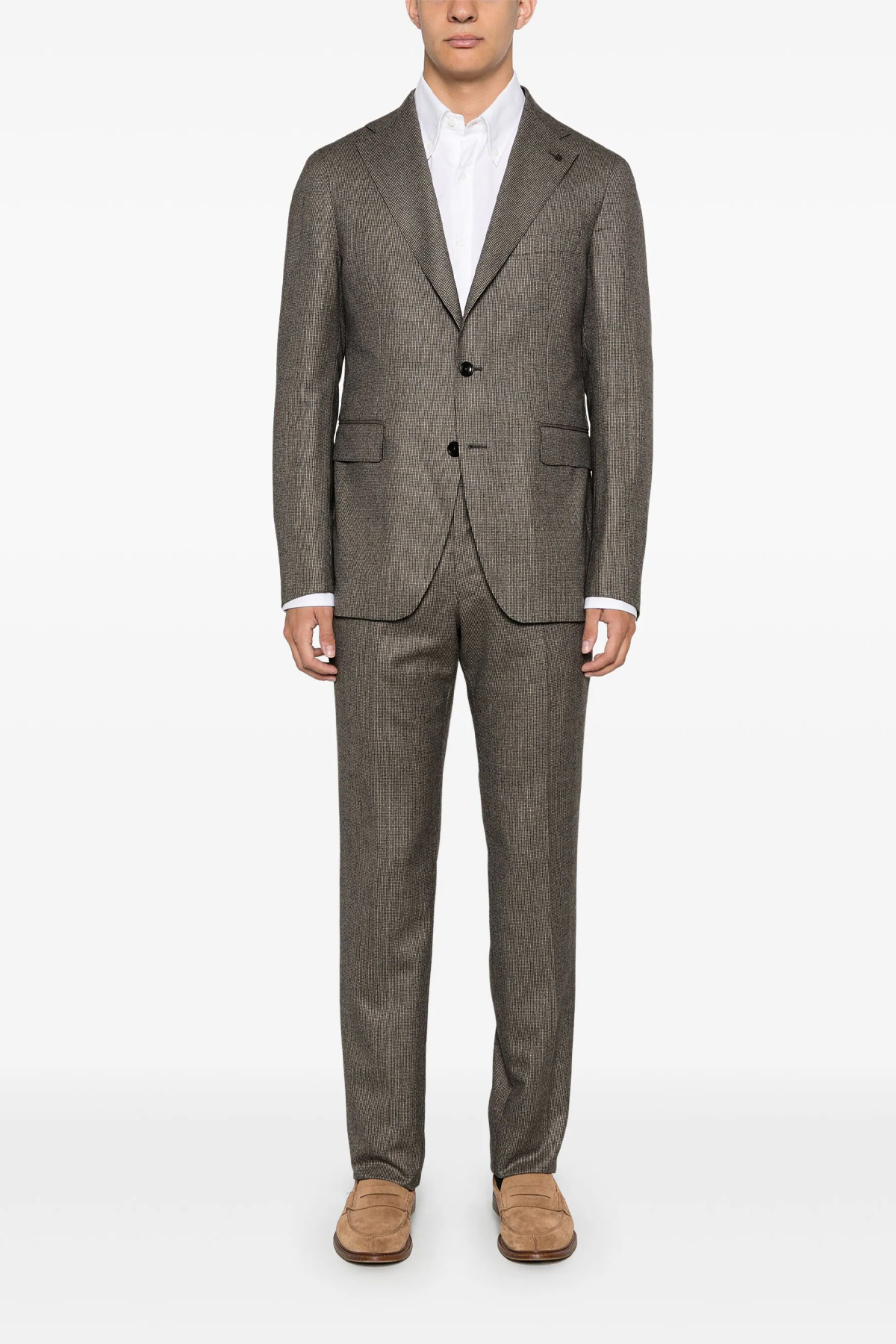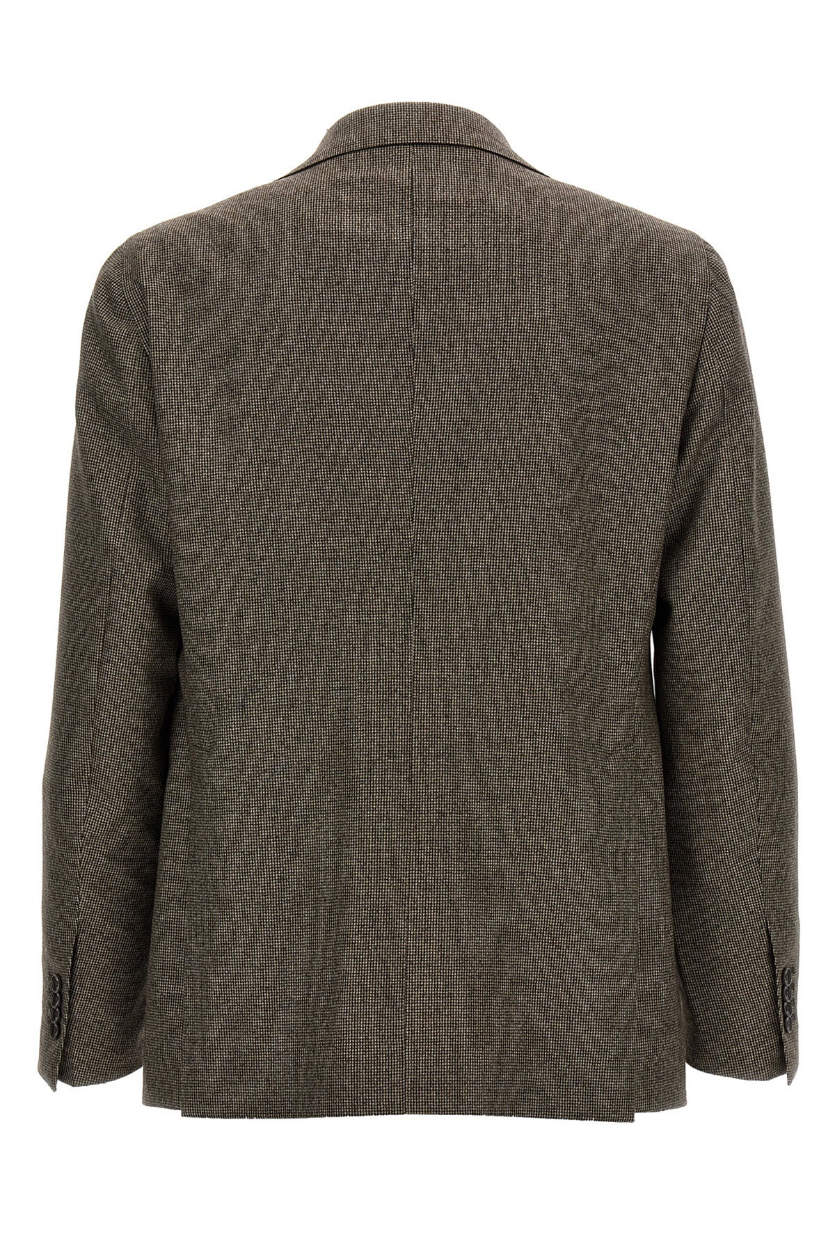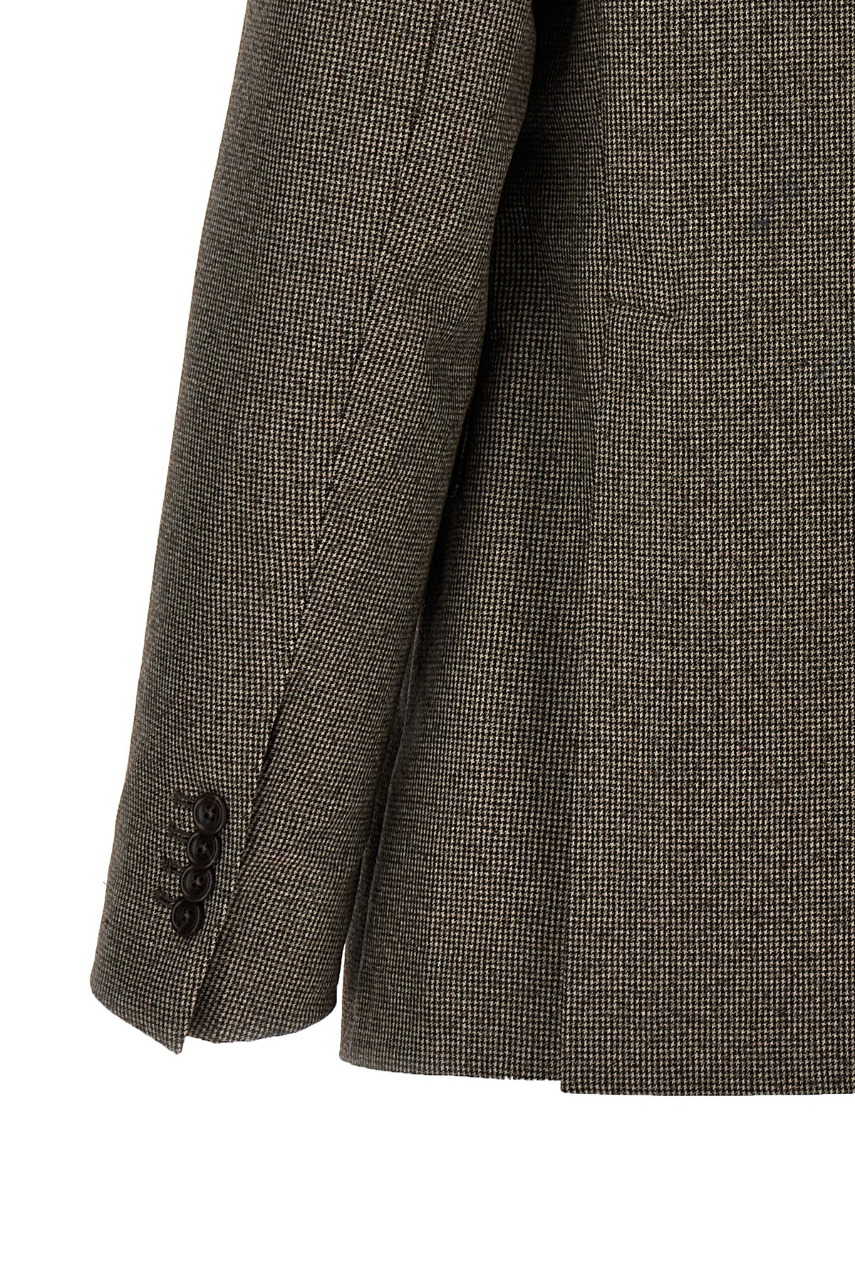 Super 120's virgin wool dress with micro houndstooth pattern, consisting of single-breasted blazer with button closure, pockets, long sleeves and back slits, pants with pence and ironed pleat, zip and button closure, pockets.