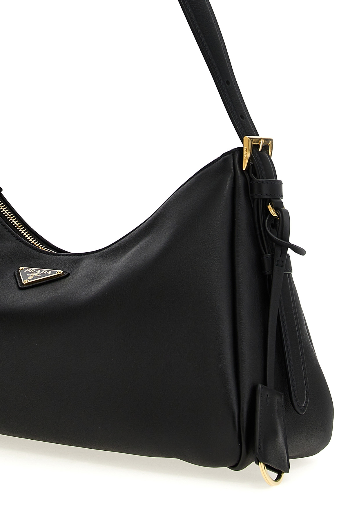 'Prada Aimee' leather shoulder bag, front enameled metal triangle logo, adjustable handle, zip closure, removable leather and metal key ring.