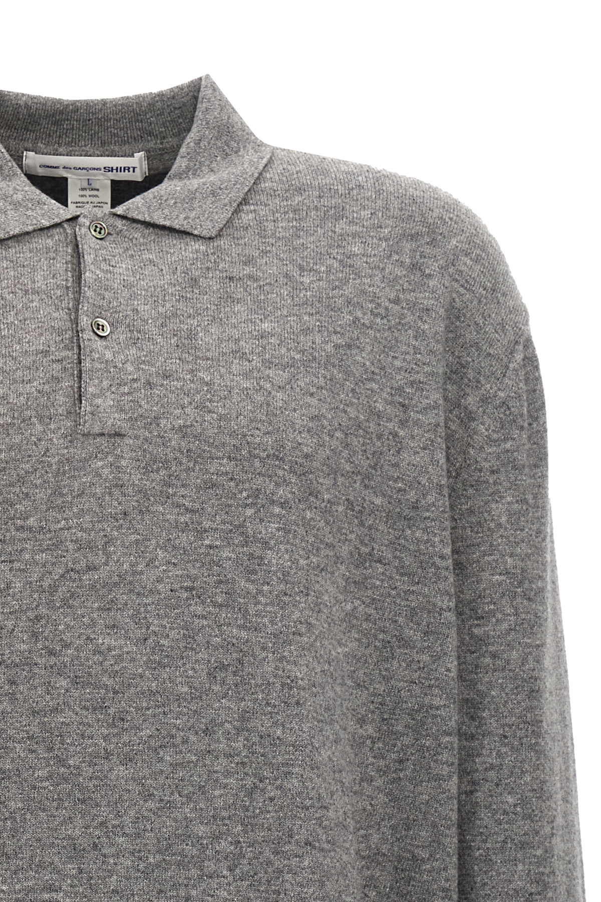 Polo shirt sweater in wool, collar and buttons, long sleeves with cuffs.