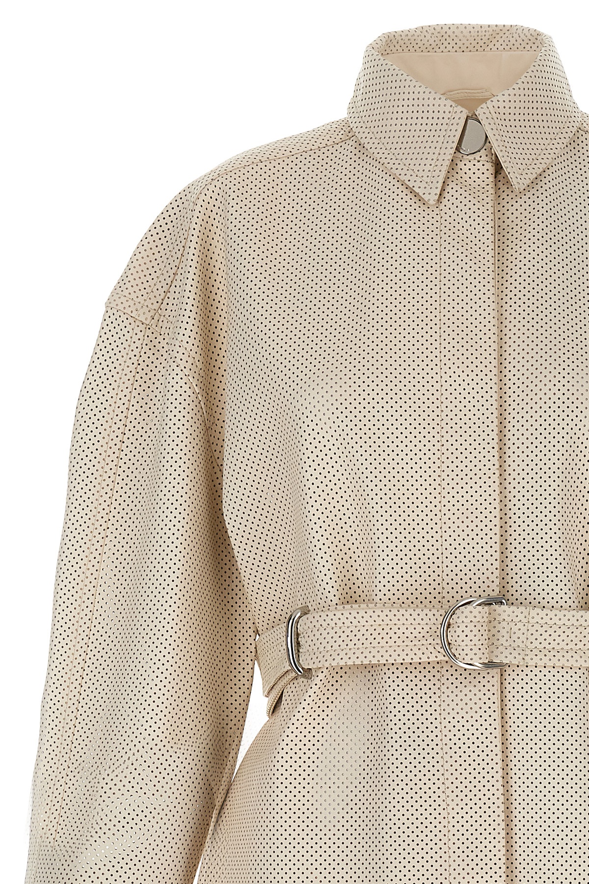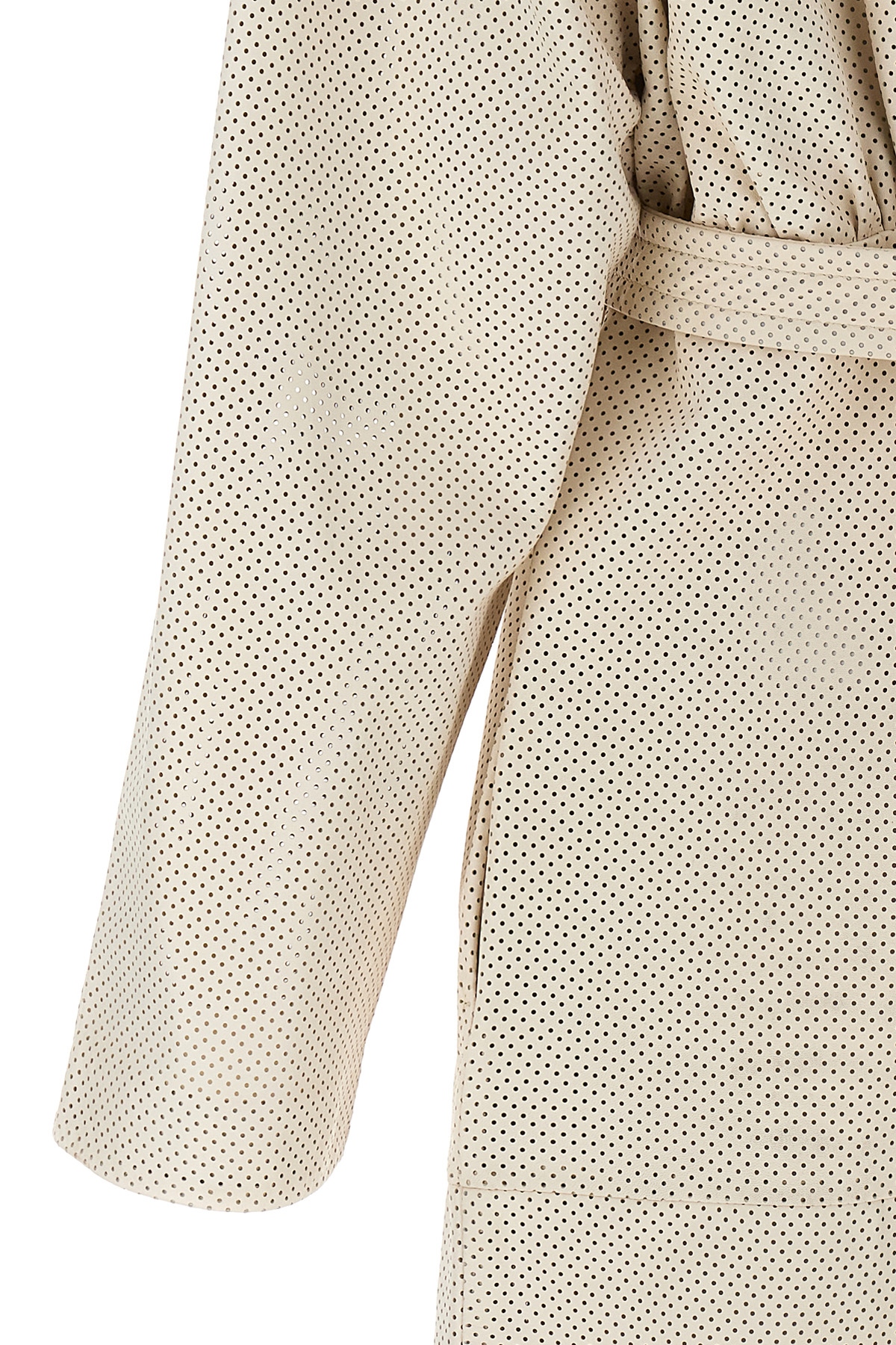 'Antiope1234' long single-breasted perforated leather trench coat with snap button closure, curling and back split, front metal belt loops, unlined, pockets, long sleeves with dropped shoulders, removable matching belt.