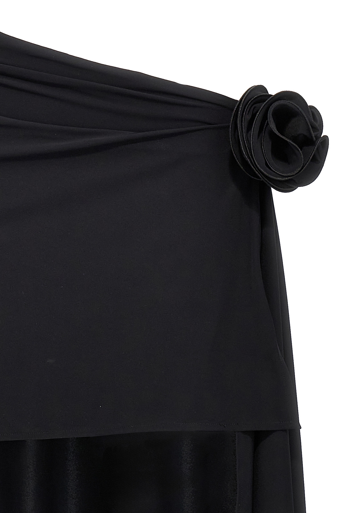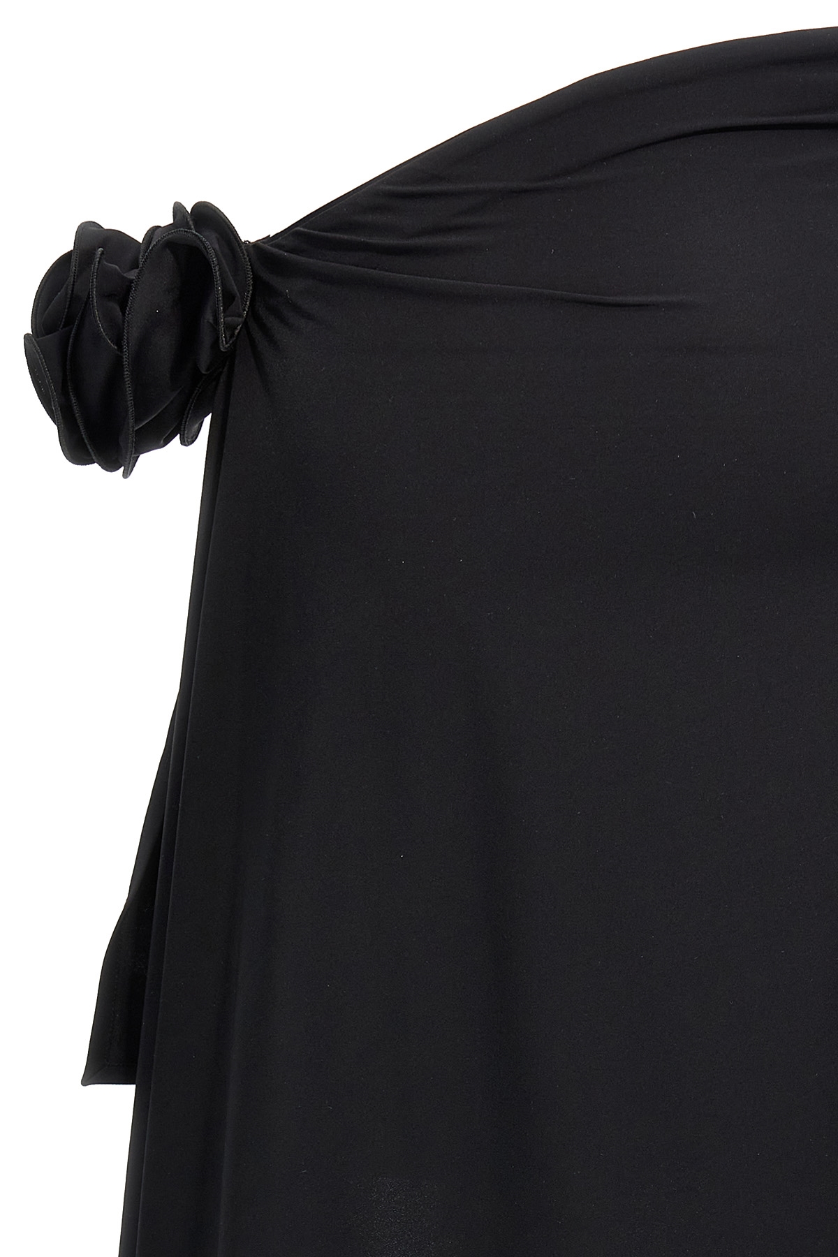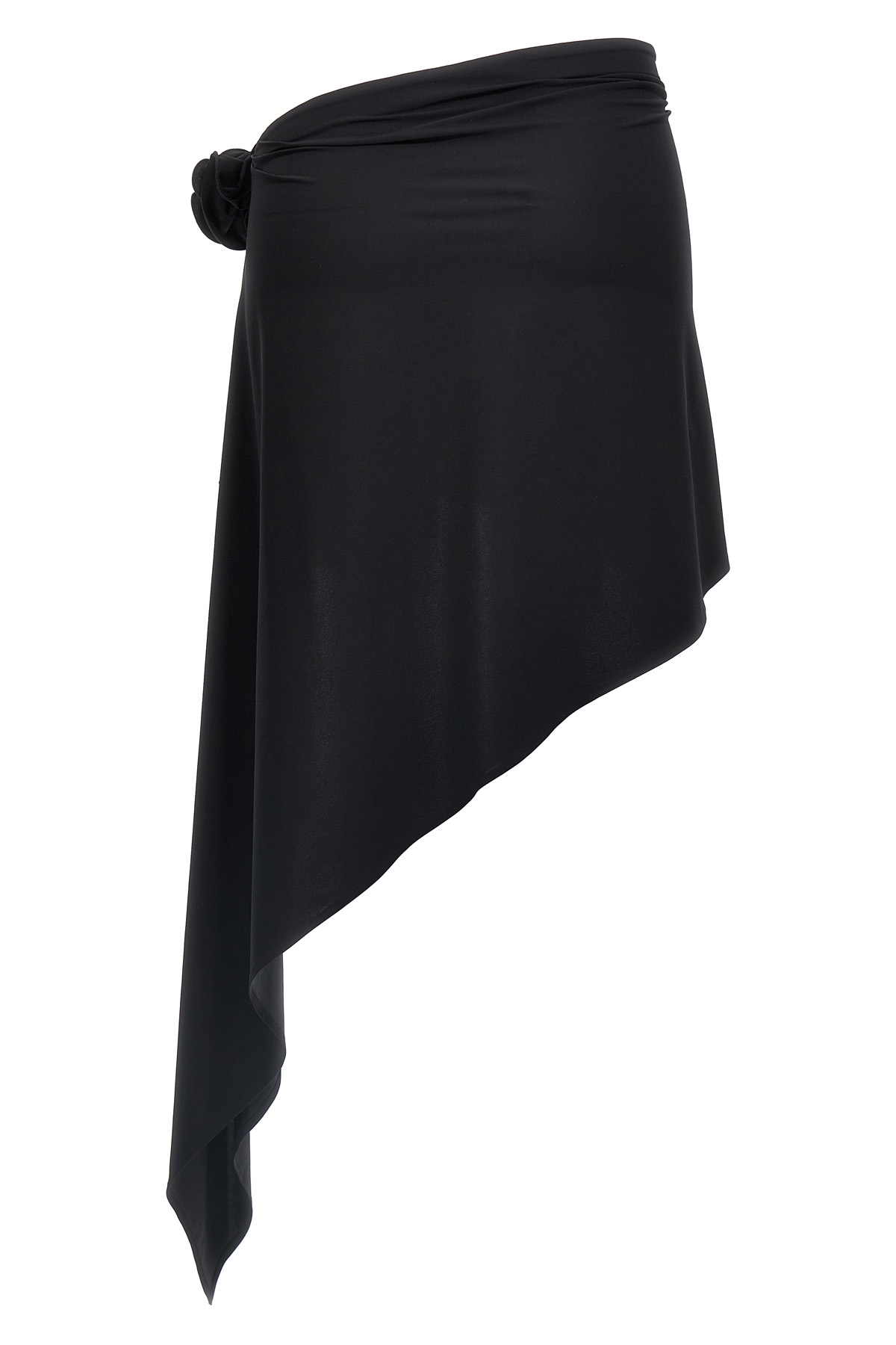 Draped stretch fabric '01' skirt with side maxi flower applique, asymmetrical pattern with side slit and sash, elastic waistband.