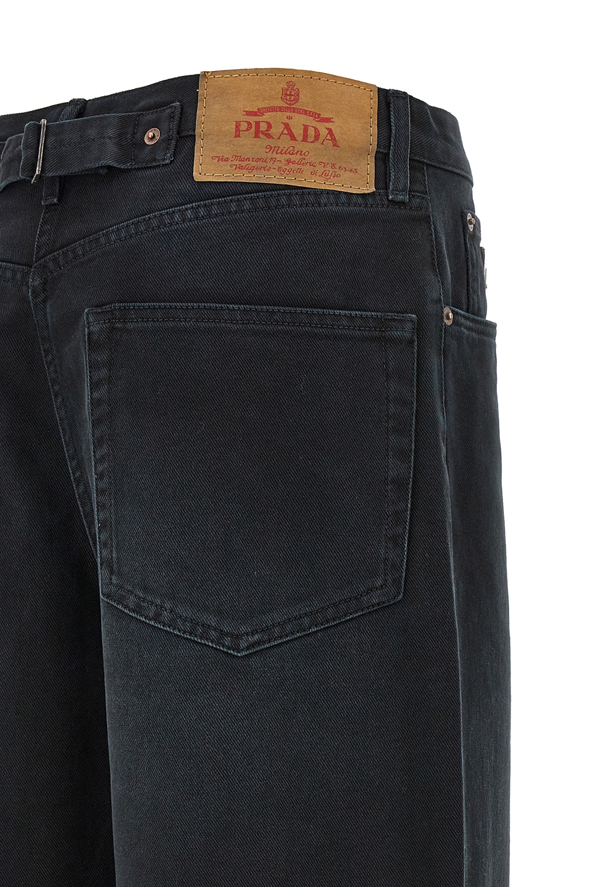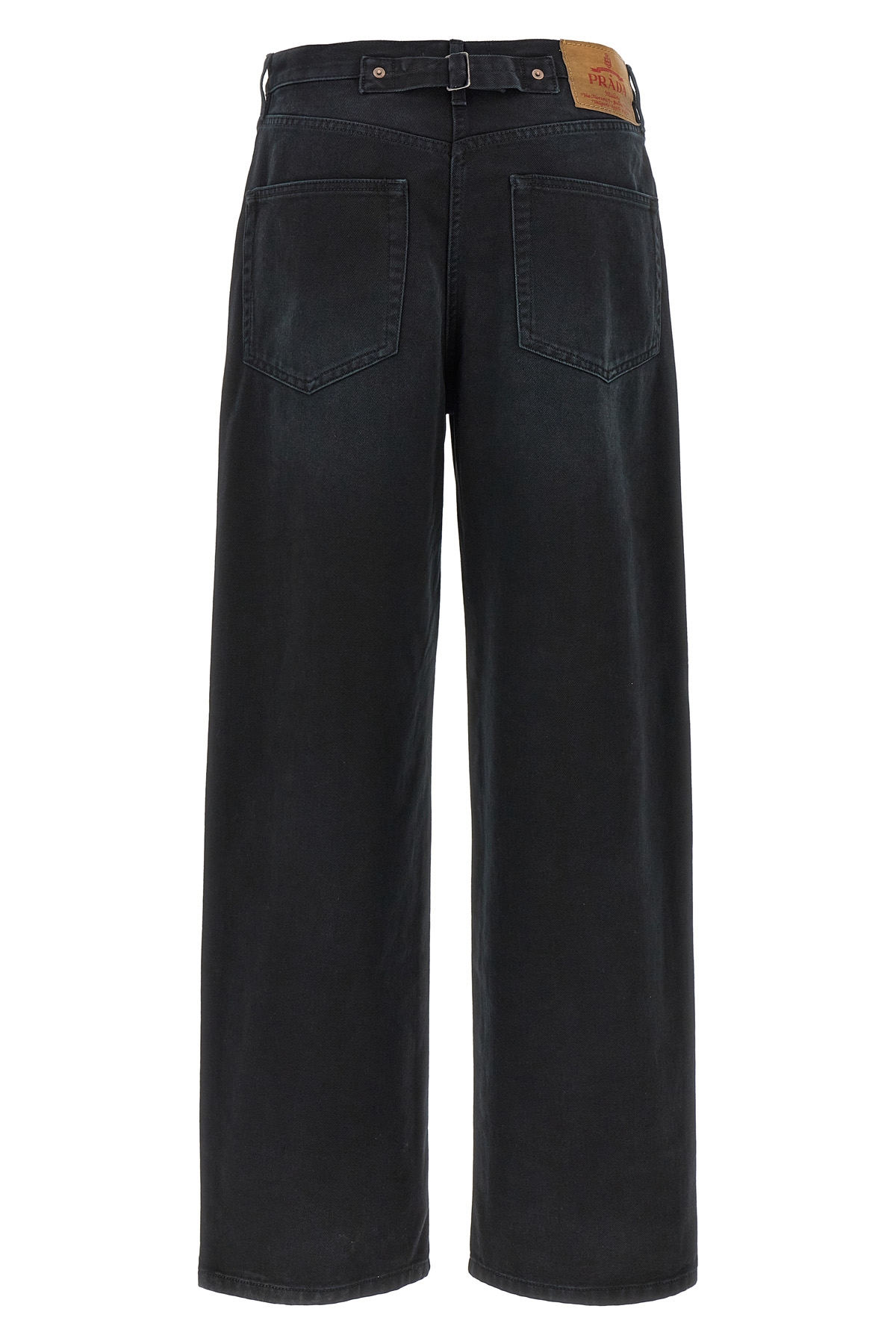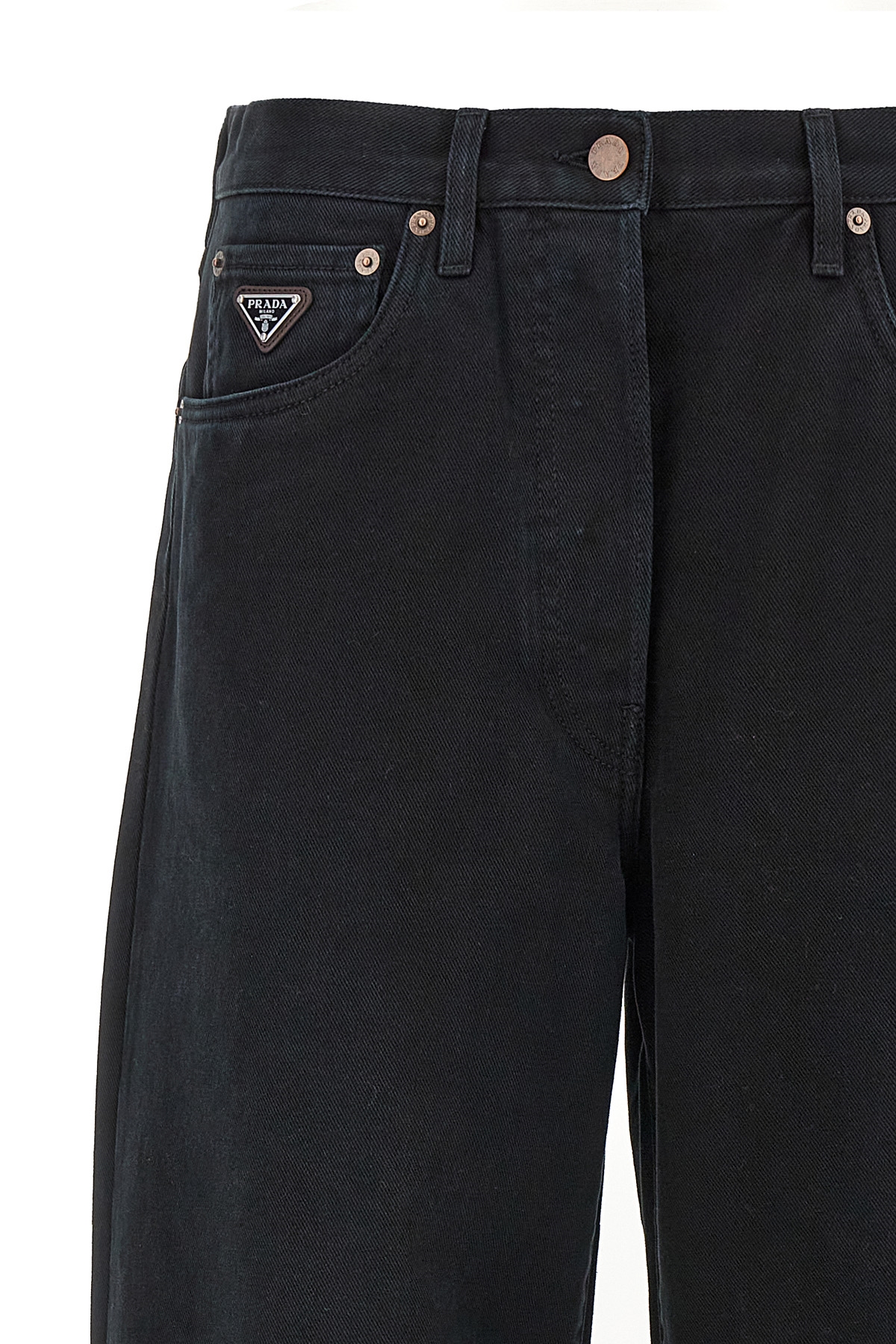 Cotton denim jeans with button closure, five pockets, triangle enameled metal logo applique, adjustable strap at the back of the waist.