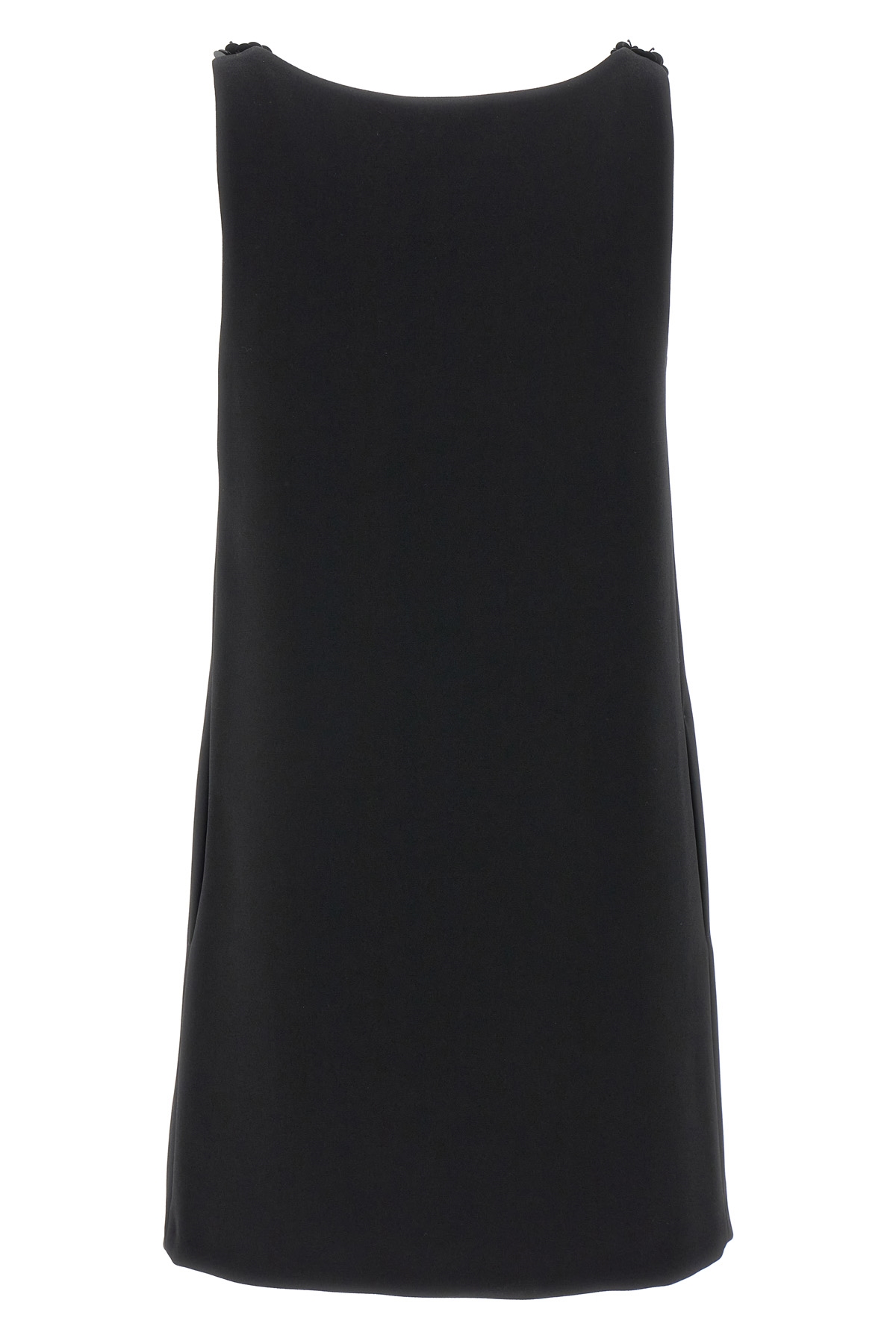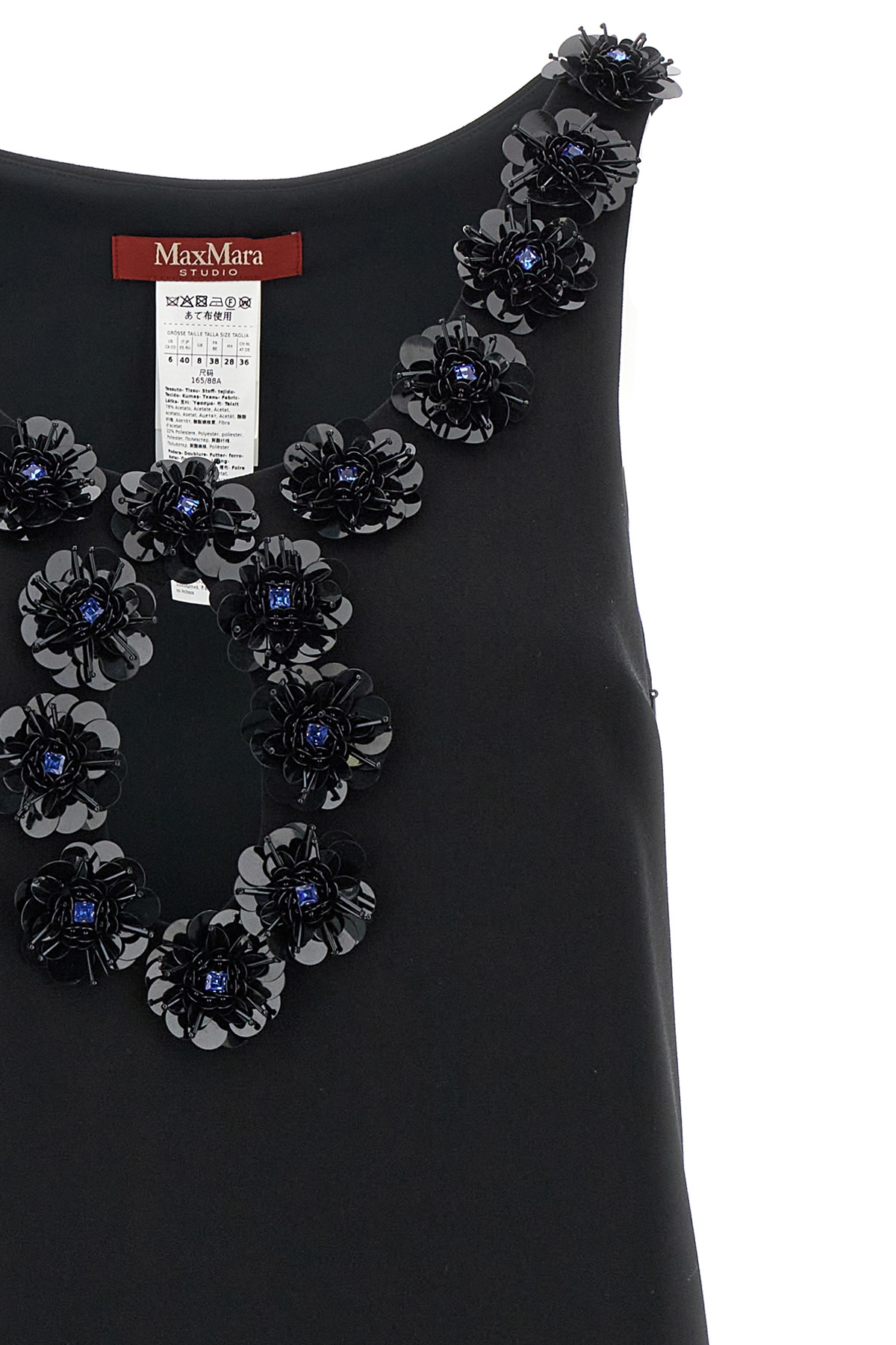 'Delis' flared sable mini dress with front cut-out detail and applique flowers in sequins and front beads, round neckline, lining, side zip closure, pockets.