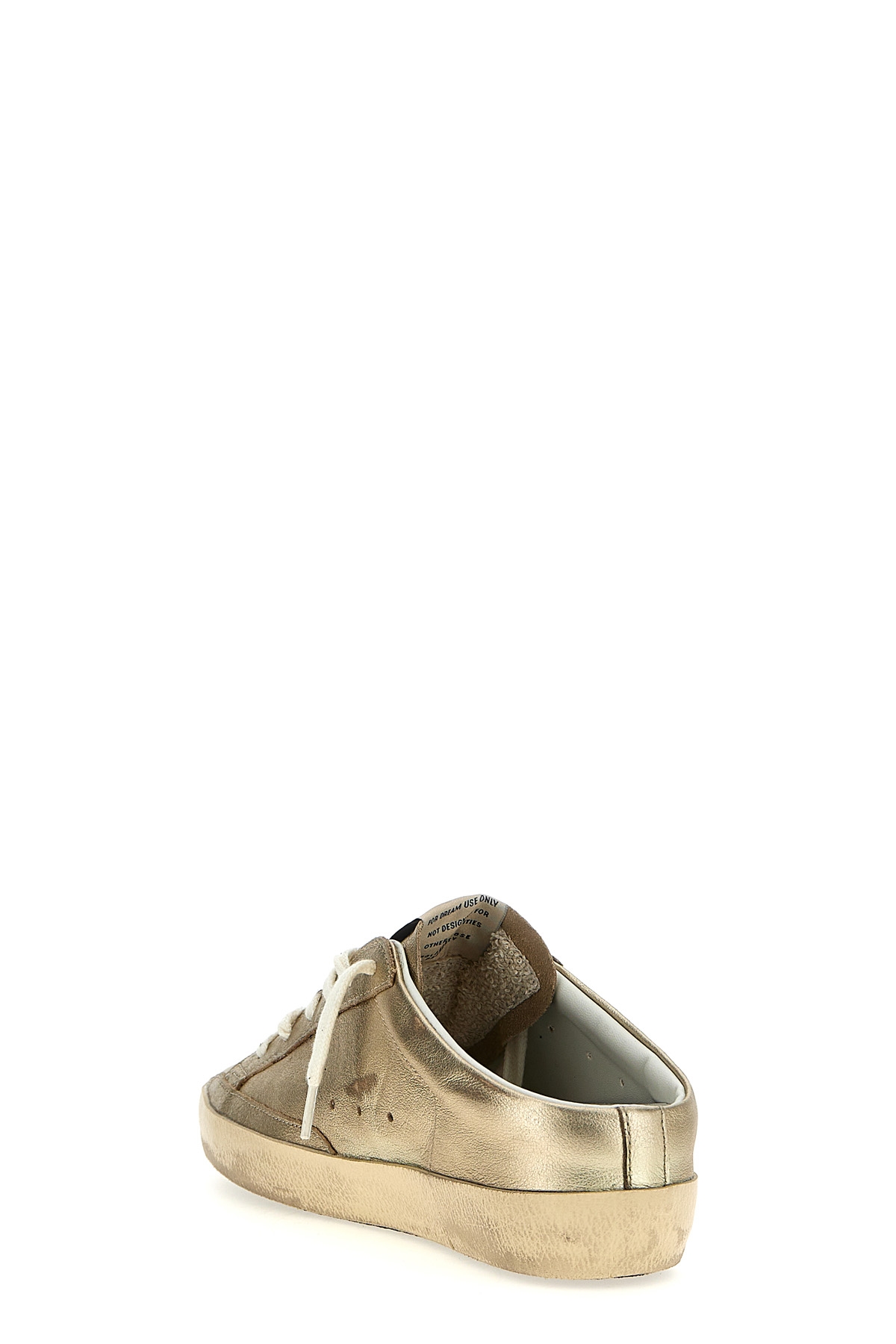 'Superstar' sabots in used-effect metallic leather with contrast star, laces, rubber sole, logo.