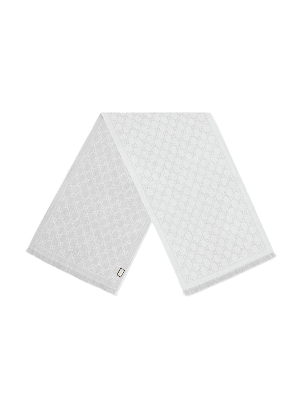 light grey wool knitted construction signature GG Supreme print monogram jacquard rectangle shape wraparound style frayed hem