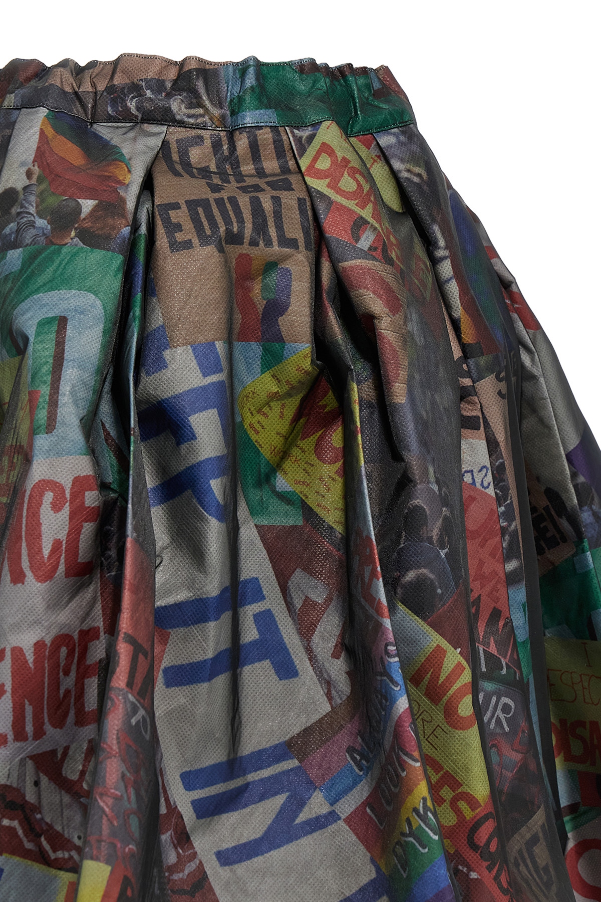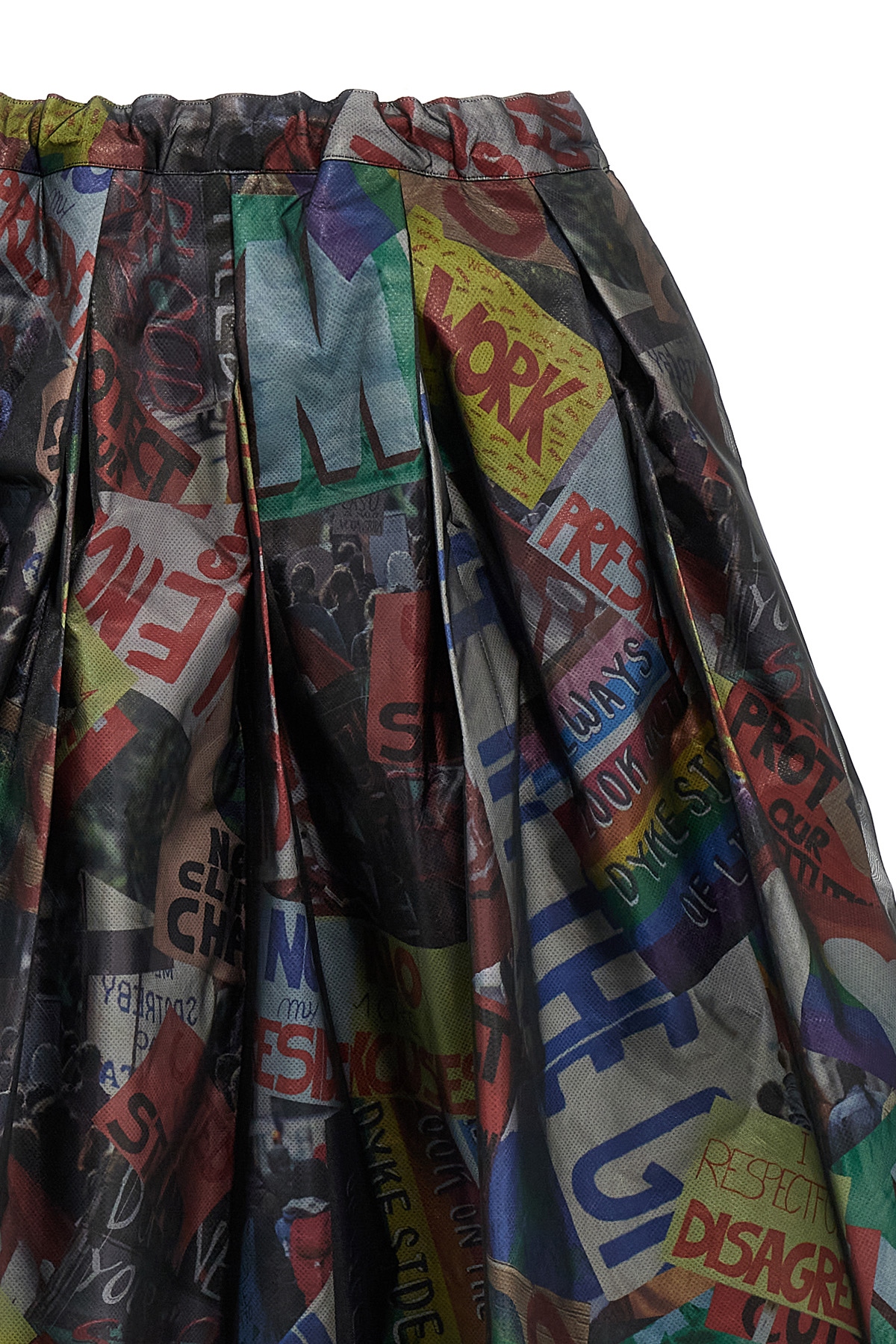 Nylon midi skirt, structured model with overlapping fabrics, elastic waistband, pockets, cupro underskirt.