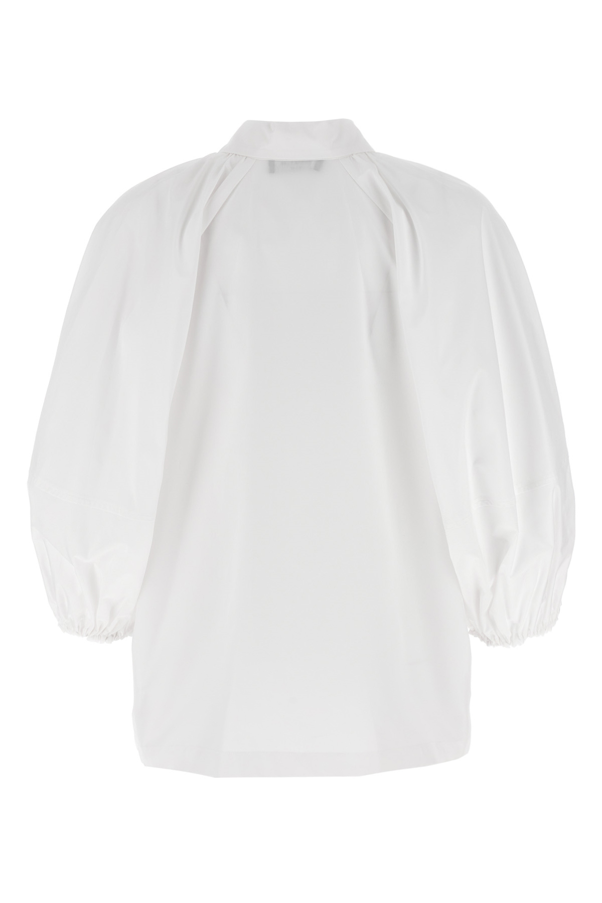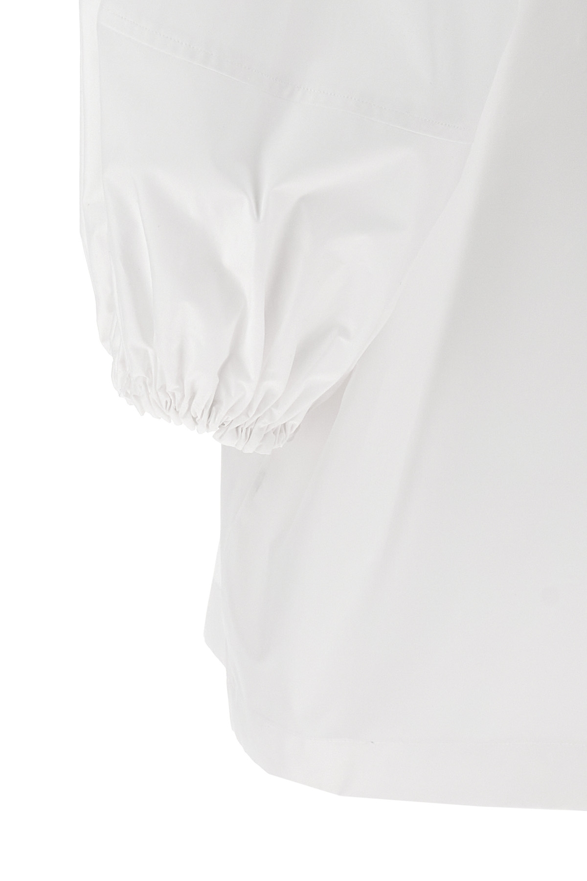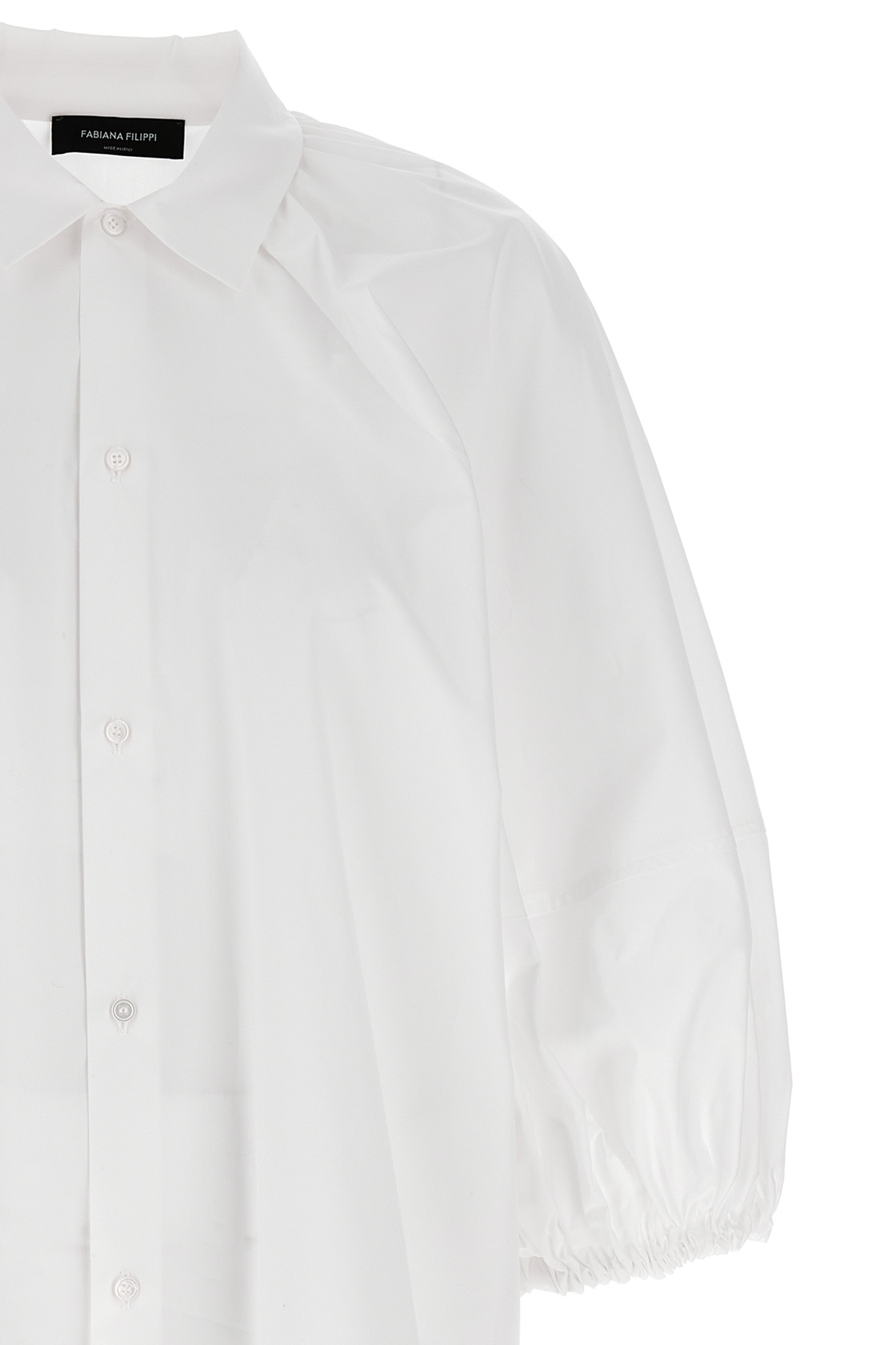 Cotton poplin shirt with front curls, 3/4 balloon sleeves with elastic cuffs, front button closure.