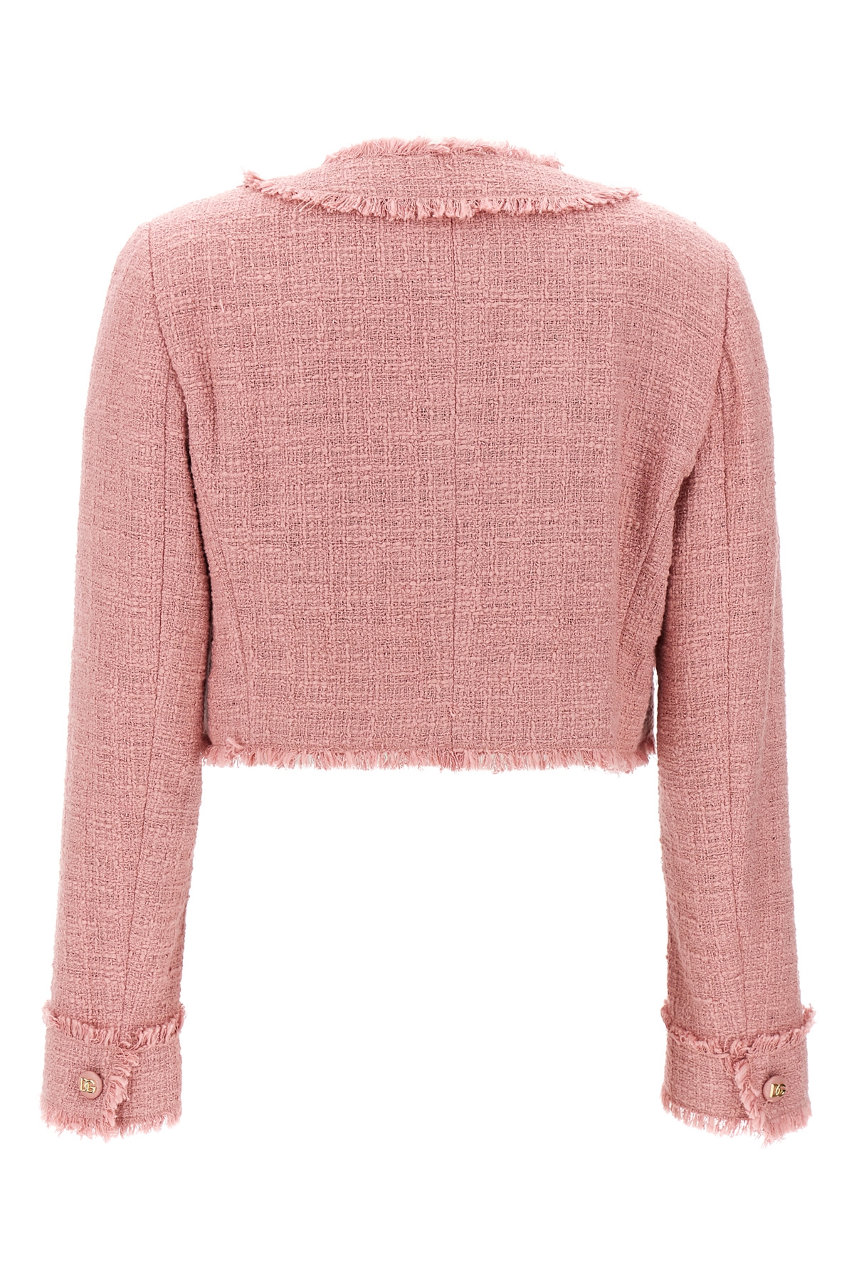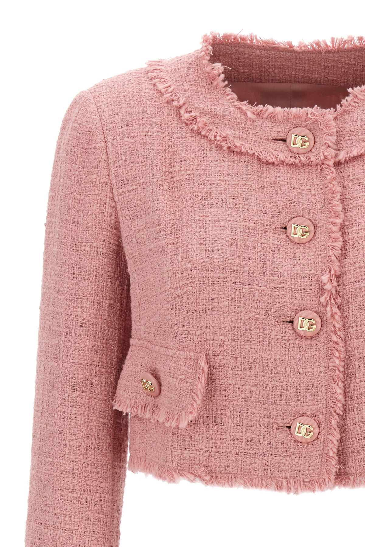 Blazer in cotton 'Rachel' tweed, fringed piping, crop model, button closure with metal logo detail, crew neck, long sleeves, stretch silk crepe de chine lining on tone, pockets.