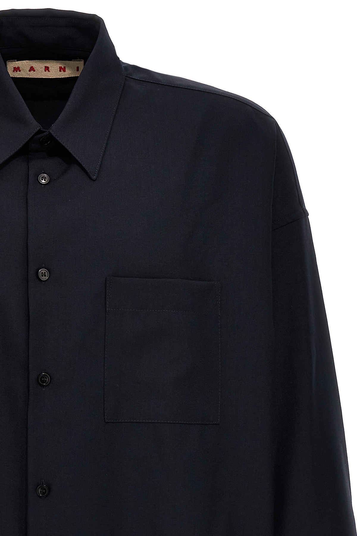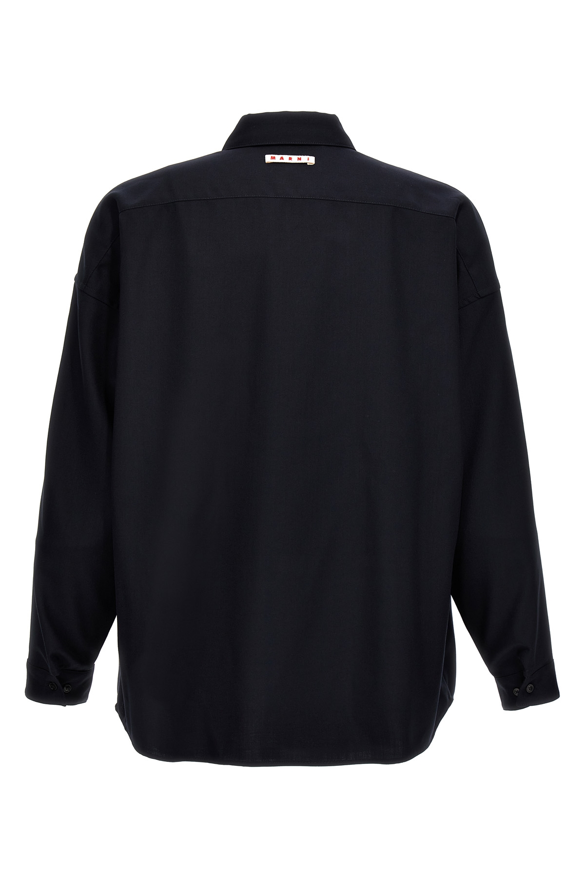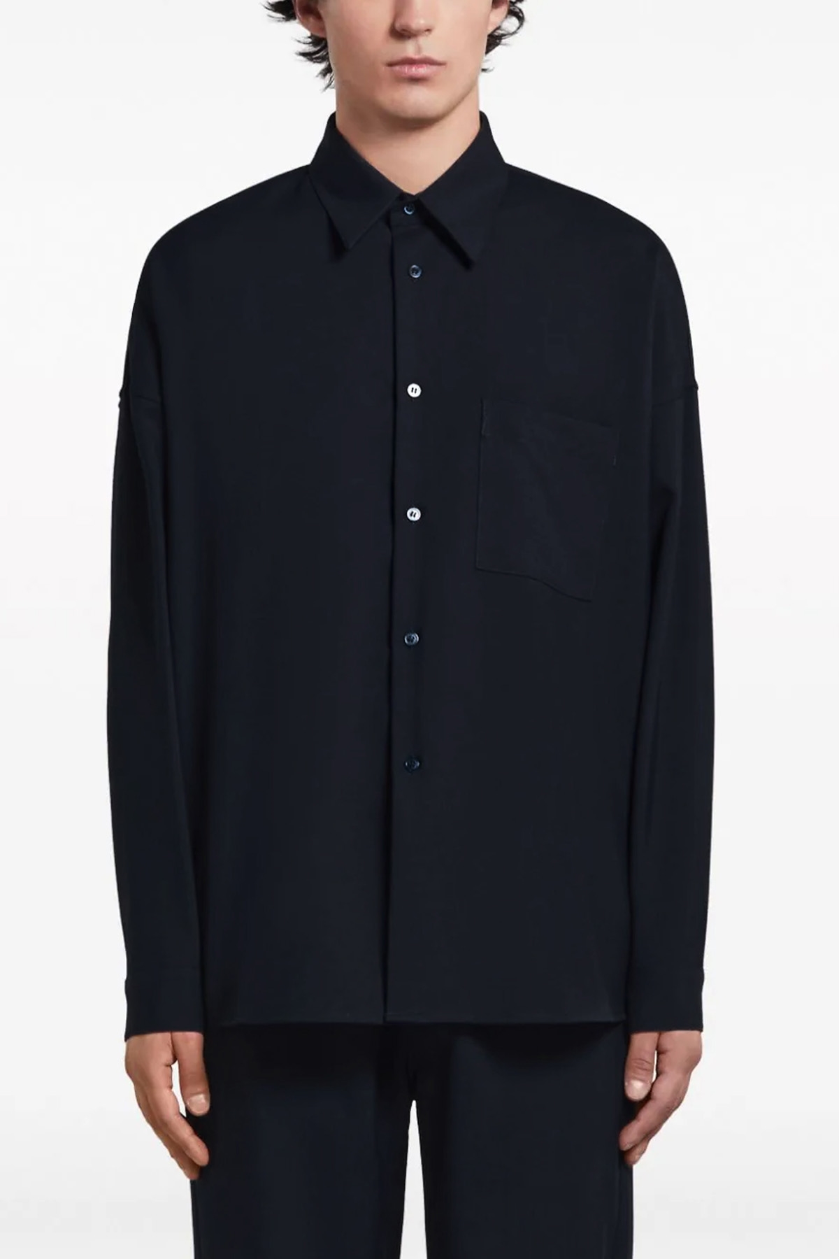 Cool wool shirt with button closure, chest pocket, long cuffed sleeves, back logo label.