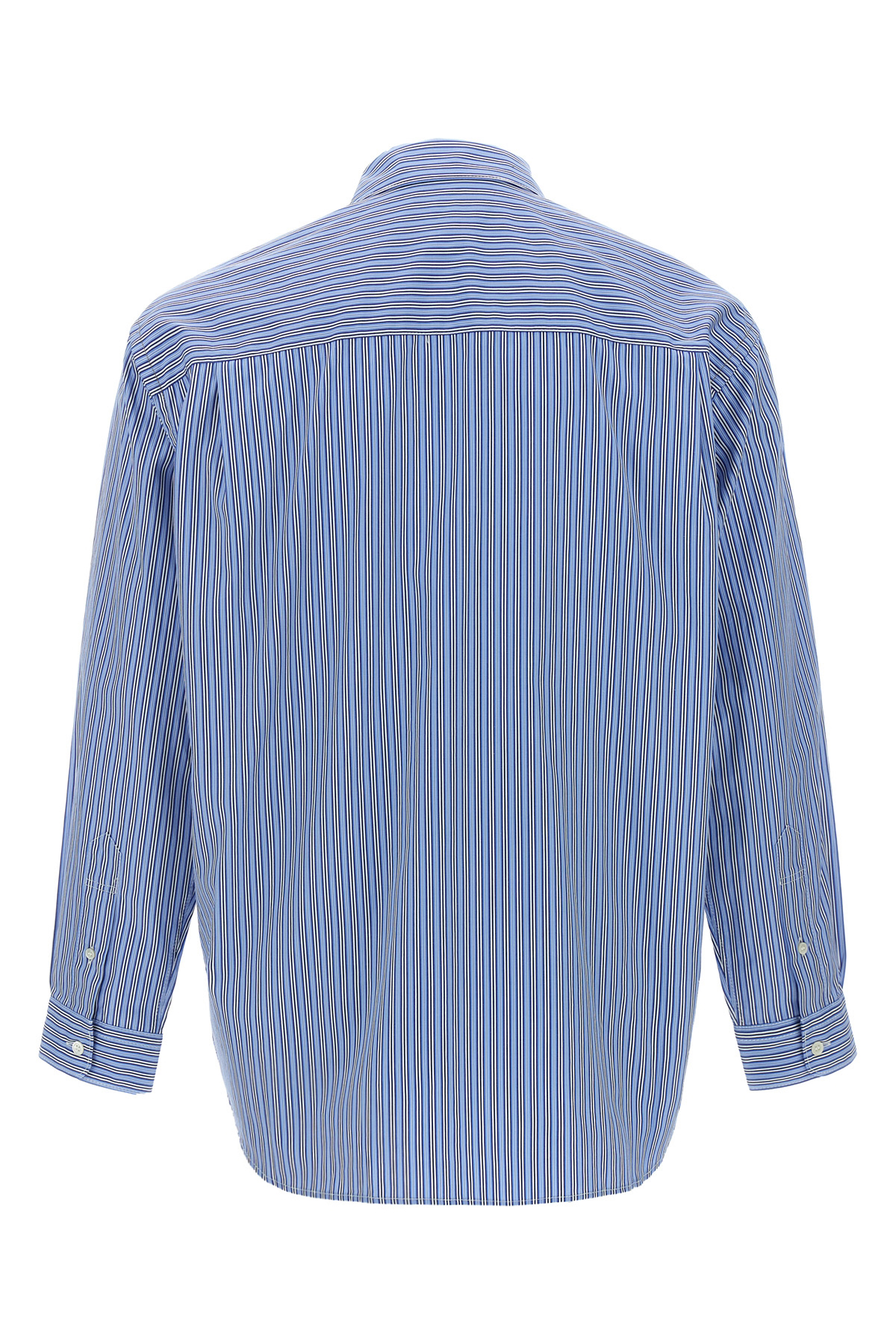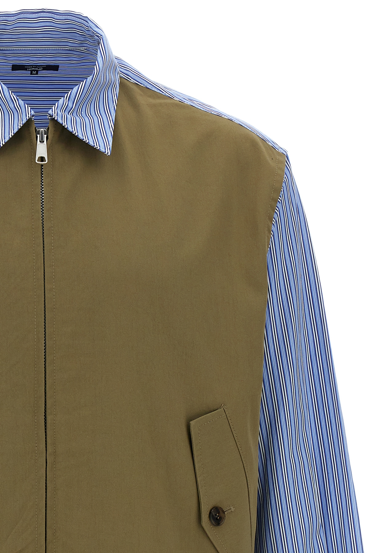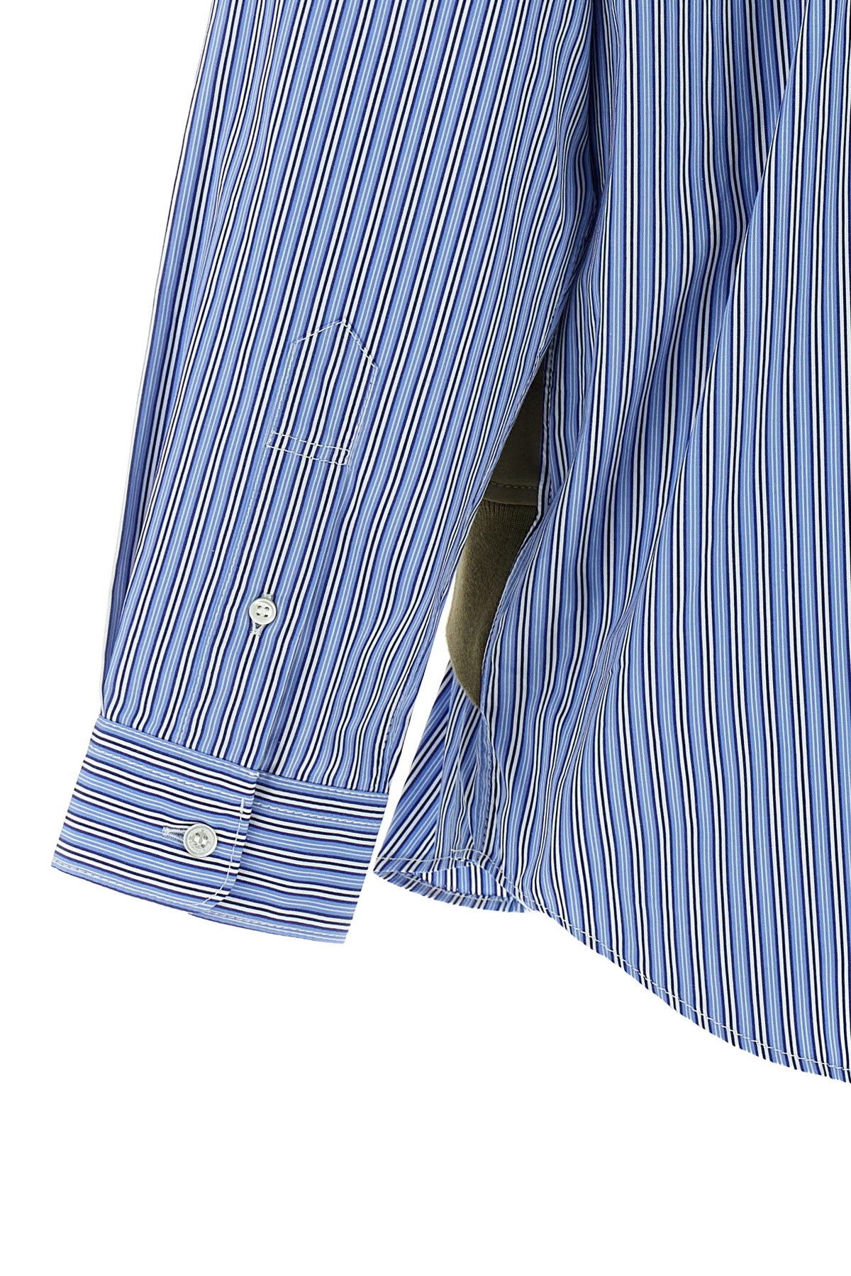 Striped cotton poplin shirt with layered vest insert solid color, zip closure, long cuffed sleeves, pockets.