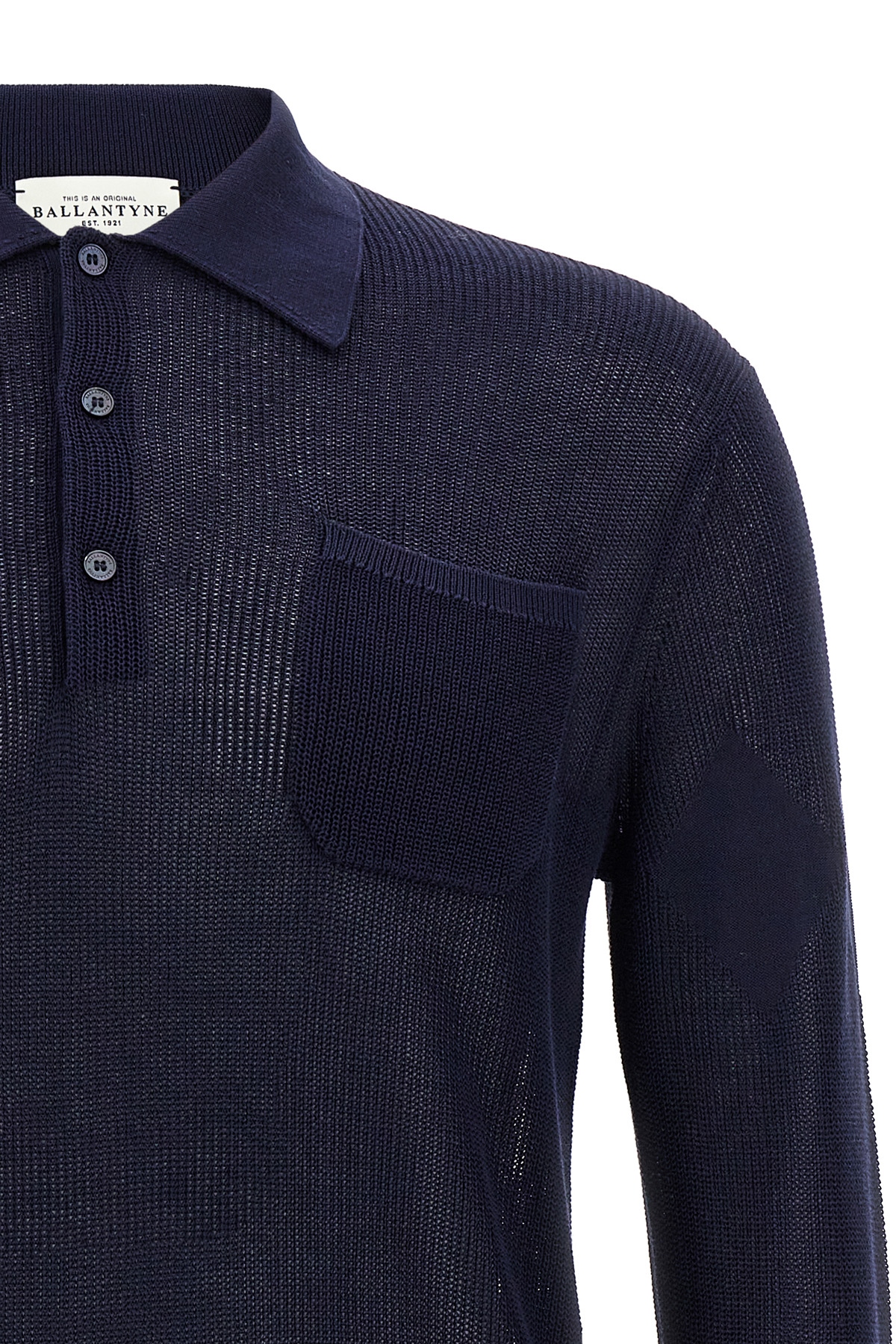 Knitted openwork cotton polo shirt, collar and buttons, breast pocket, long sleeves with cuffs and diamond embroidery.