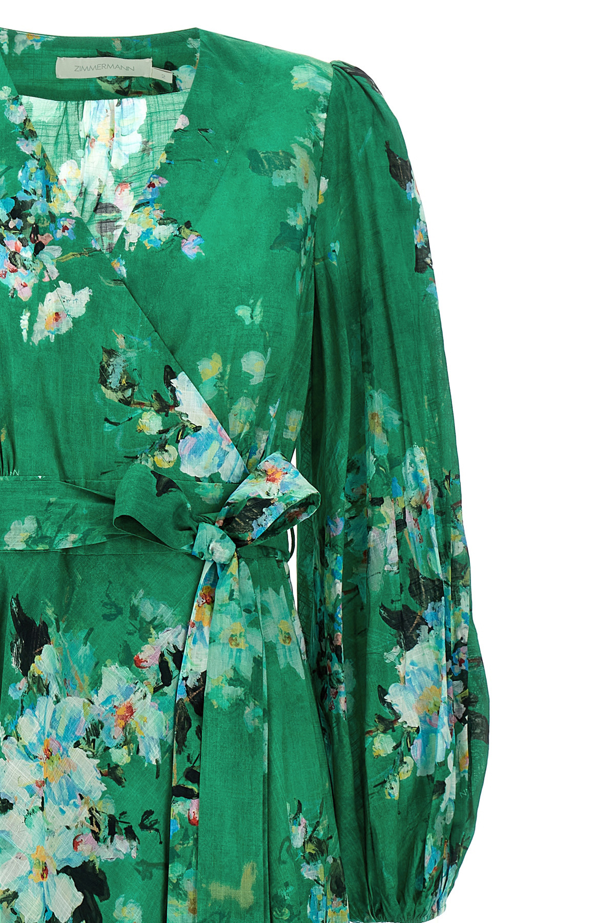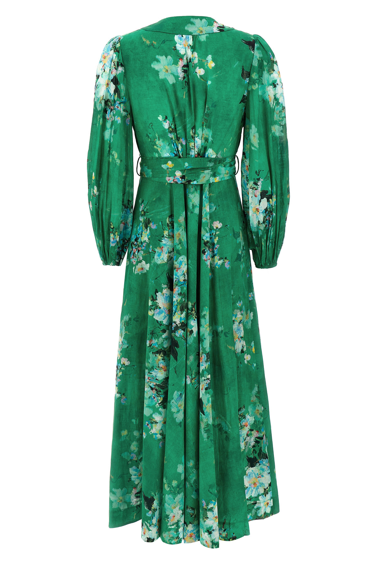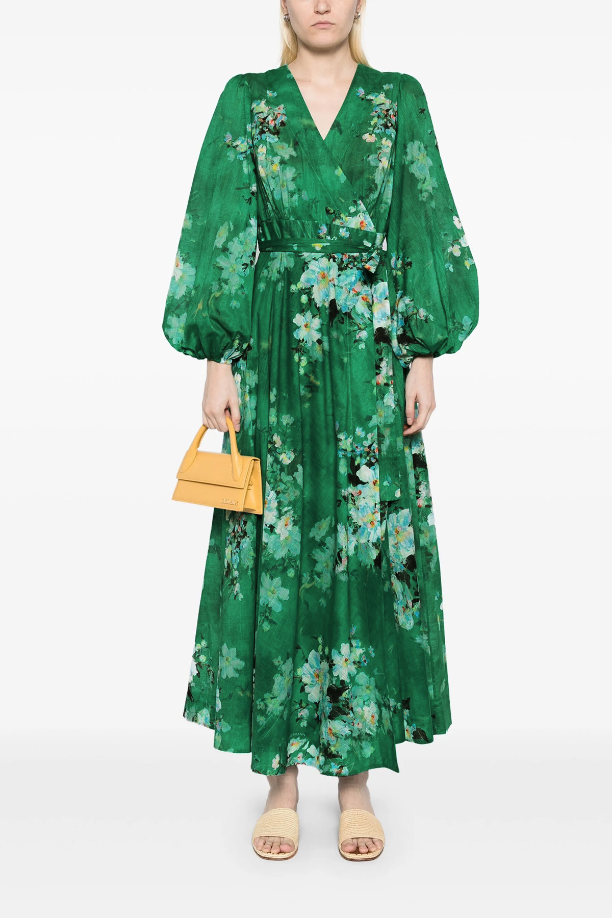 Everley Wrap Midi' floral print ramie dress, V-neck, wallet style with belt to tie at the waist, long wide sleeves with elastic cuffs and curled shoulder.