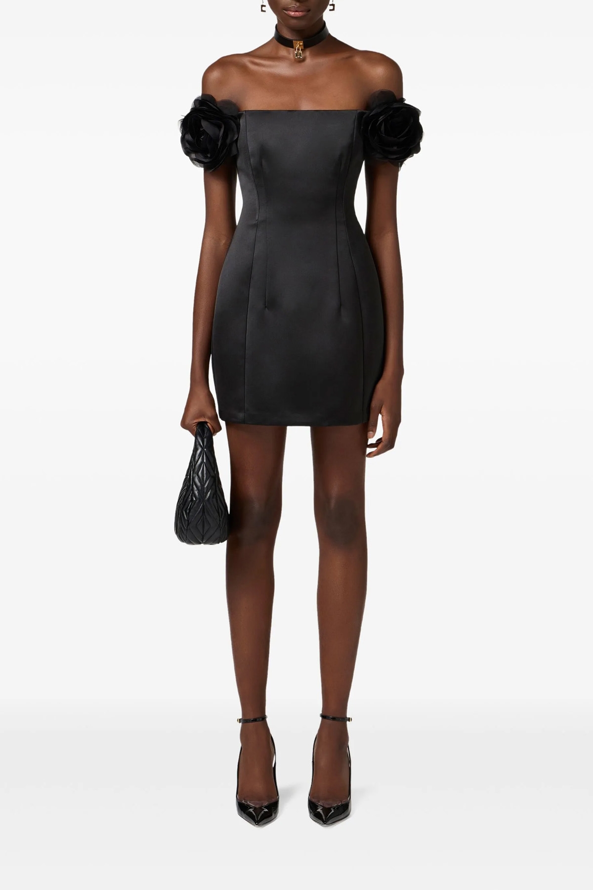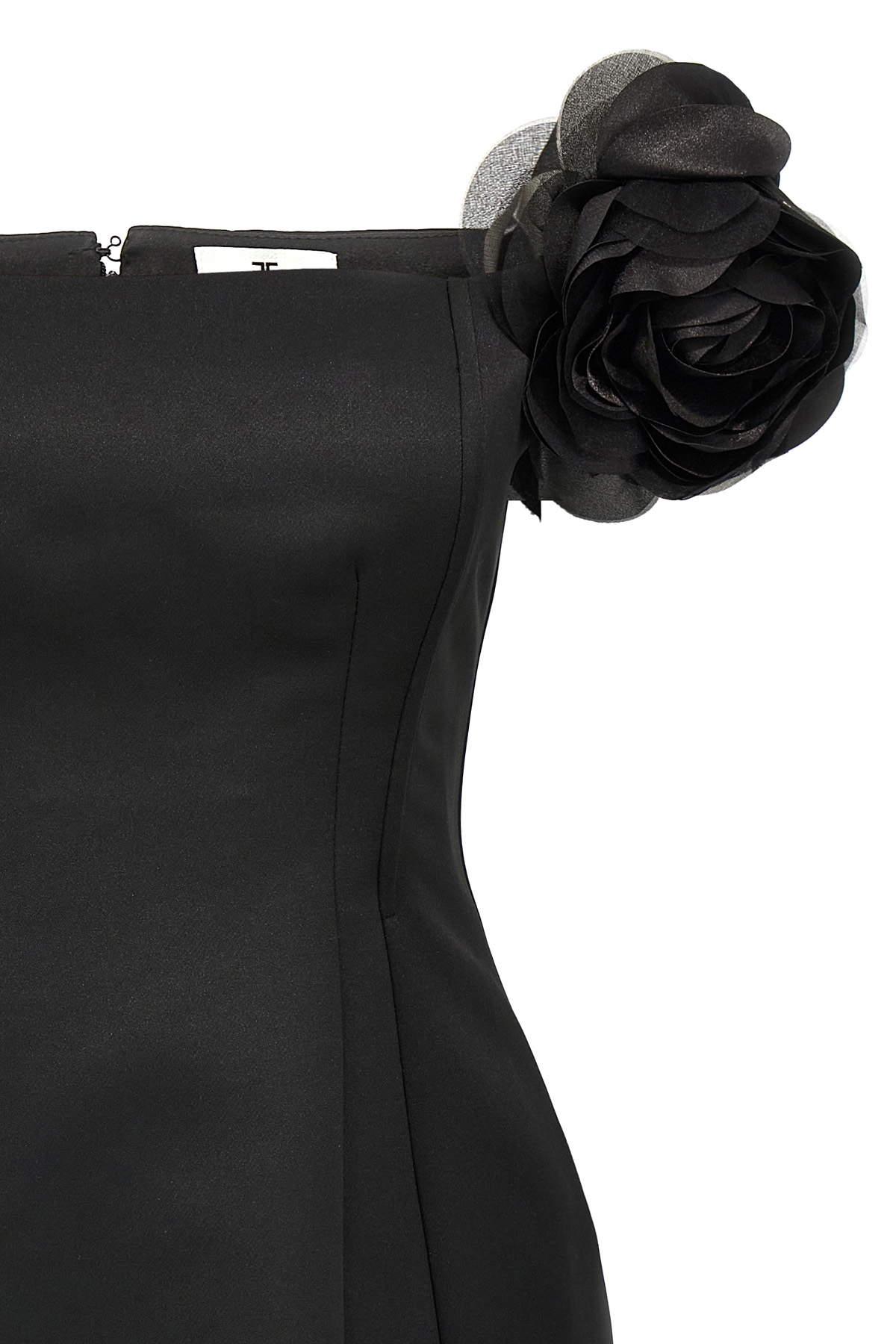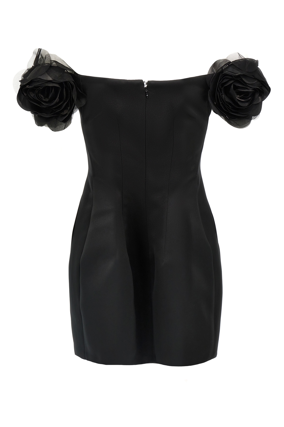 Duchesse mini dress, off-the-shoulder model with 3D flower detail on short sleeves, internal construction with slats, back zip closure, satin lining.