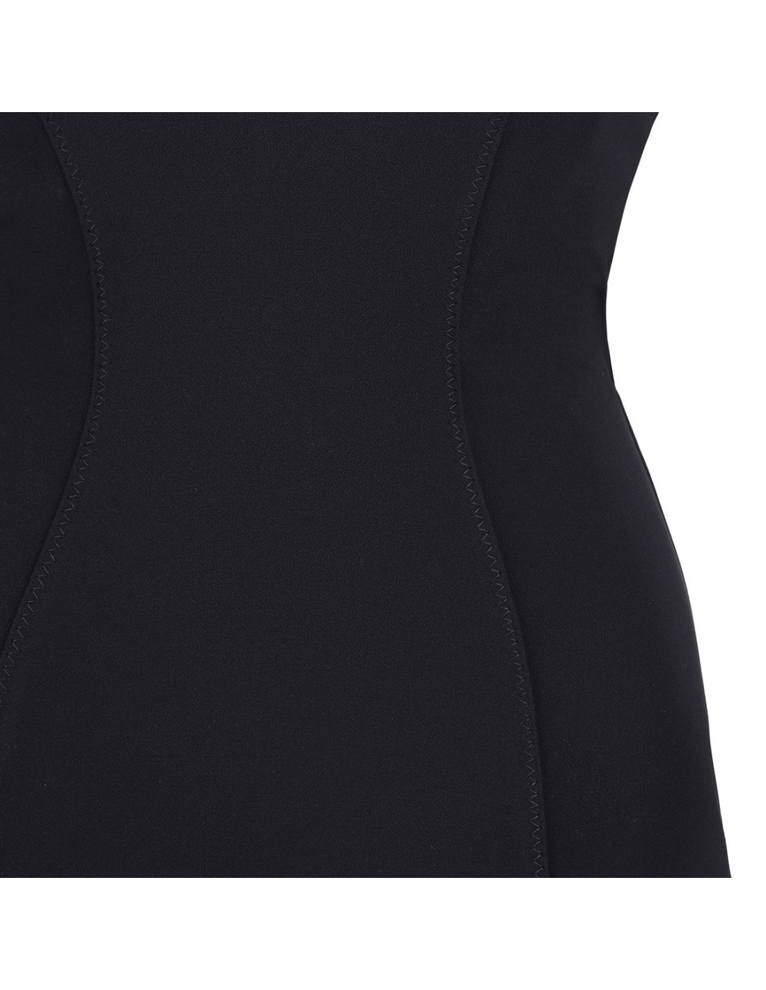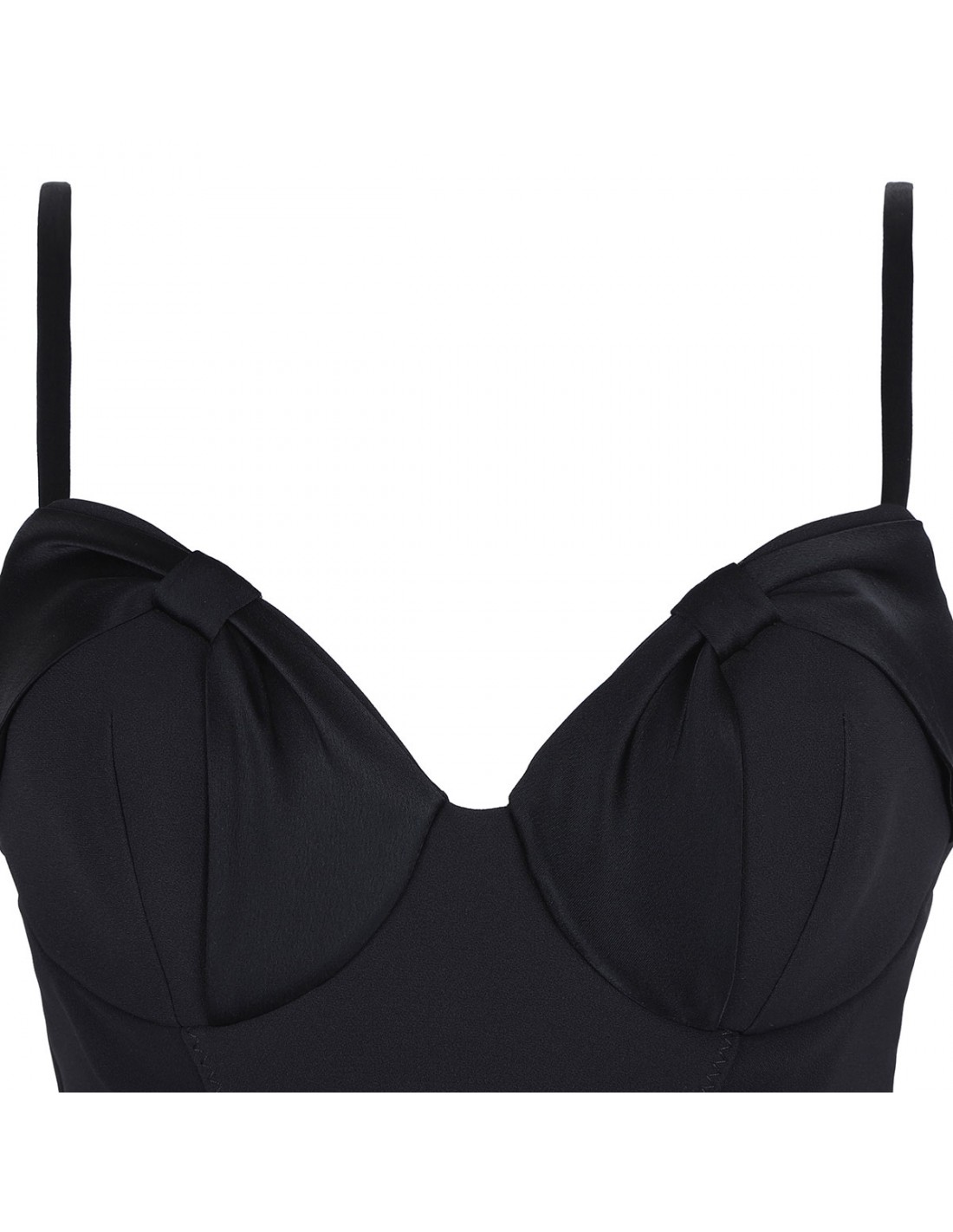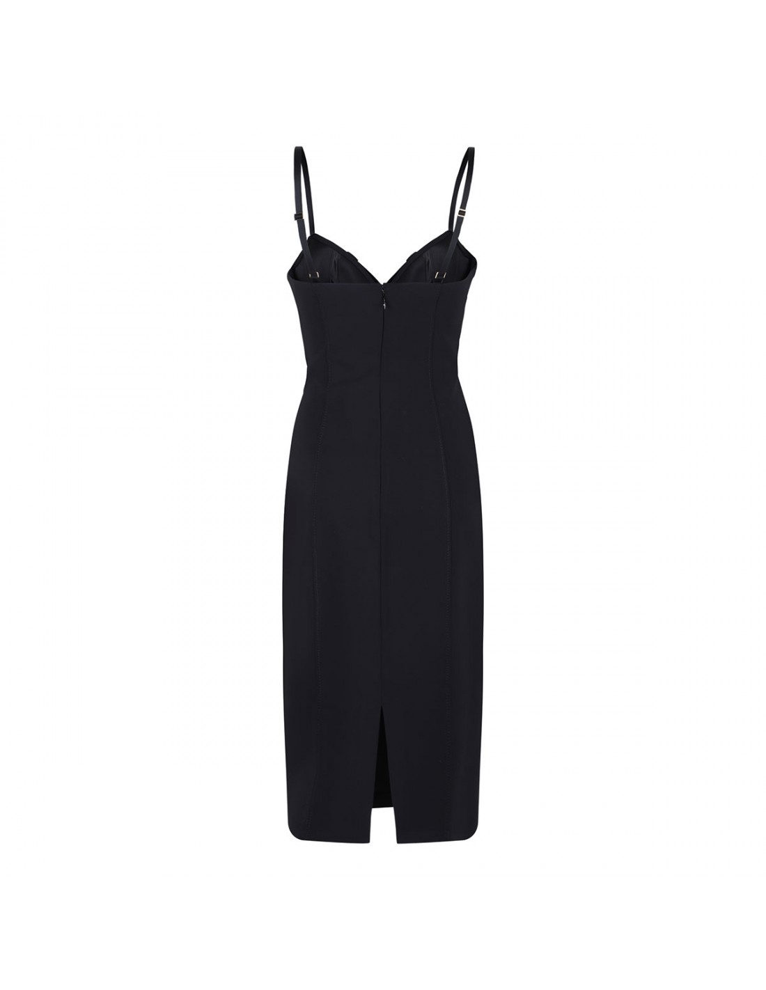 Black lightweight crepe midi dress from Elisabetta Franchi featuring satin bows on cups, sheath silhouette, sweetheart neckline, adjustable spaghetti shoulder straps, concealed back zip fastening, back slit.
