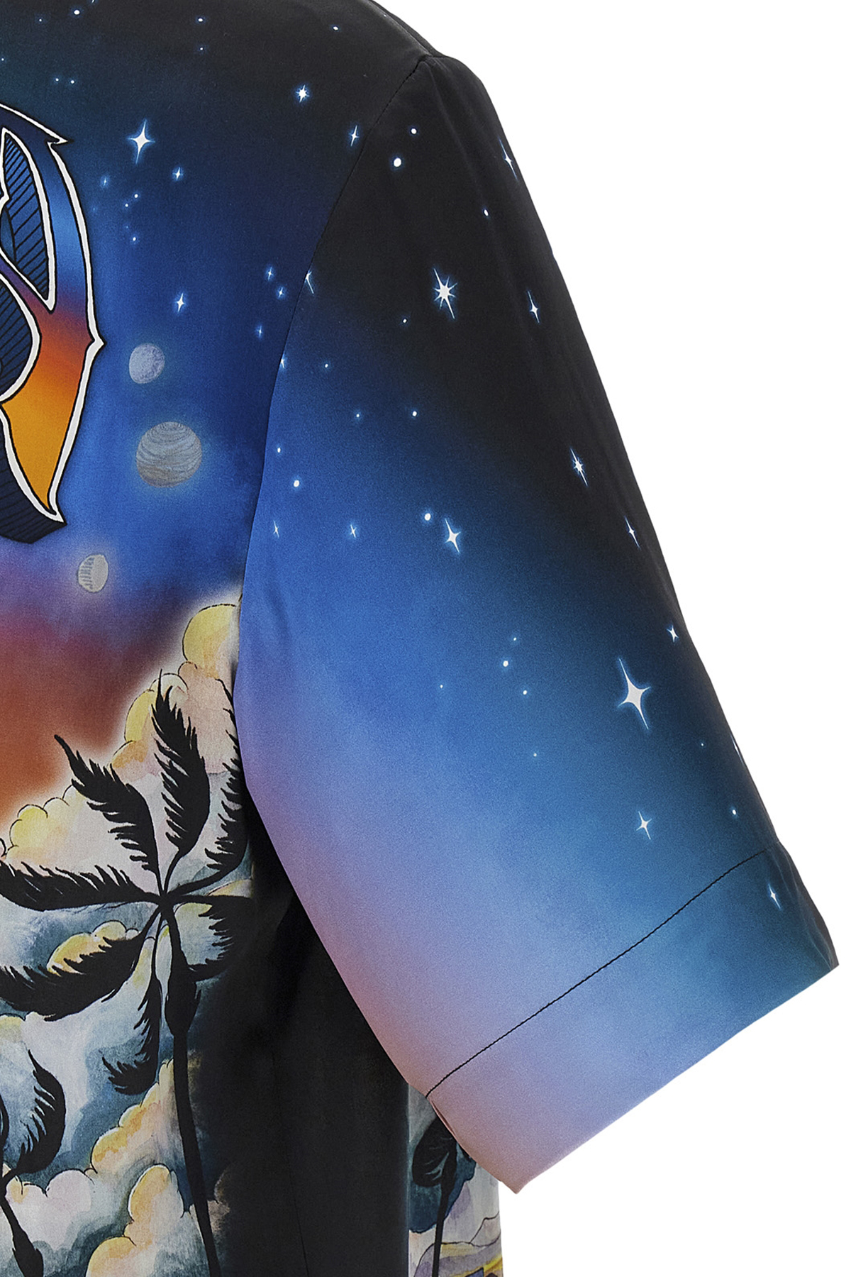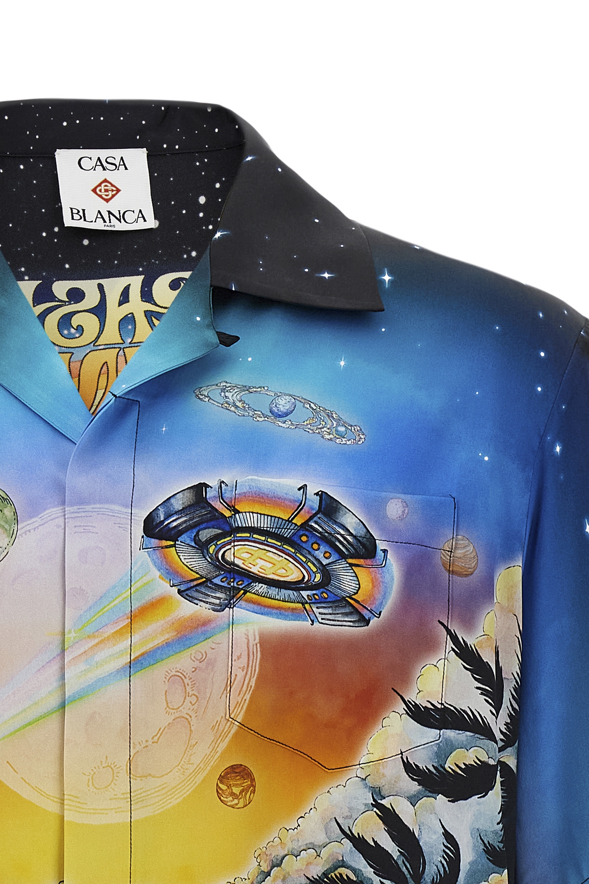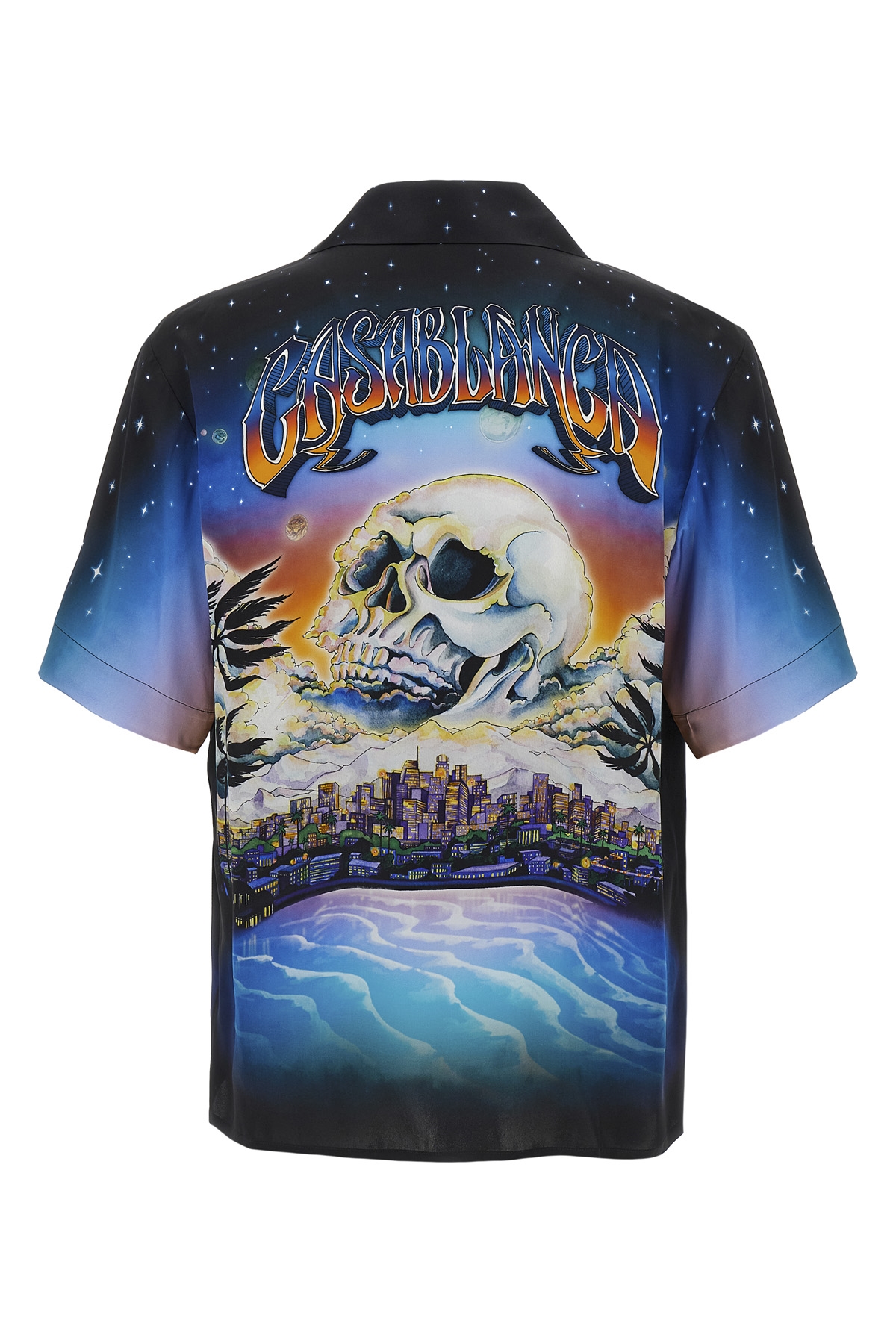 All-over 'LA Premonition' print silk shirt, button closure, chest pocket, and short sleeves.