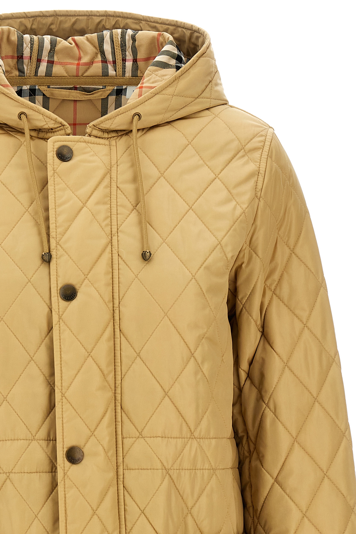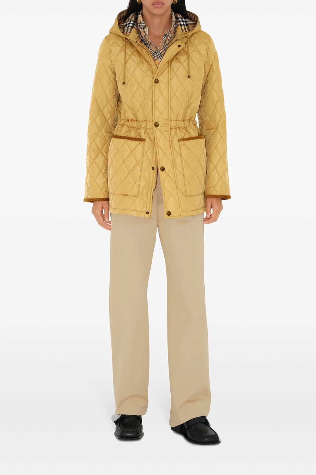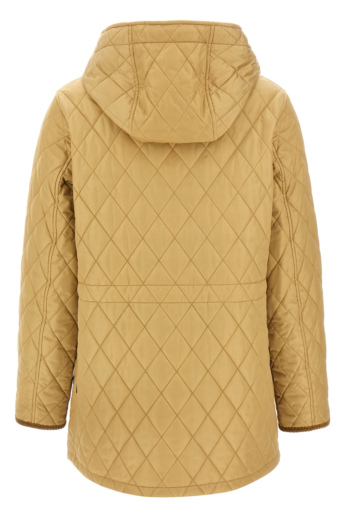 Lightly padded quilted fabric jacket with velvet details, hood, zip and snap button closure, pockets, long sleeves, drawstring at the waist.