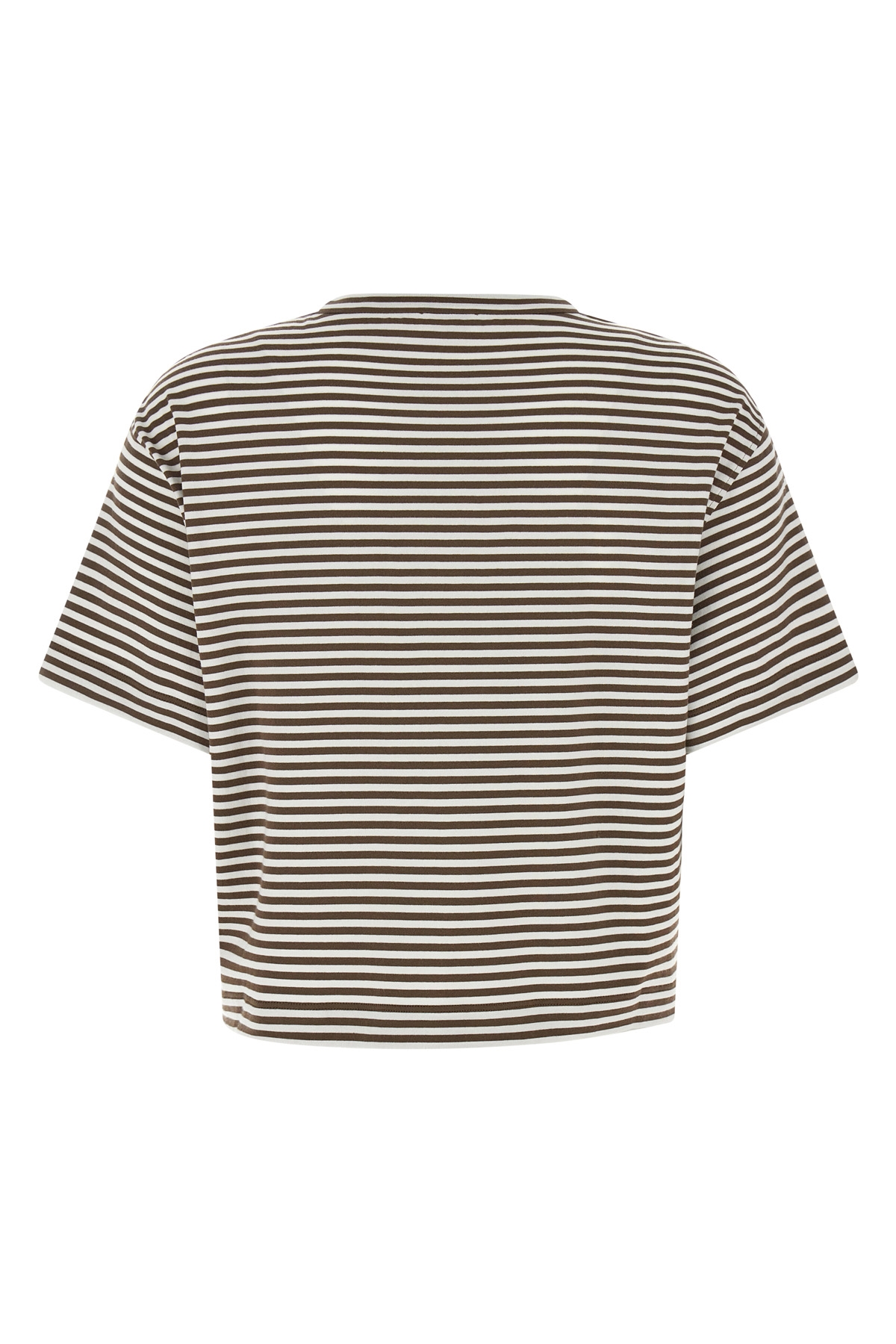 Striped cotton T-shirt, crop model, pocket with side jewel detail, crew neck, short sleeves with dropped shoulder.