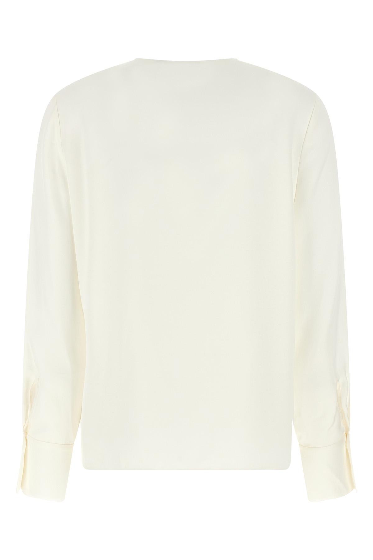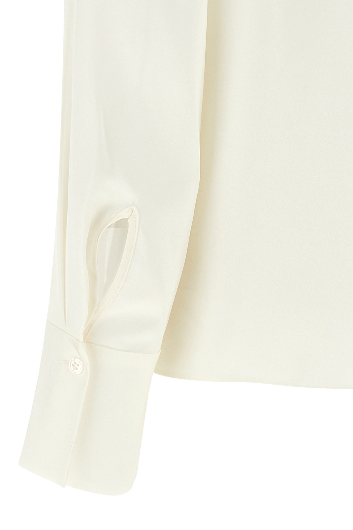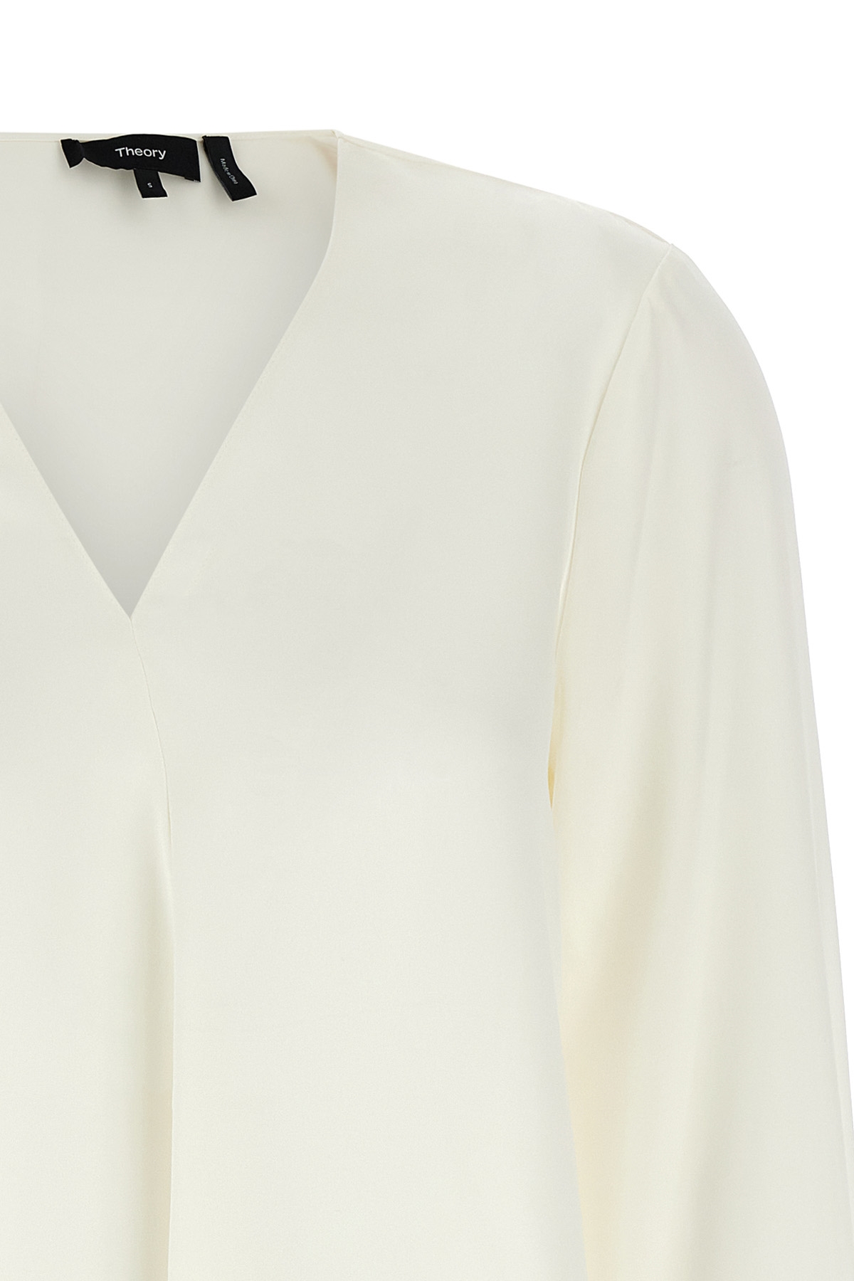 Silk blouse with V-neck, long cuffed sleeves, and asymmetrical front split.