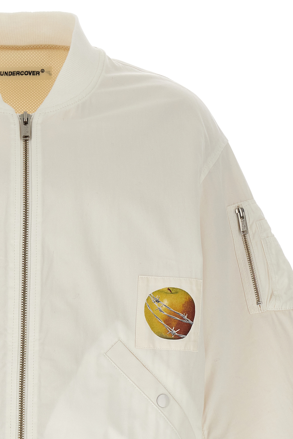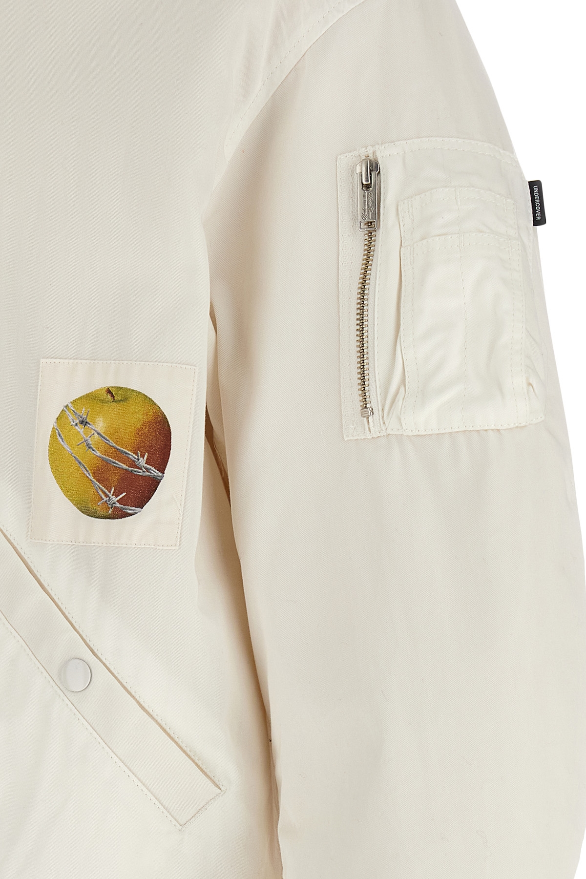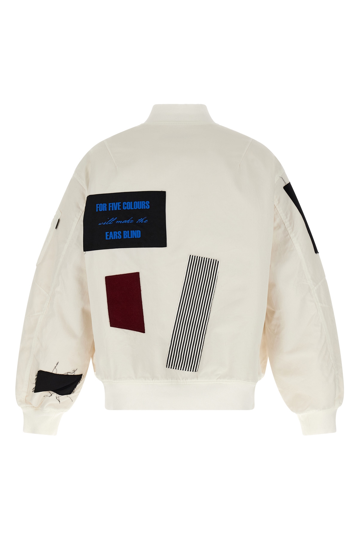 Cotton bomber jacket with multi patch, zip closure, pockets and closure. Cuffs in sleeves, waist and neck.