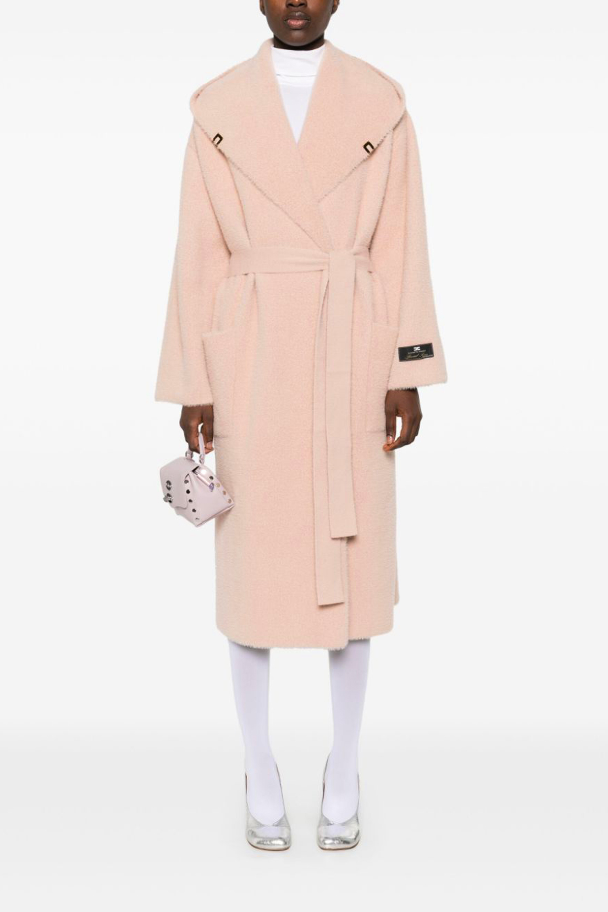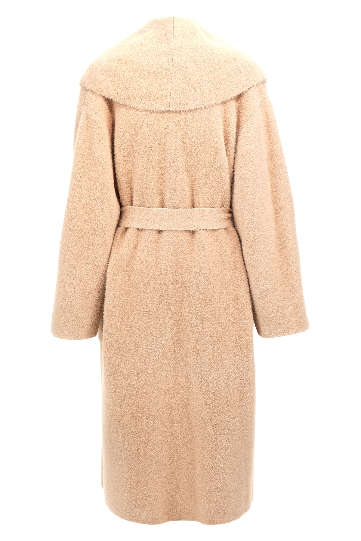 Fur-effect fabric coat, belt closure at the waist, patch pockets, long sleeves, shawl neckline with metal logo application.