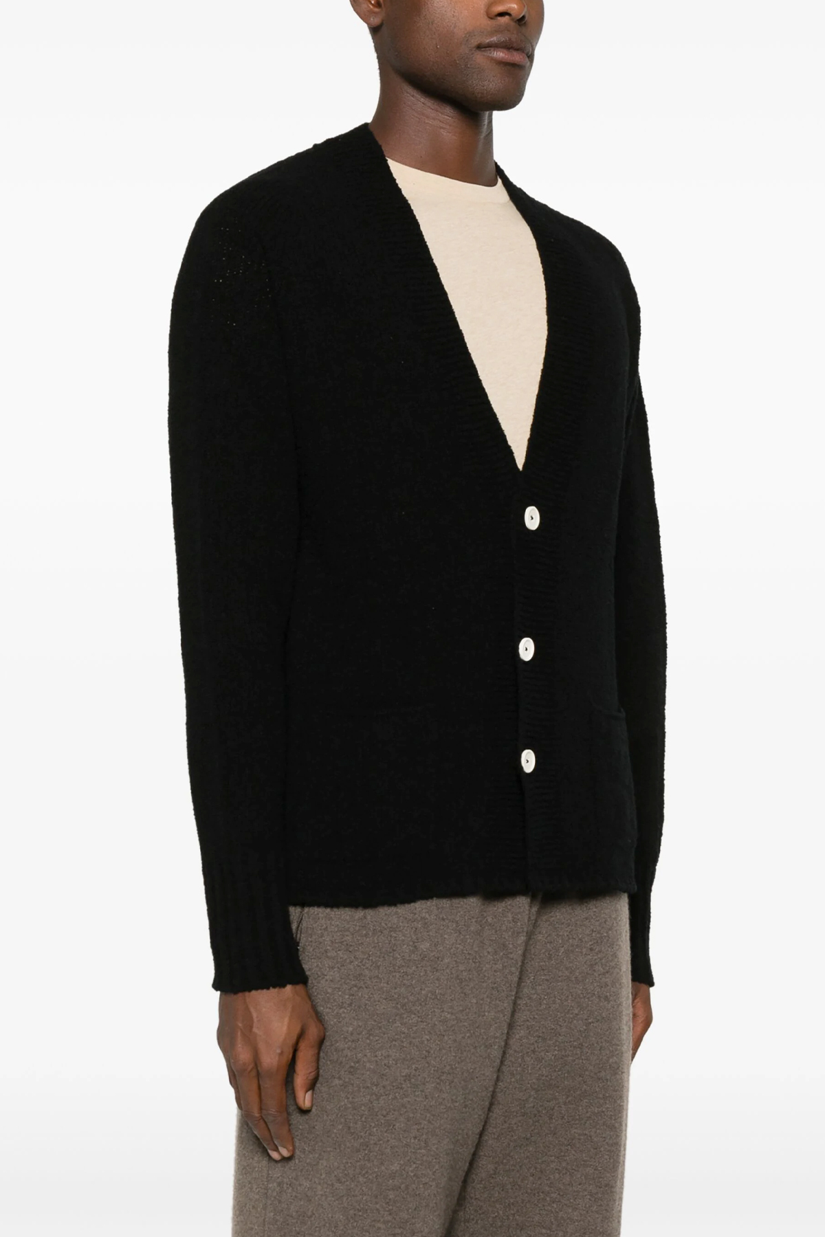 Wool blend cardigan, front pockets, button closure, long cuffed sleeves.