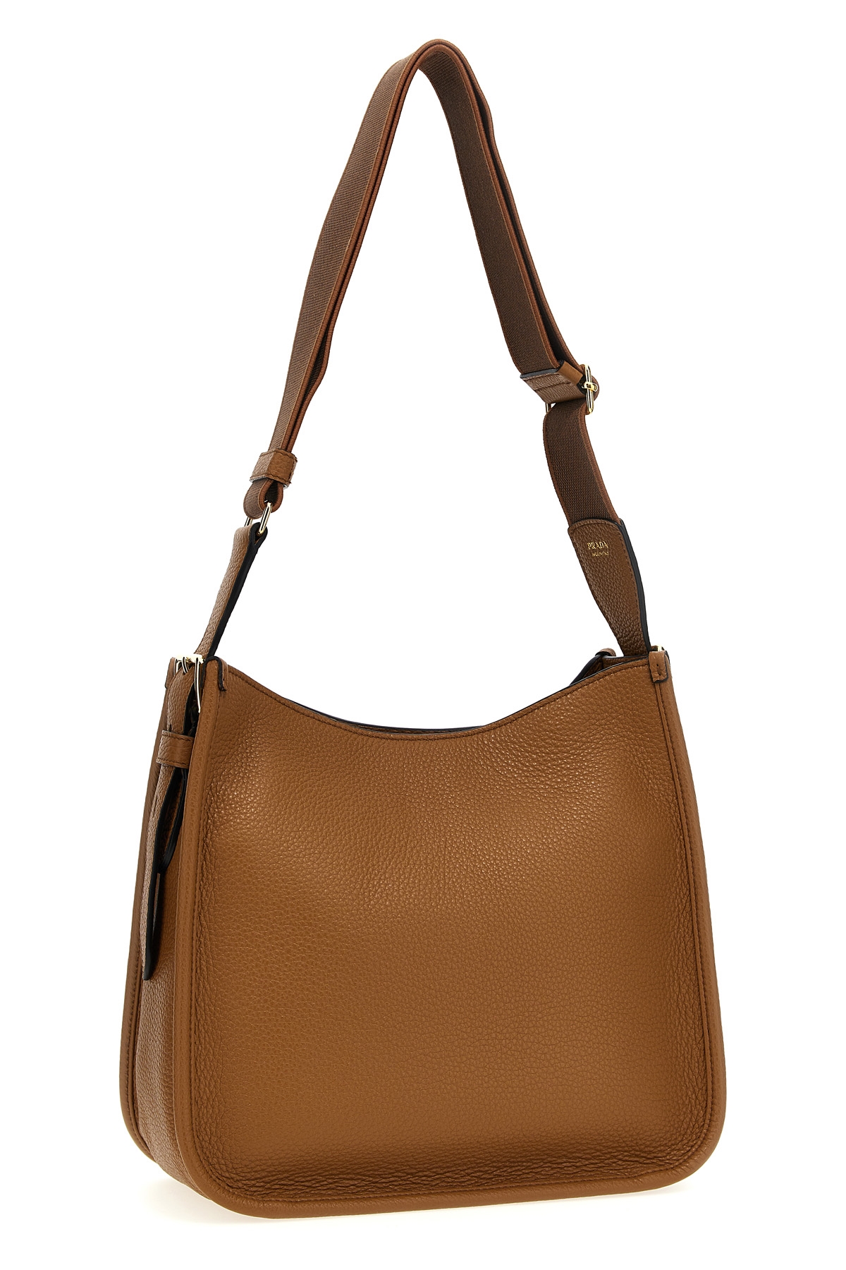 Hobo crossbody bag in grainy leather with front metal lettering logo, magnetic closure, metal details, and adjustable shoulder strap in embroidered and logoed tape.