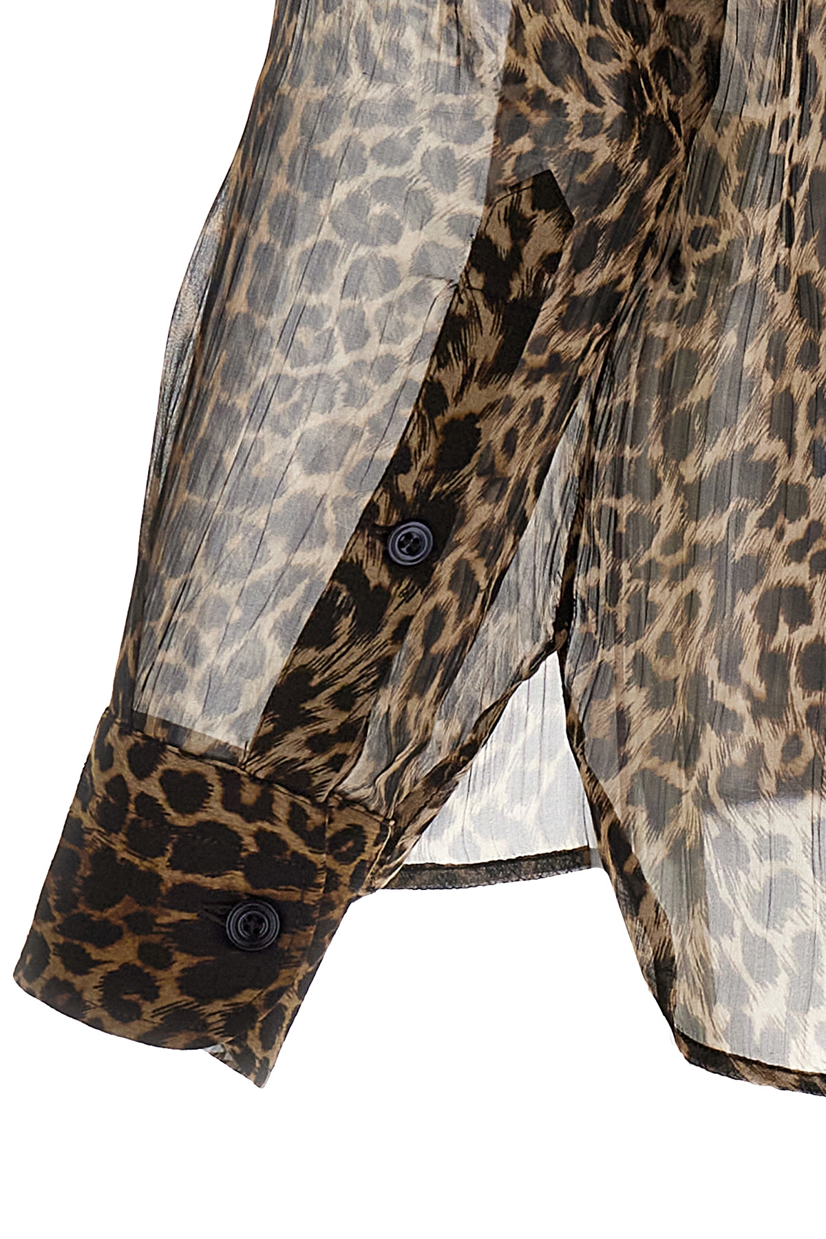 Semi-transparent silk chiffon shirt with animal print, front button closure, long cuffed sleeves.