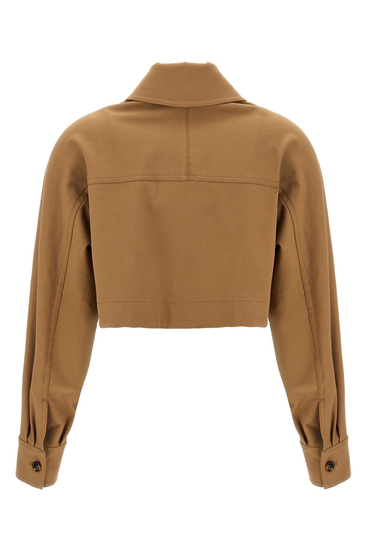 'Smalto' washed stretch cotton twill jacket, crop style unlined, button closure, shirt collar with folded left side and fixed laterally with decorative button, pockets, long kimono sleeves with shirt cuffs and patterned pin tucks on the shoulder.