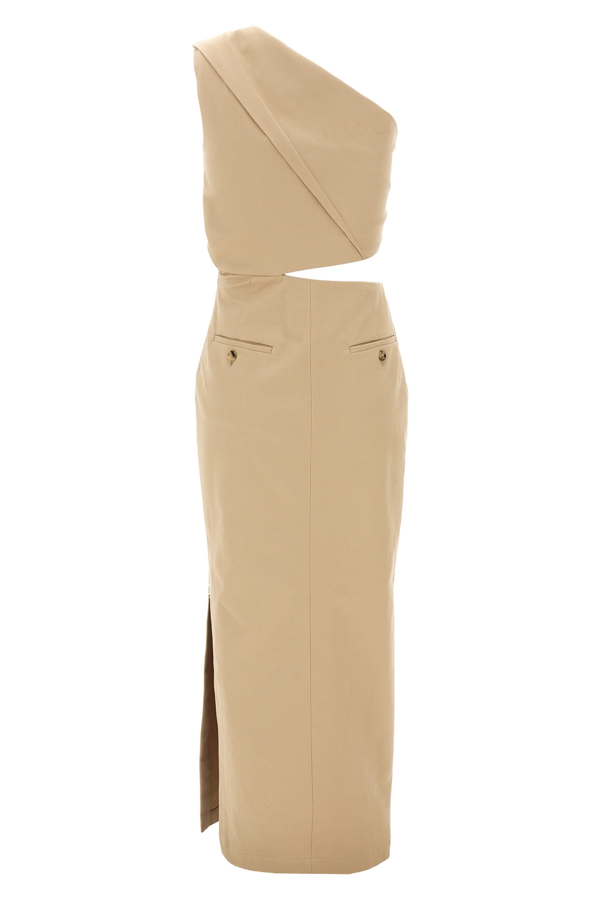 Long 'Nievo' dress in washed stretch cotton twill, one shoulder, front asymmetric pleats, unlined model with cut-out detail on the right side, pockets, zip closure and side split.