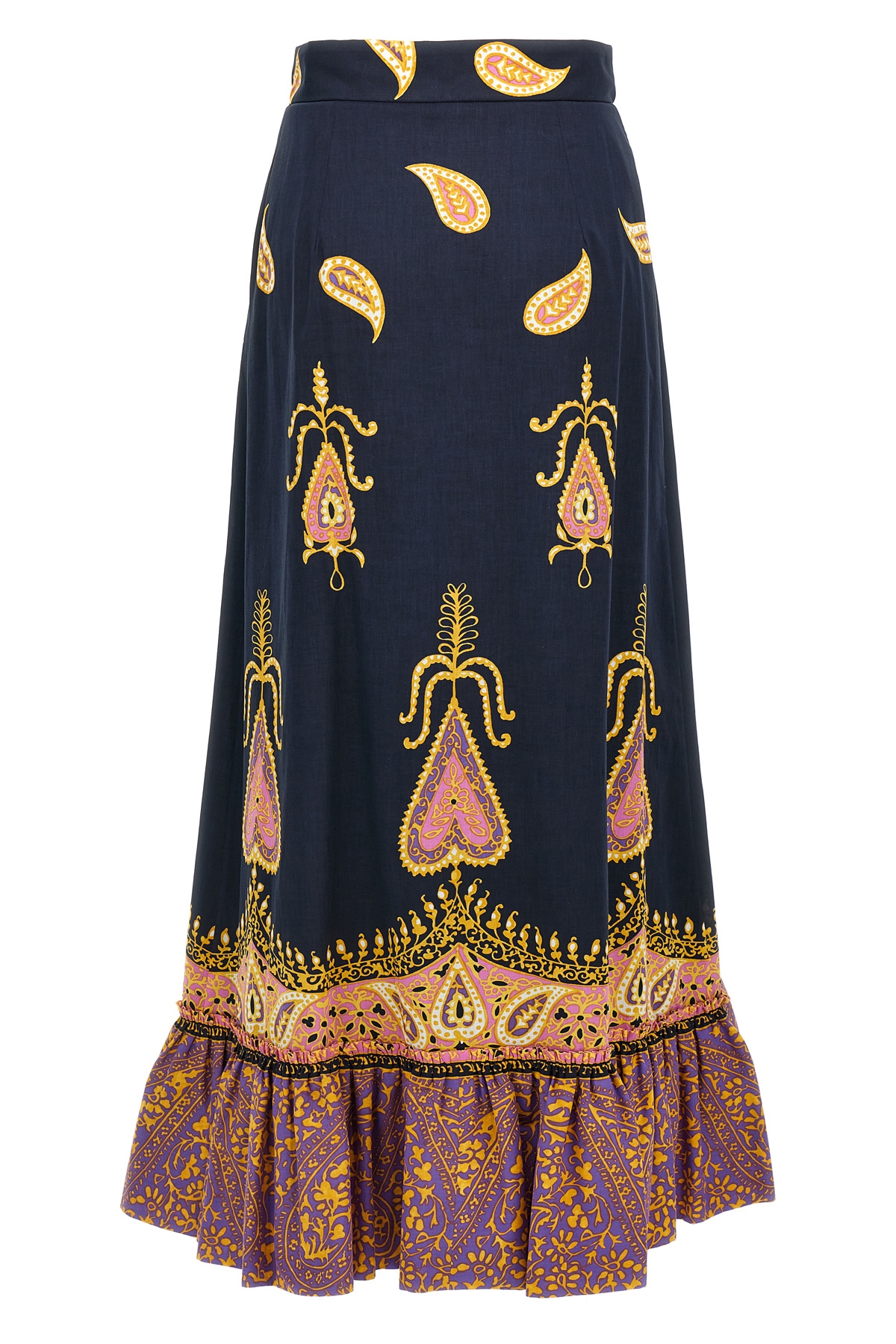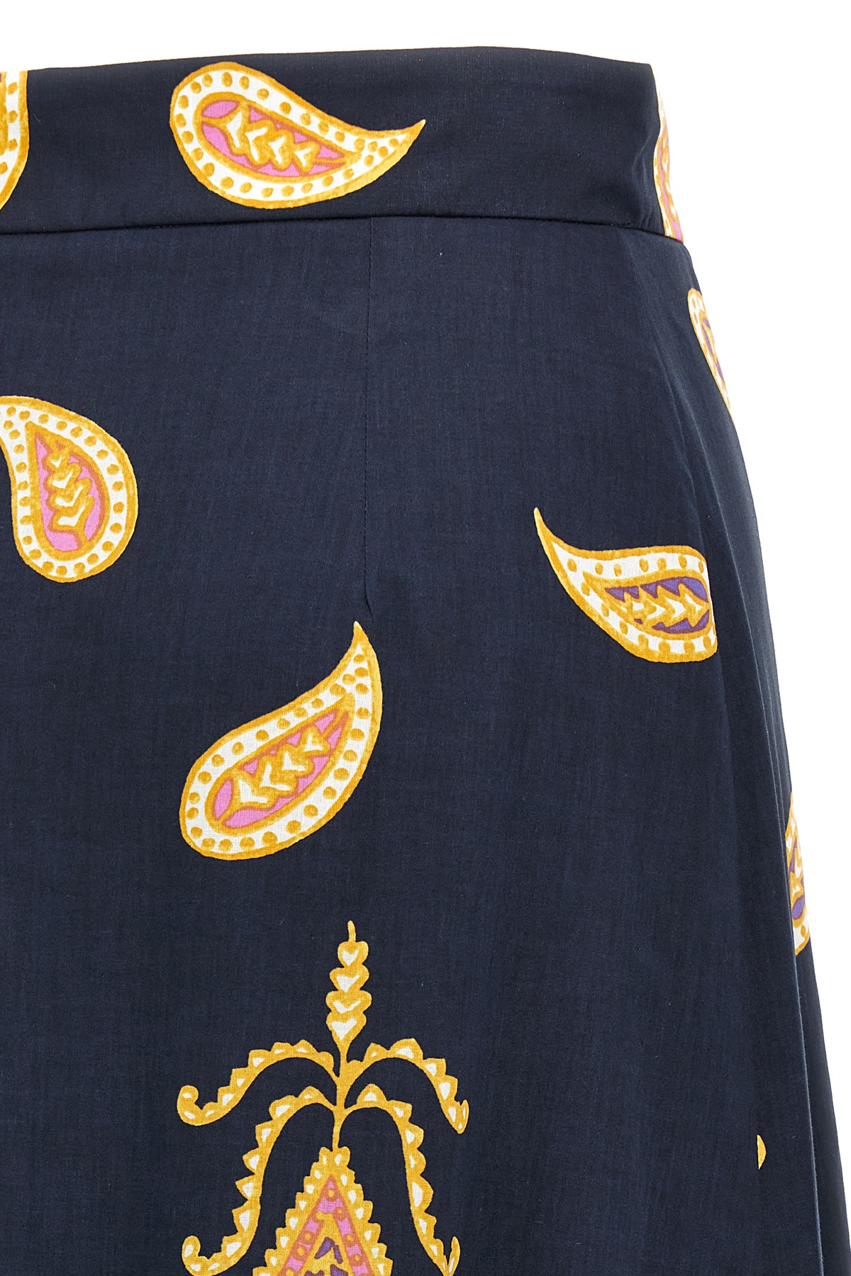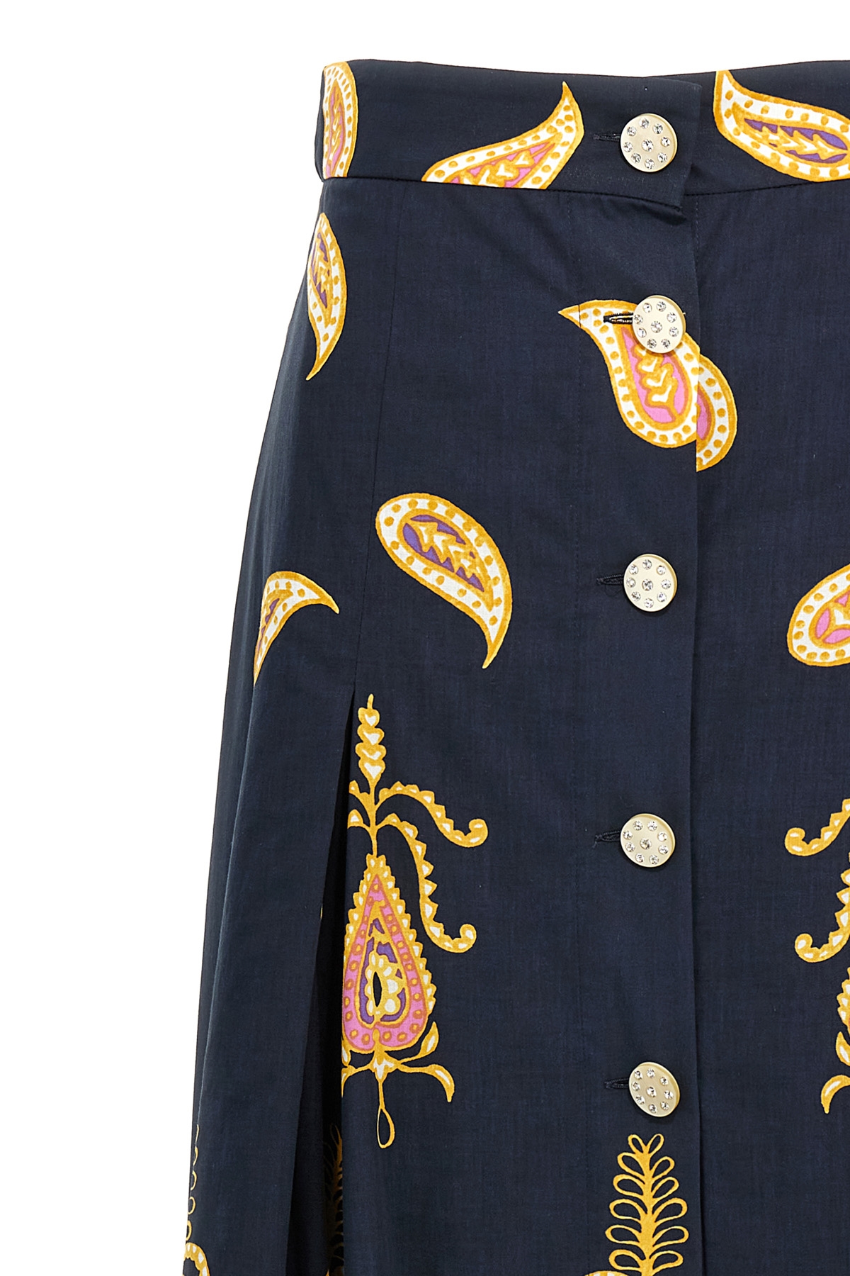 Paisley-print long skirt in cotton muslin, jewel button closure and front split, lining, flounces on the hem.