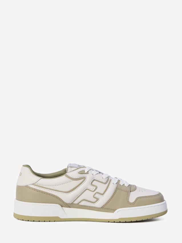 Fendi Match sneakers in white leather with green leather details. They feature a lace-up closure, perforated toe, Fendi logo on the tongue and the