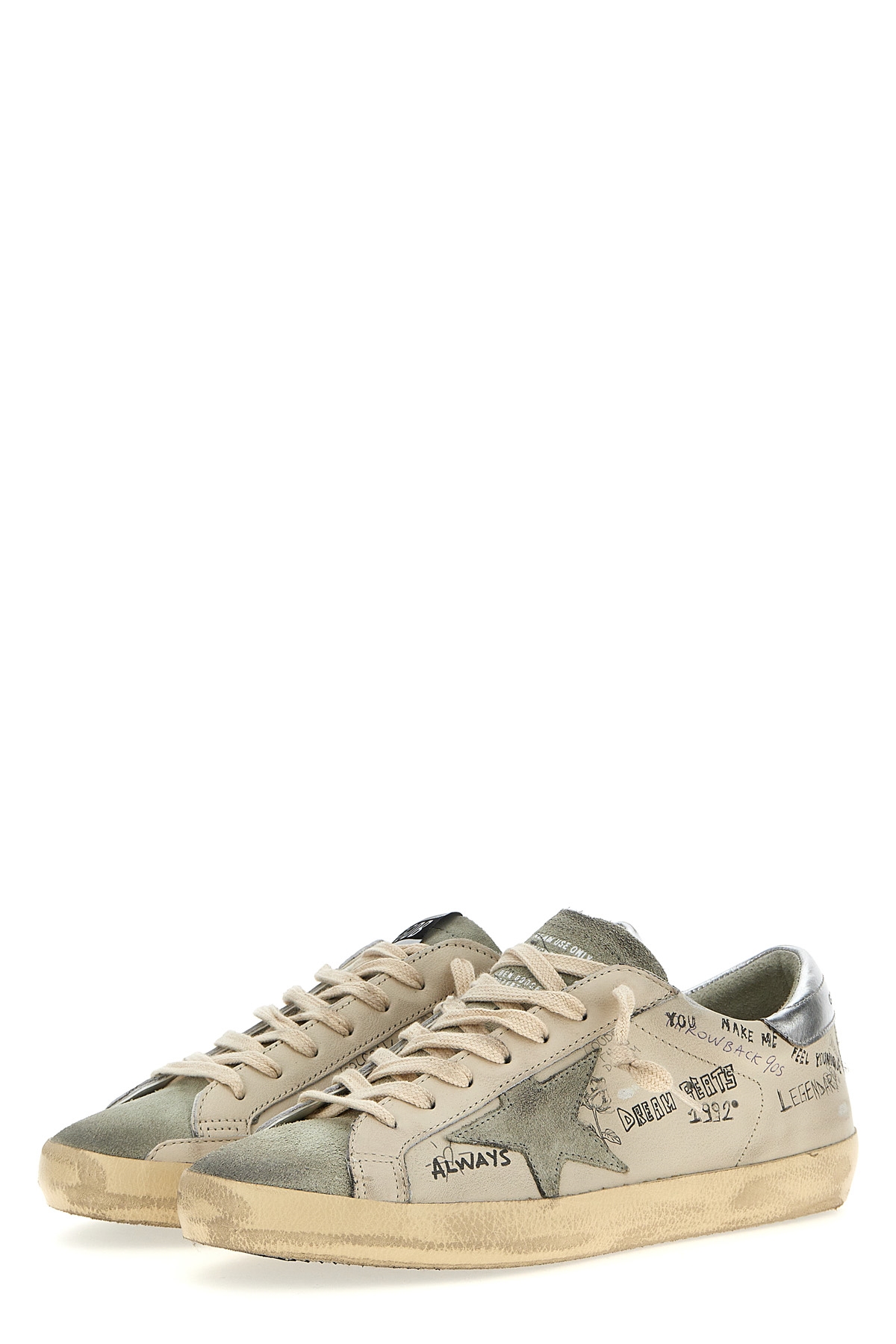 'Superstar' leather sneakers, details Used and lettering effect, side star in suede and contrasting metallic leather heel, laces, rubber sole.