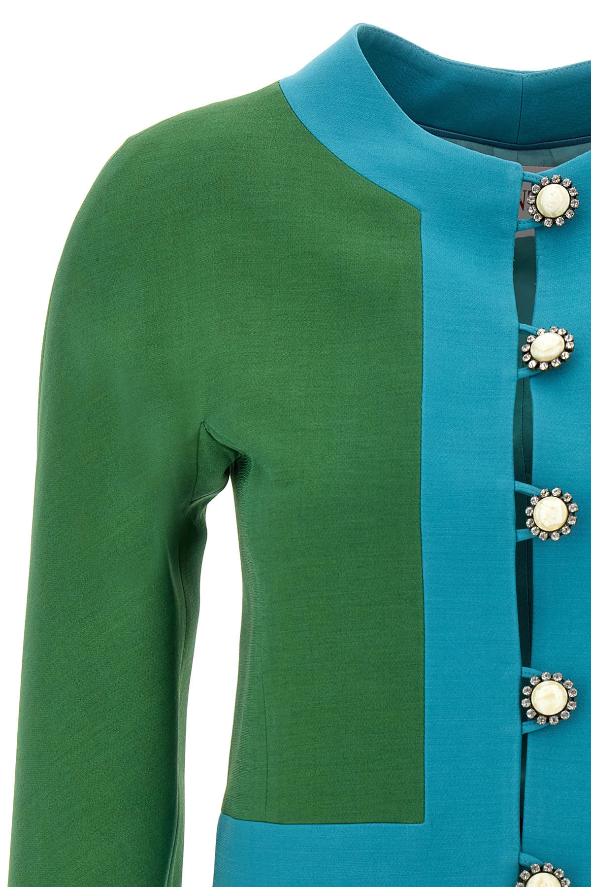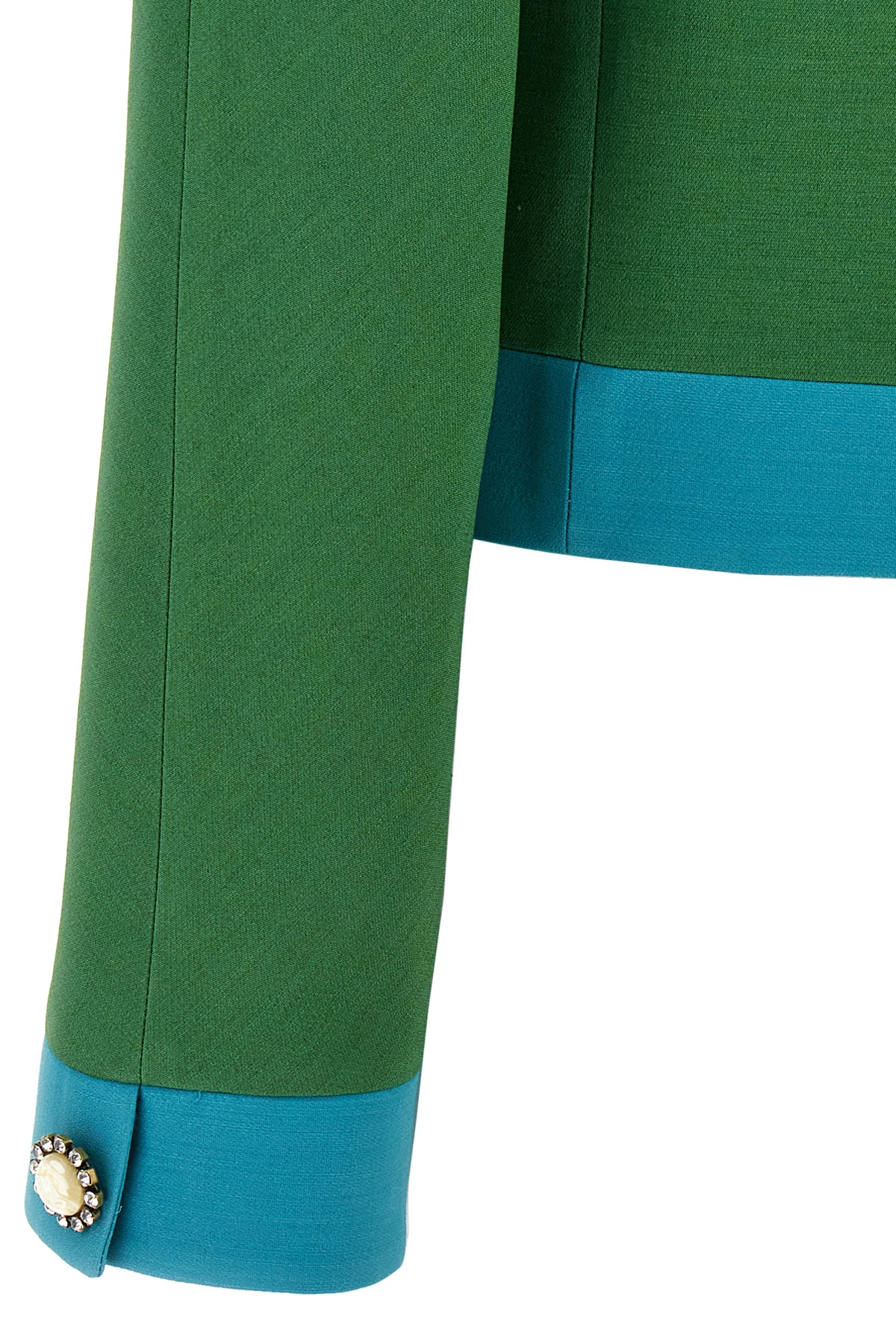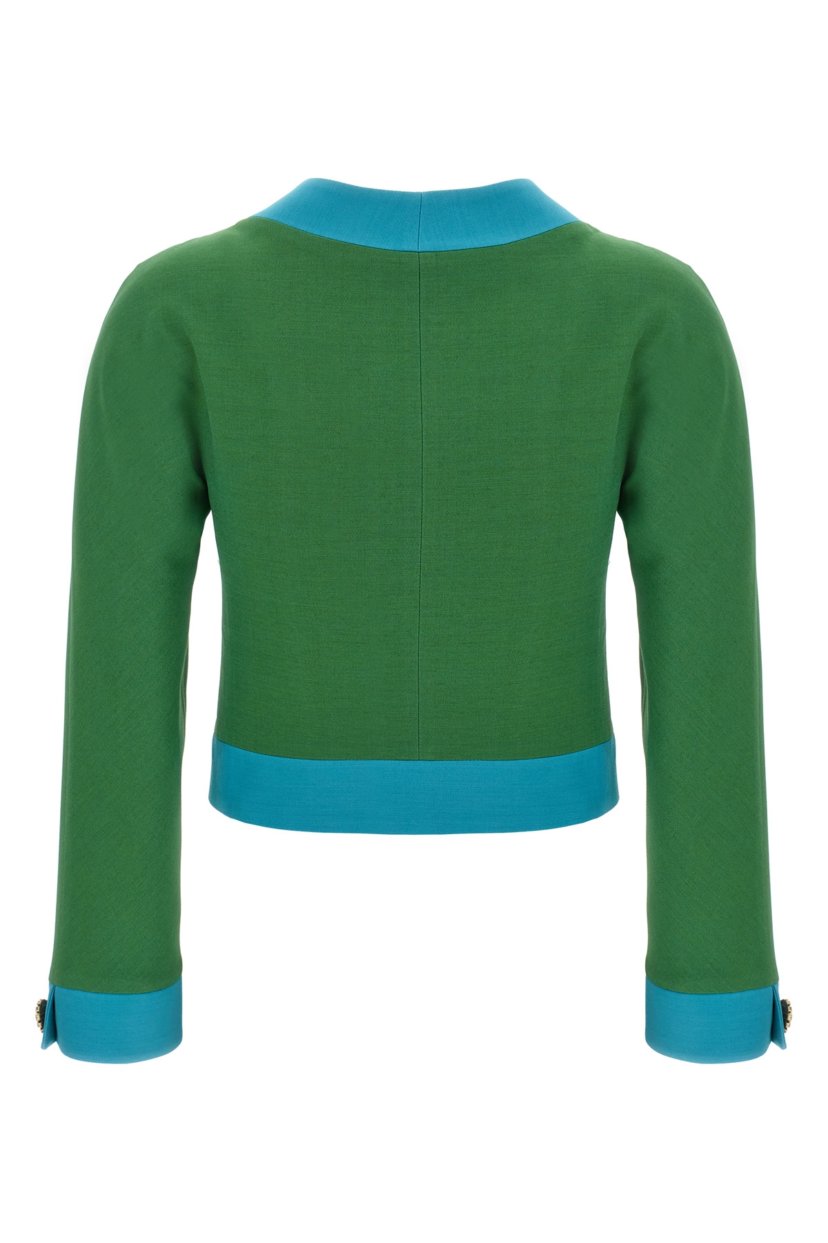 'Solid' blazer in wool and silk crepe couture with contrast piping, bolero model, front jewel button closure, crew neck, long cuffed sleeves.