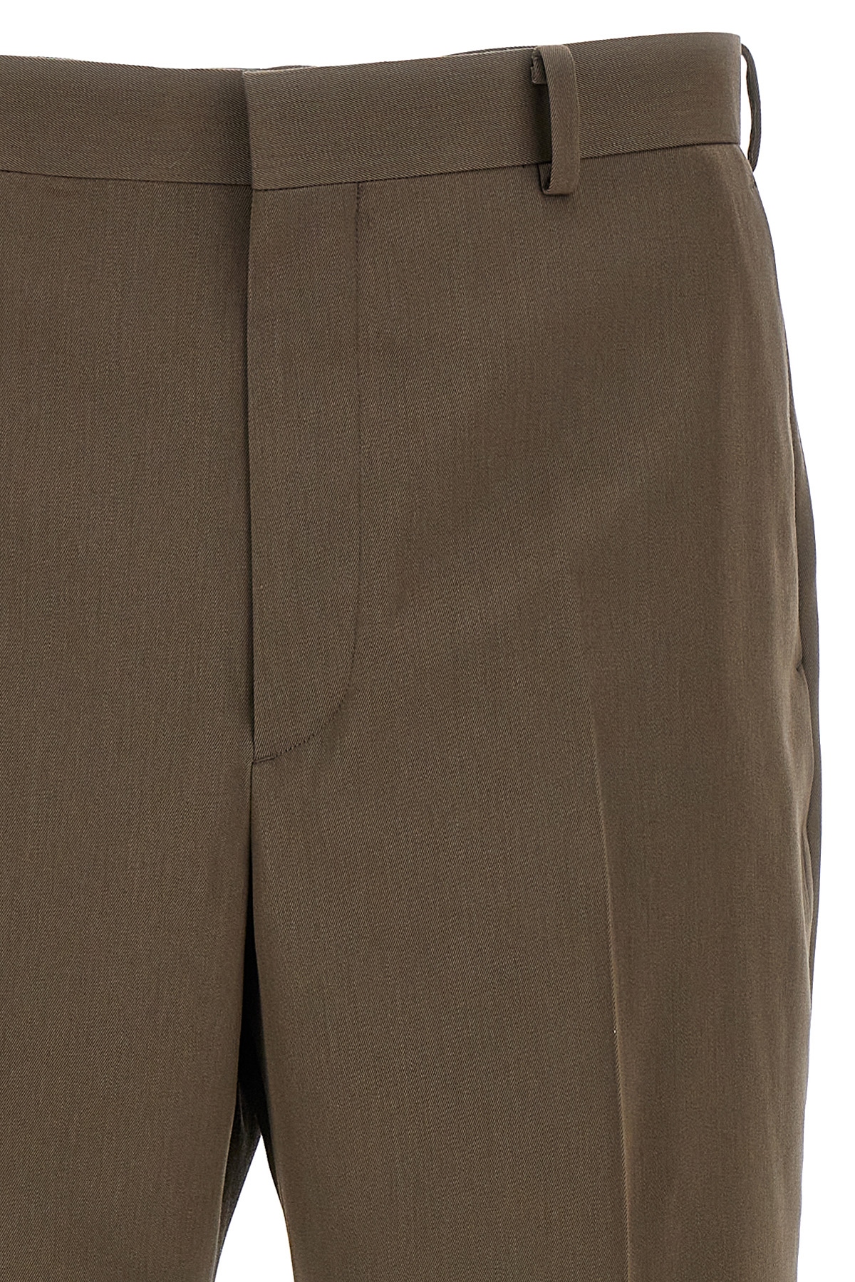 Wool gabardine trousers, hook and button zip closure, pockets, leg with stretched crease.