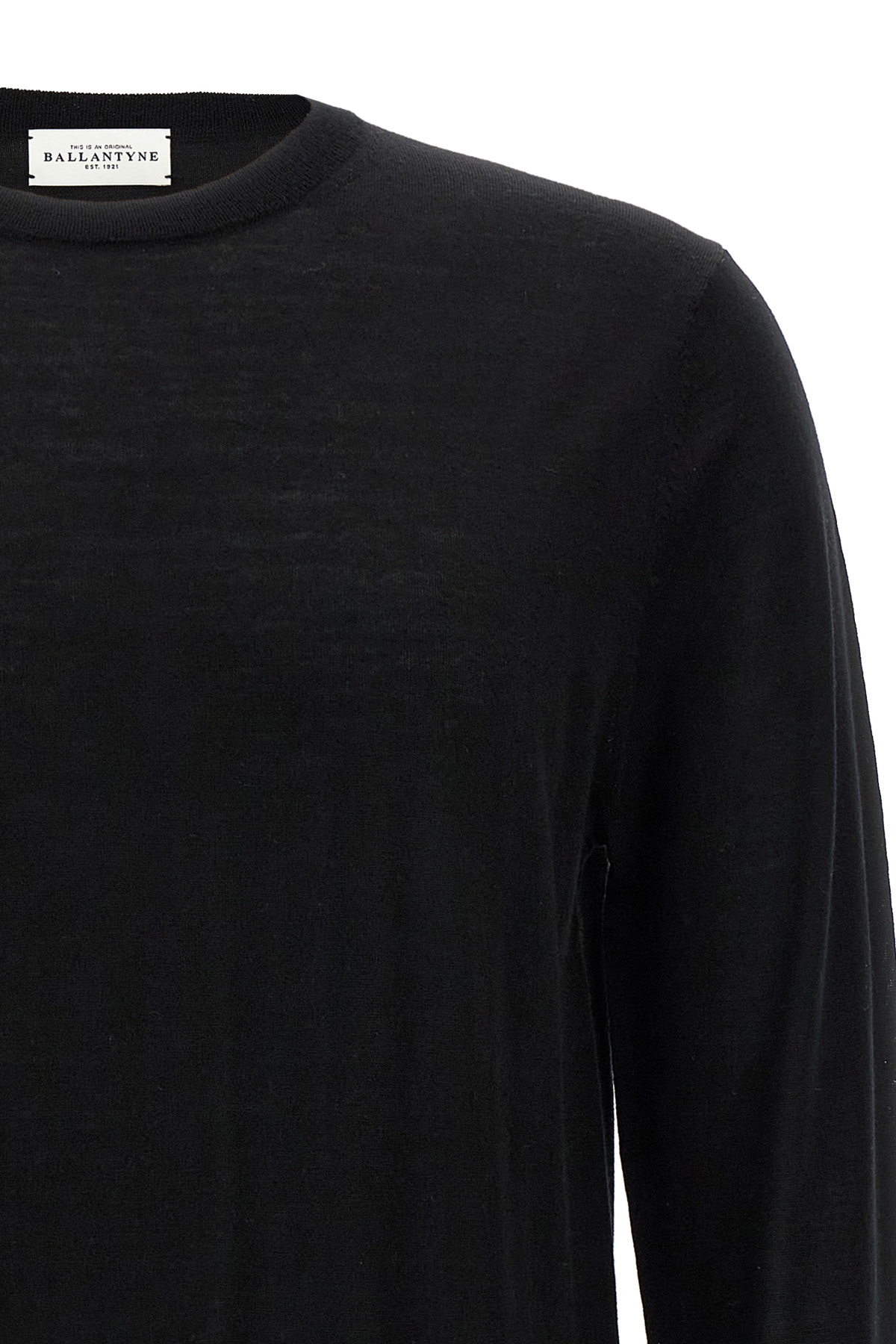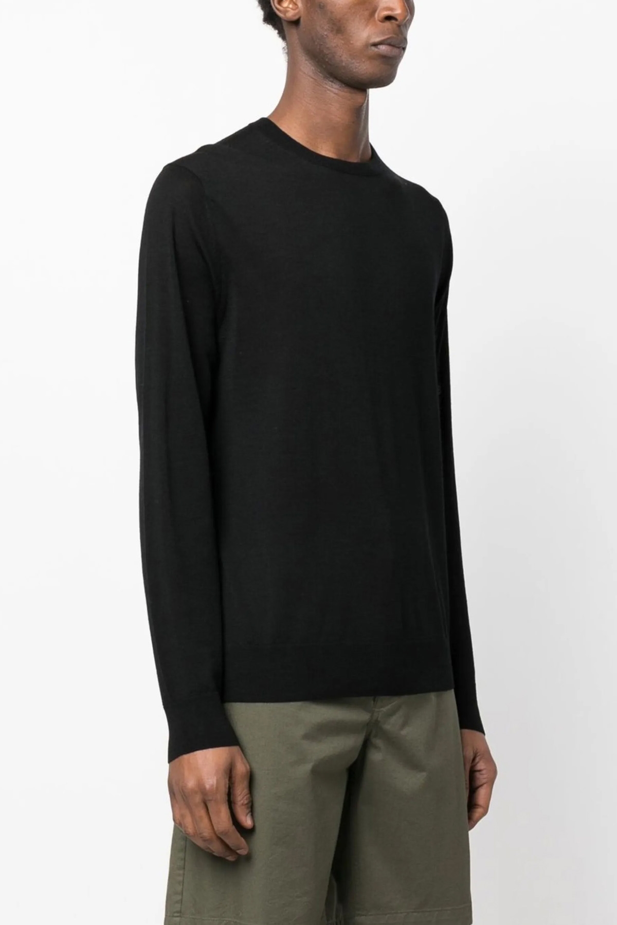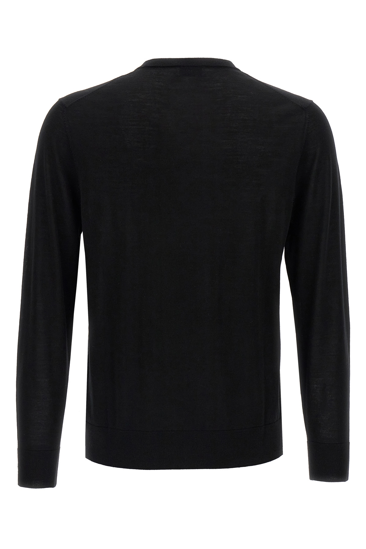 Light wool 'R Neck' sweater with crew neck, long cuffed sleeves.