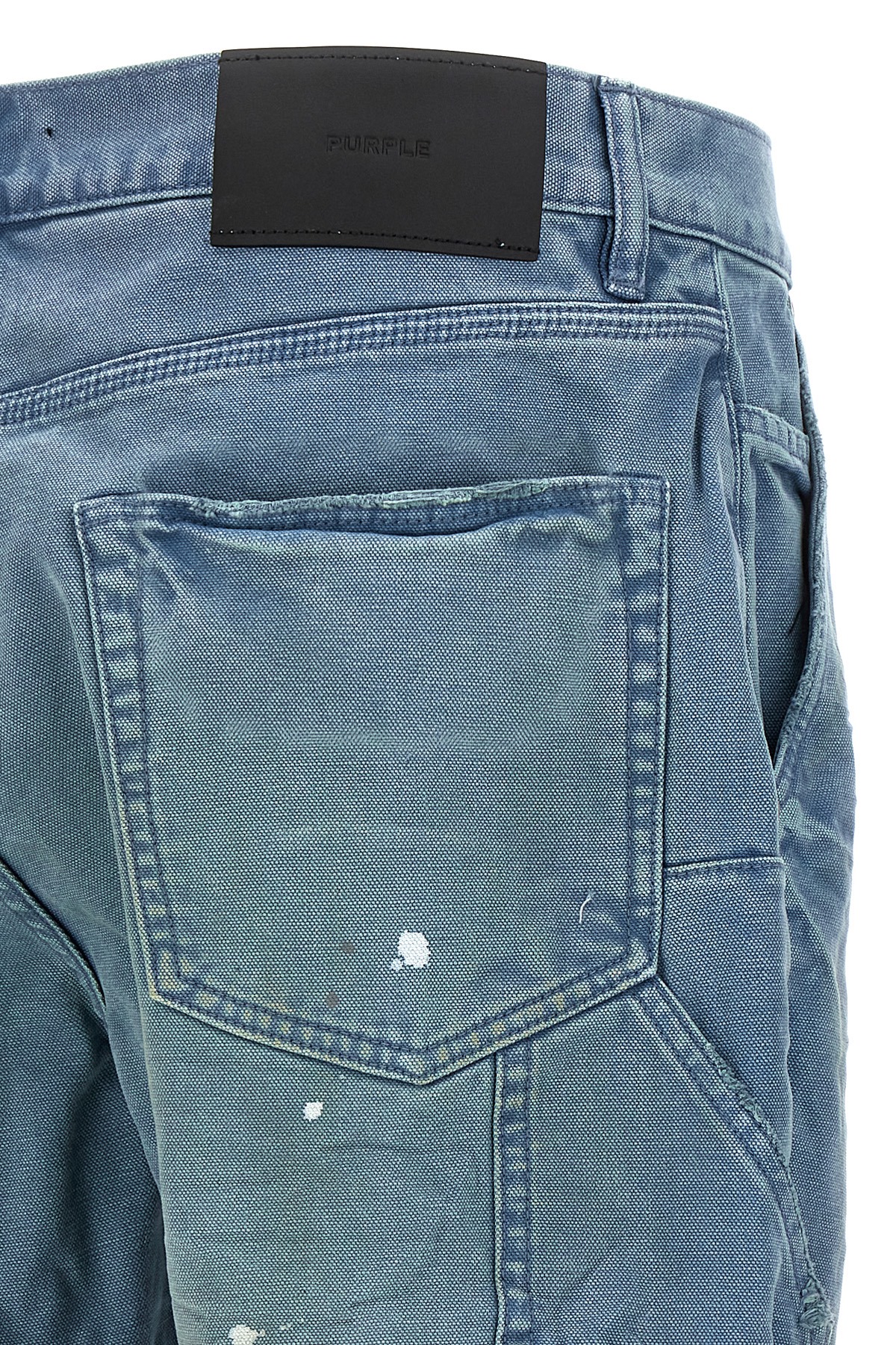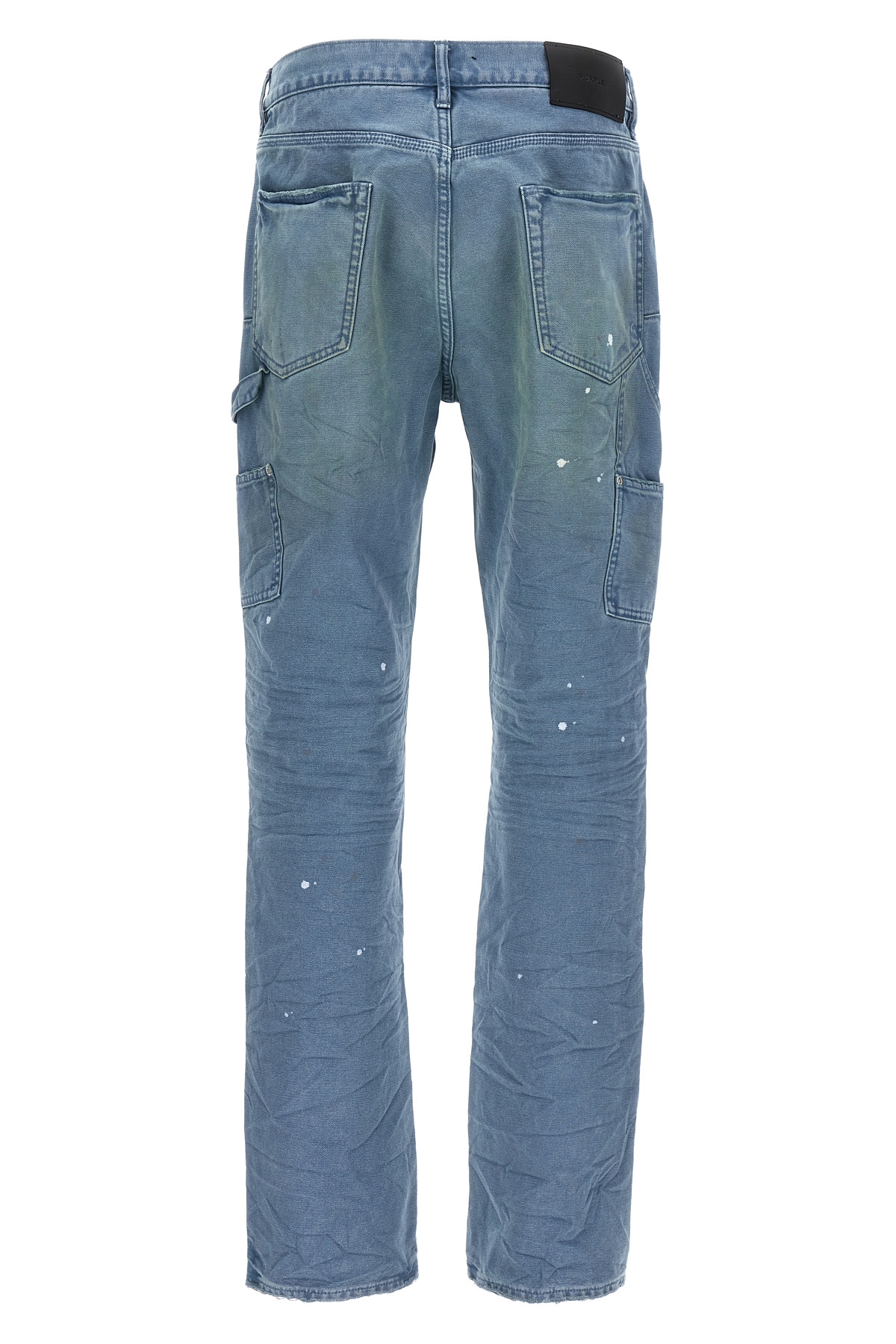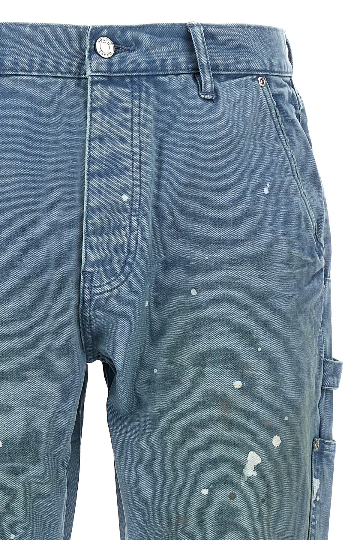 'P092 Copper Plate Carpenter' used-effect stonewashed cotton canvas pants with patent leather stains, button closure, pockets, wide leg, back logo tag.