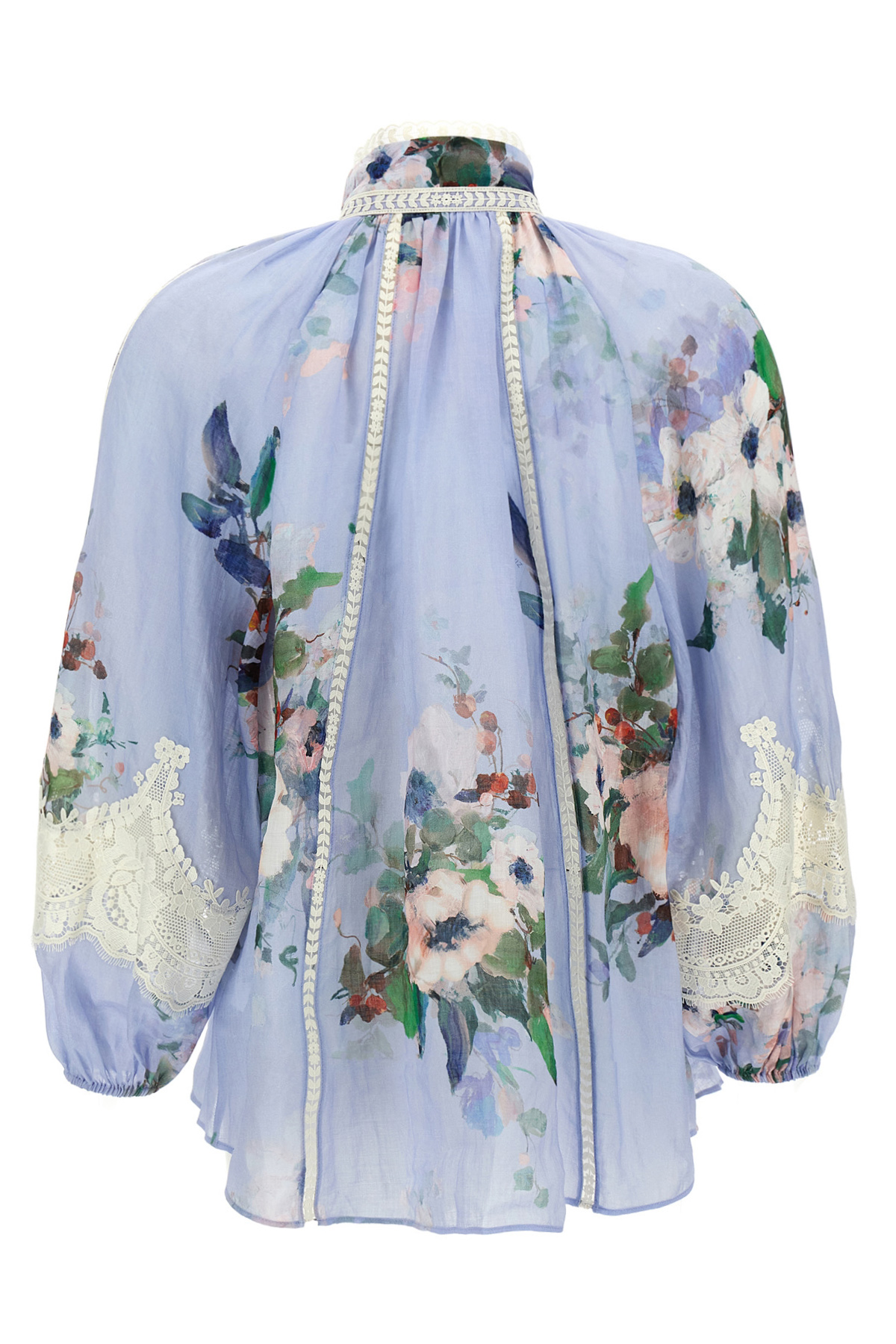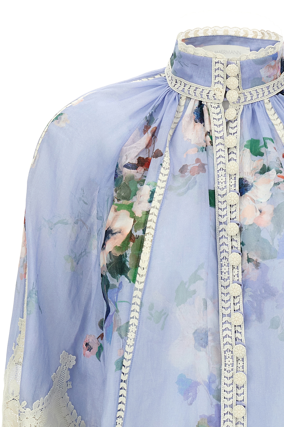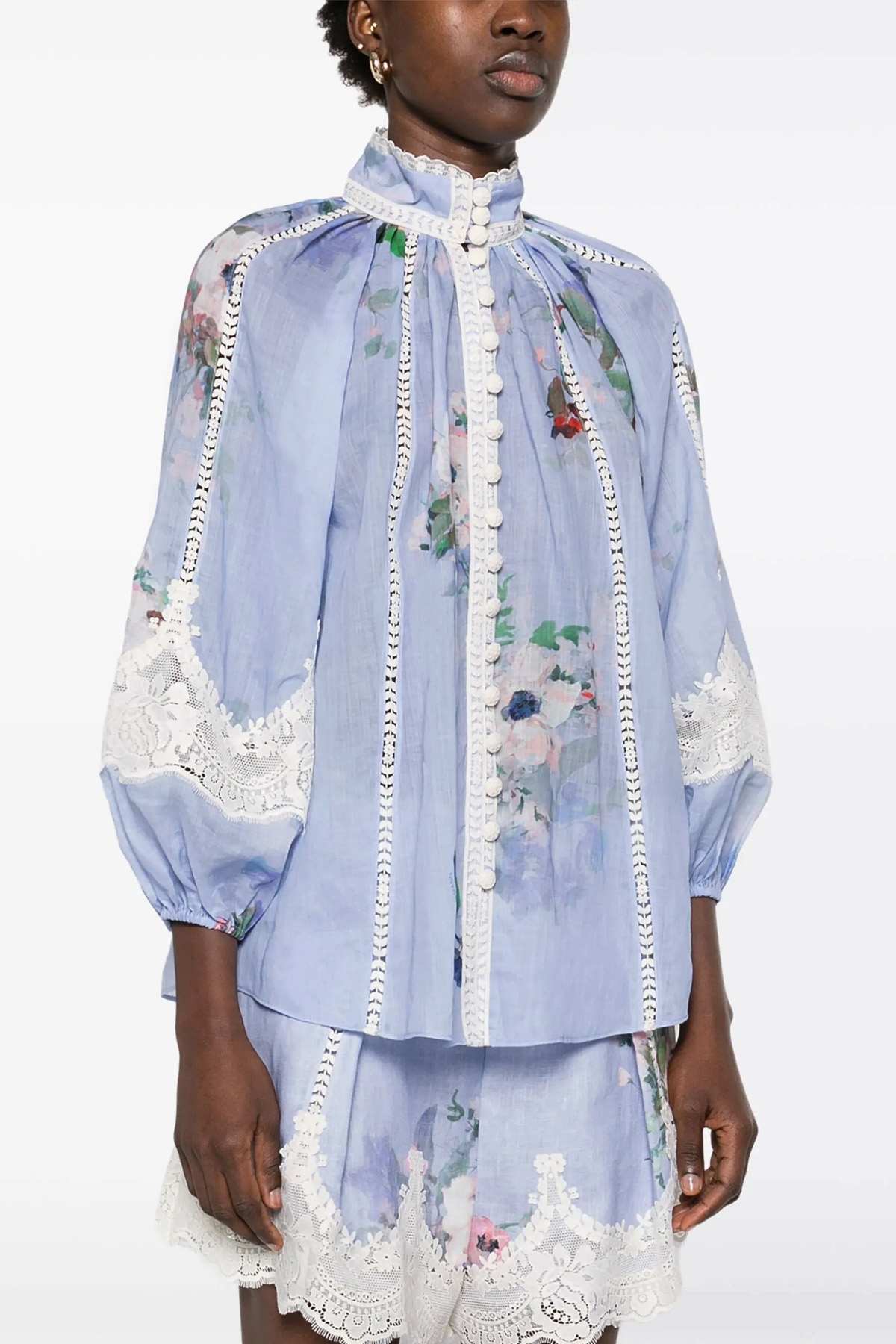 'Everley Lace Trim' ramie blouse with lace inserts, high neck, button closure, long wide sleeves with elastic cuffs, front curl.