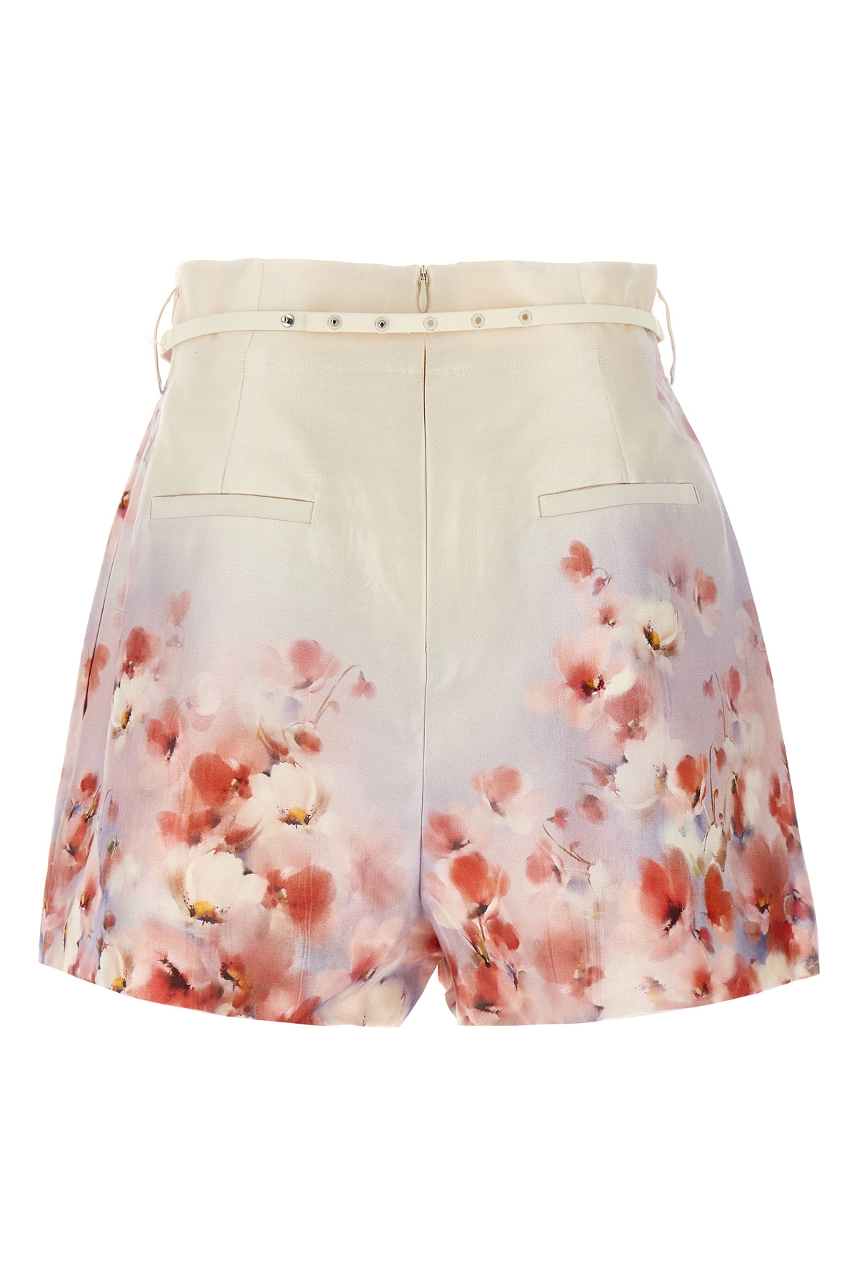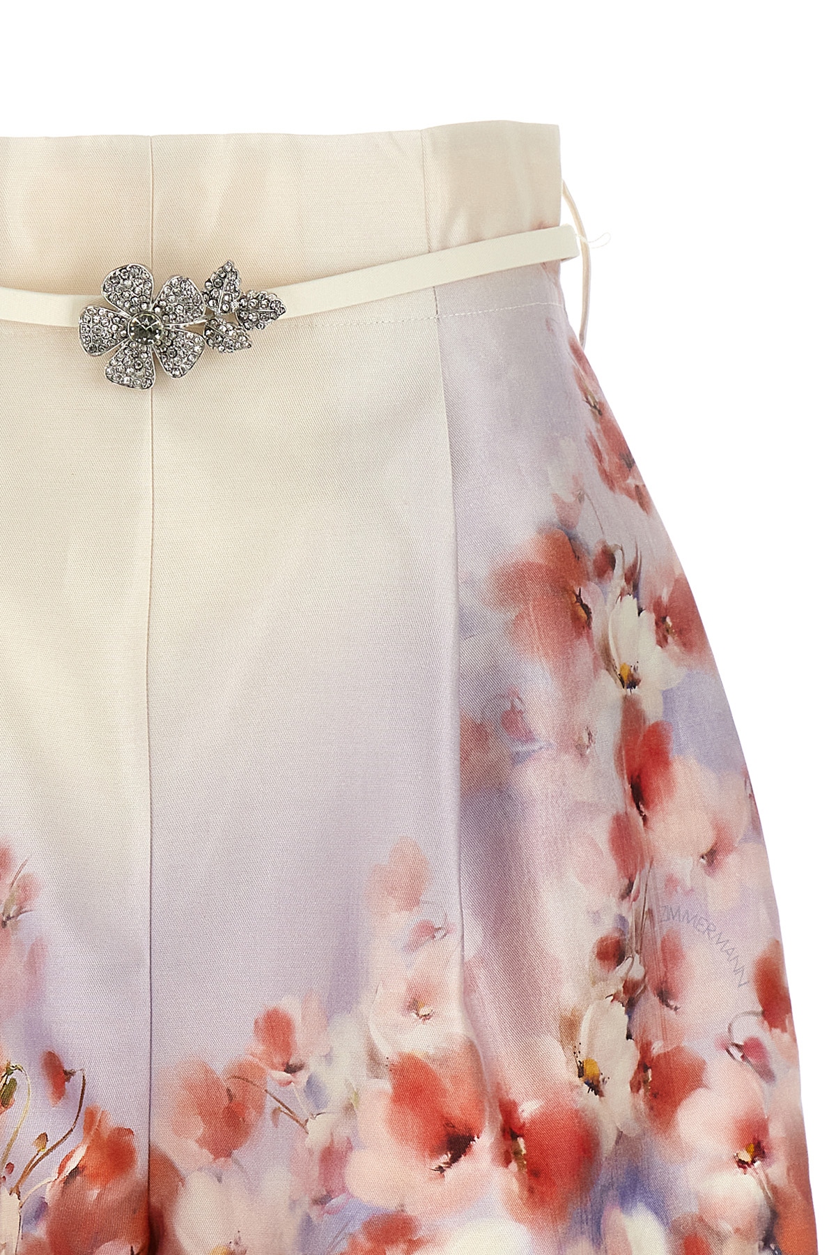 'Crush Flat Front' high waist shorts in silk and cotton blend with floral print, pockets, front pin tucks, back zip closure, adjustable and removable jewel belt.