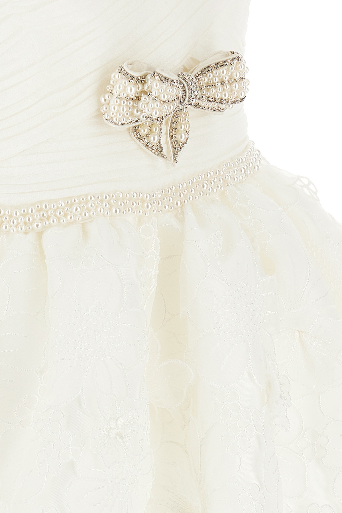 'White Organza Bow Mini' dress consisting of organza and crepe balloon skirt with floral decorations and curled corset top, off-the-shoulder style with removable front brooches with pearls and rhinestones, back zip closure, corset and inner shorts, adjustable and removable shoulder straps.