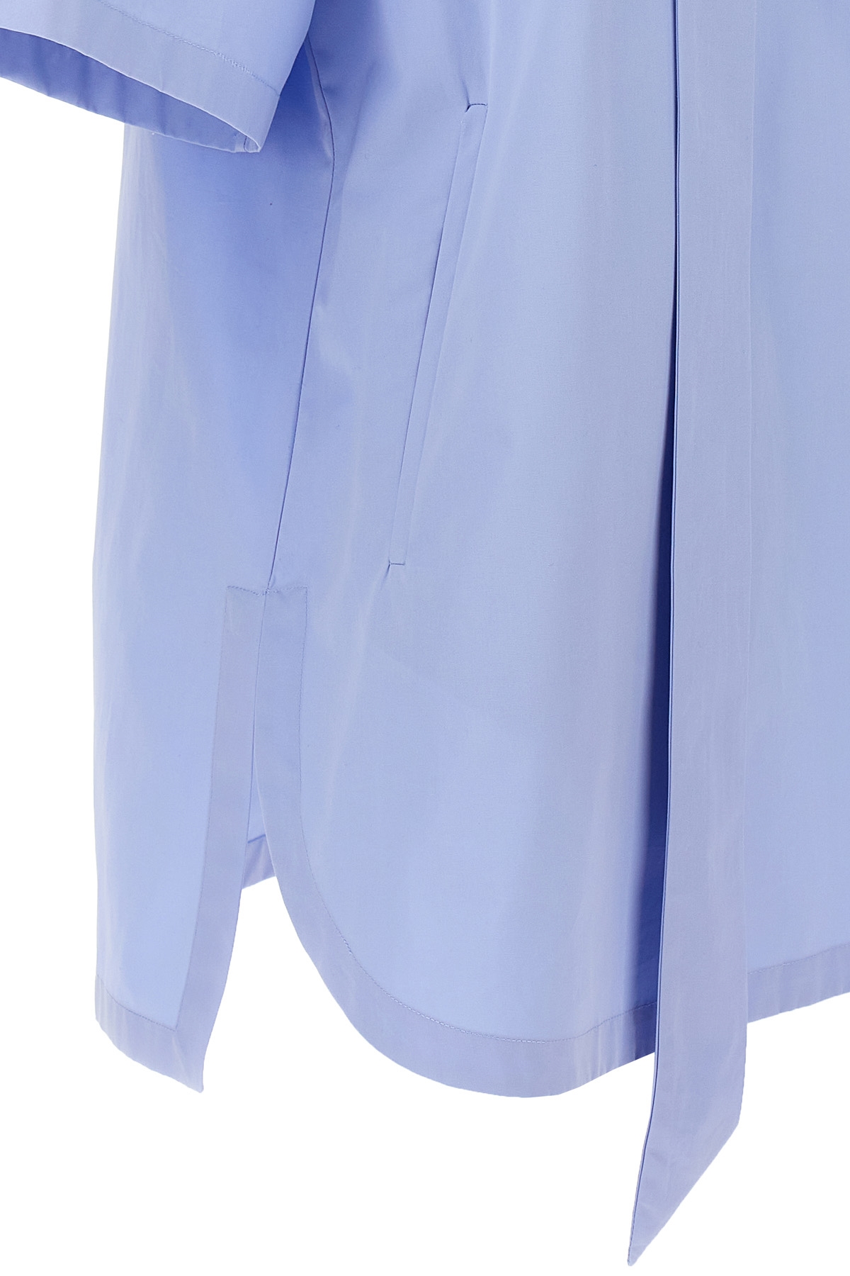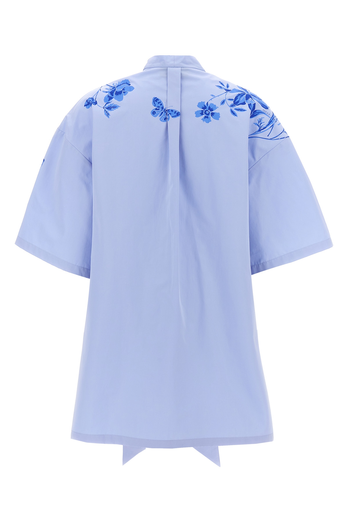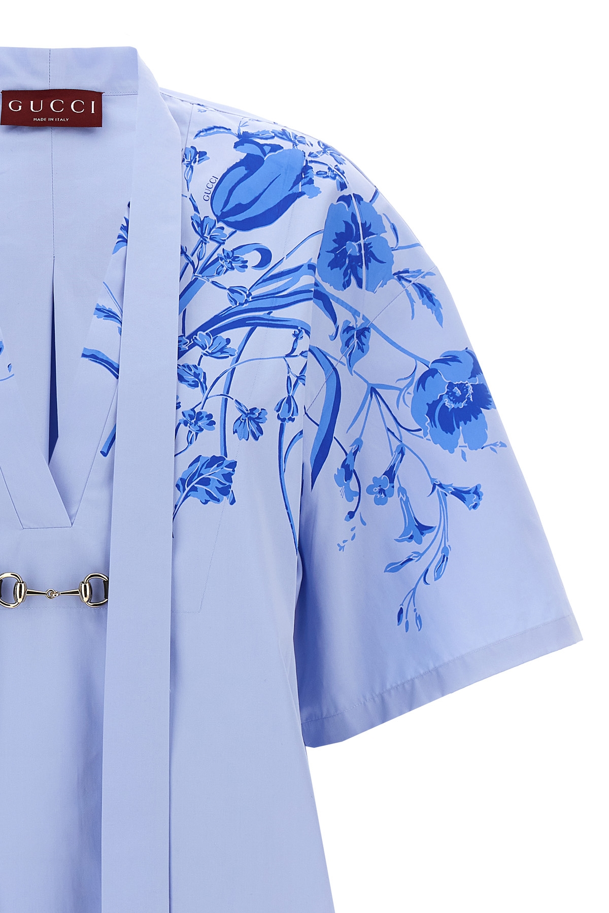 Cotton poplin dress with 'Fiori e Insetti Gucci' print, V-neck with metal clamp, sash at the neck, 3/4 sleeves.